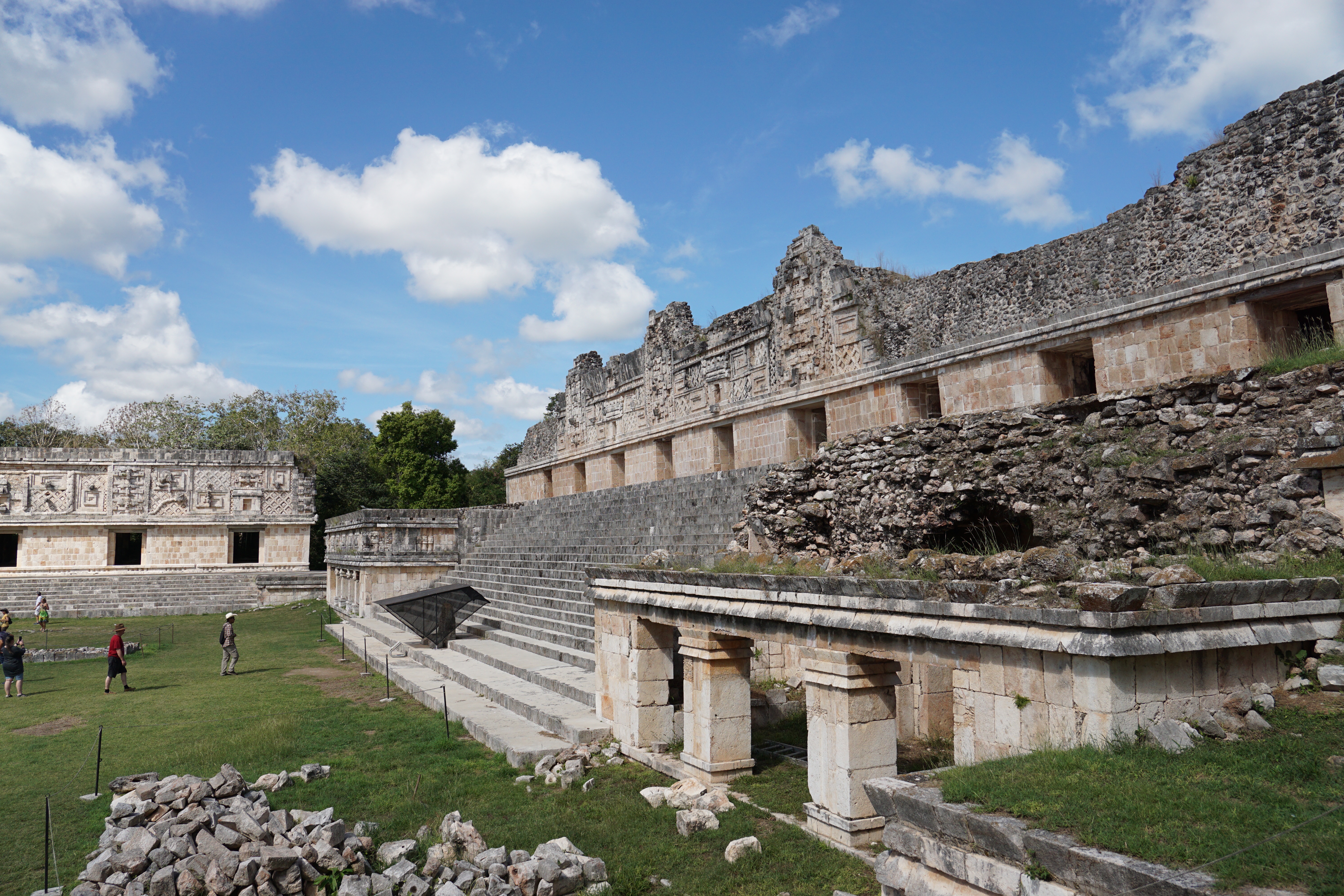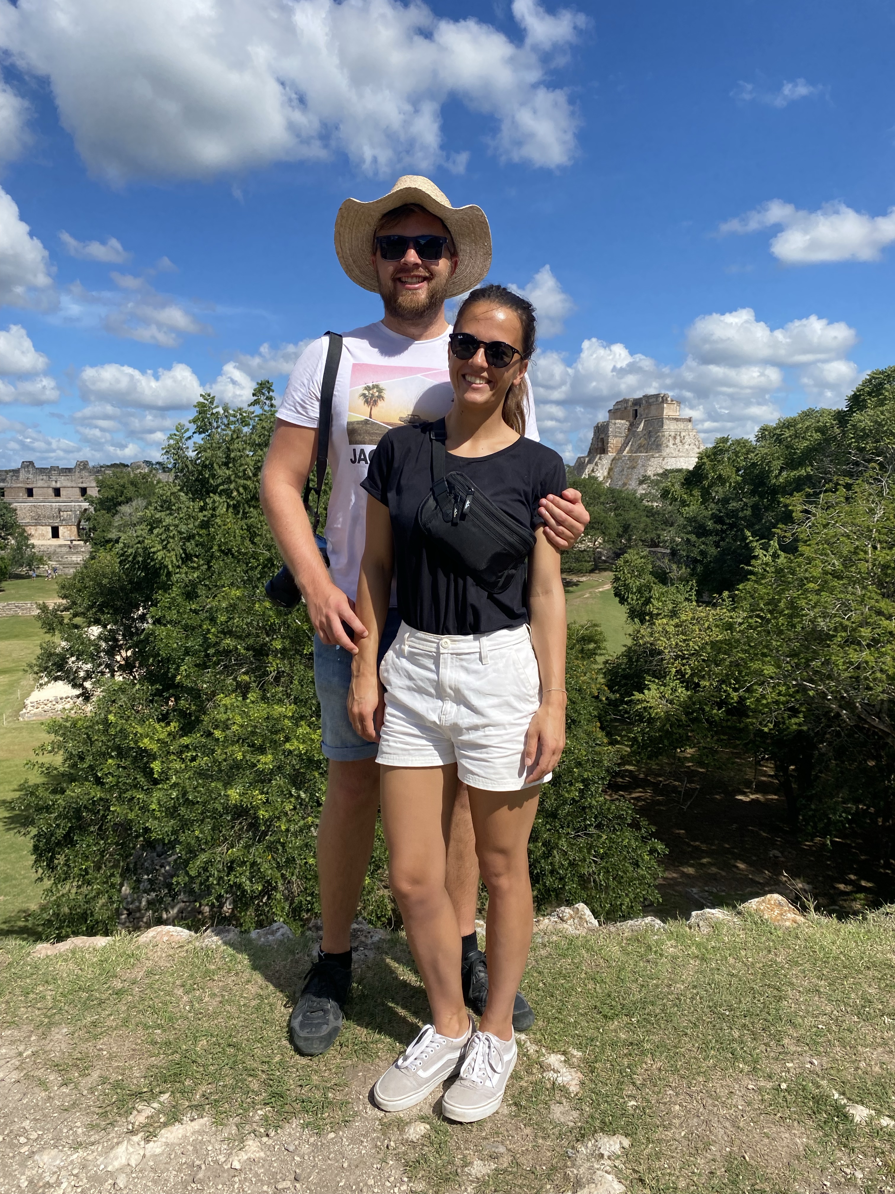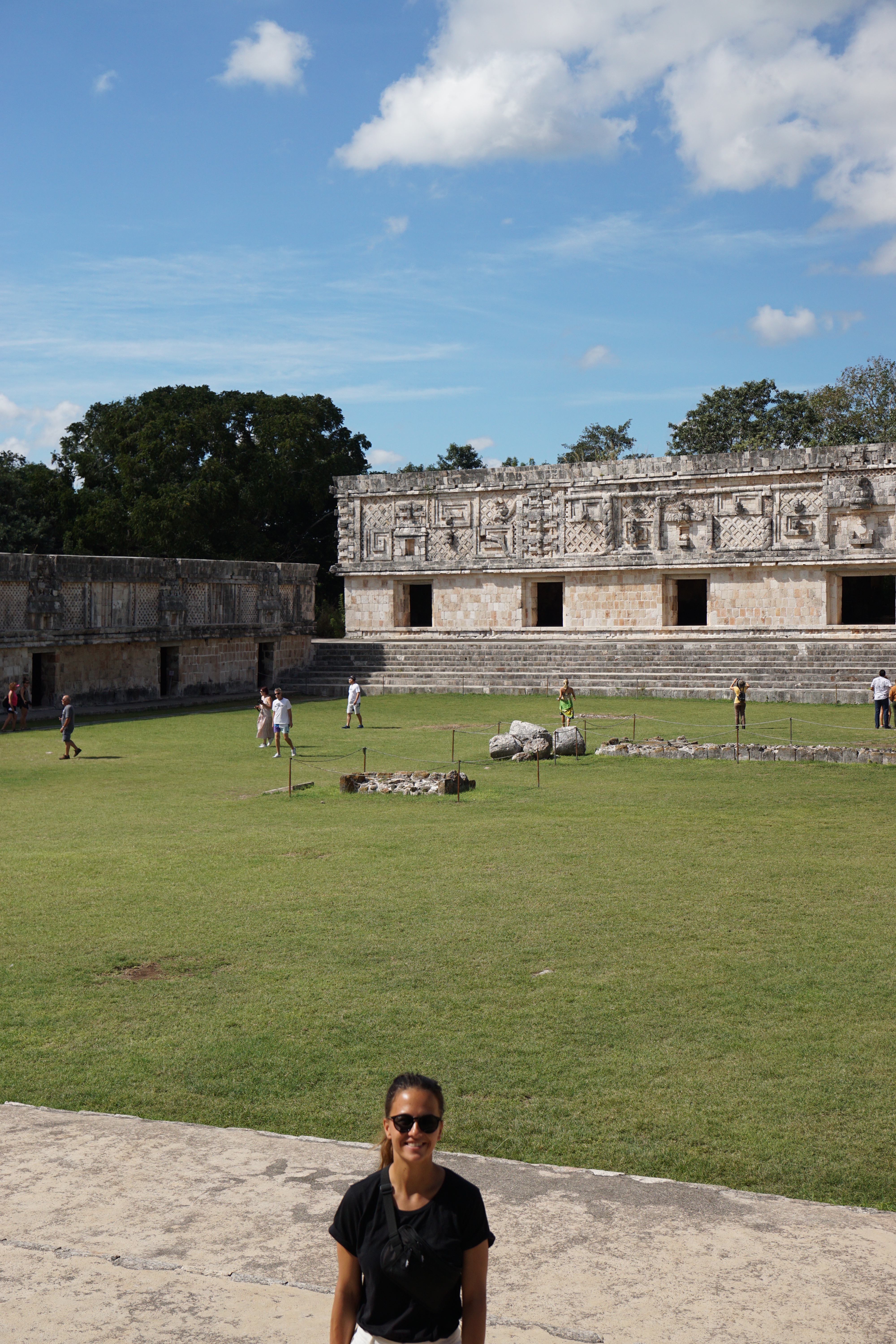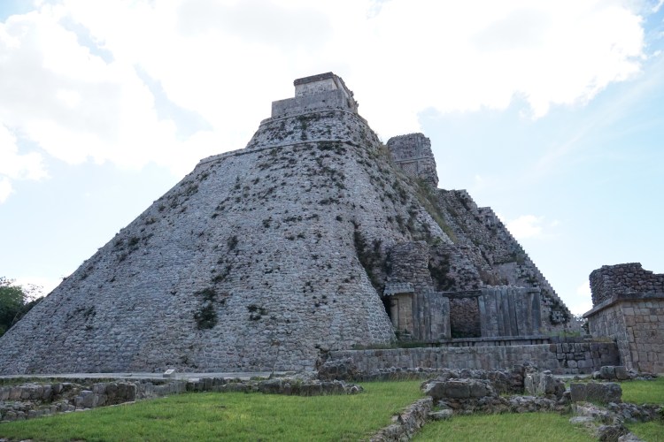 Nach dem entspannten Dienstag stand am Mittwoch wieder ein Ausflug an. Wir wollten eine der berühmten Pyramiden in Yucatan besuchen. Mit dem Bus fuhren wir entspannt vom ADO Busterminal nach Uxmal (10 € p.P Hin und Zurück). Leider gibt es nur recht wenige Busse, die von Mérida nach Uxmal fahren (9,12,15 Uhr) und auch nur einen bis zwei Busse, die wieder zurückfahren (15 und 17 Uhr). Daher ist man ungünstigerweise relativ beschränkt in der Buswahl. Wir nahmen also den Bus um 9 Uhr und waren 10:30 Uhr in Uxmal. Nach einem kurzen Fußweg kamen wir an den Pyramiden an. Der Eintrittspreis lag mit 25 € p.P. etwas höher als bei den anderen Pyramiden, die wir bisher besucht hatten. Die Anlage besteht aus zwei Pyramiden sowie einem Palast, dem sogenannten Nonnenkloster (von den Spaniern benannt) und einem Ballspielplatz. Die Anlage ist sehr gut erhalten und restauriert, weshalb man hier sehr einfach in das ursprüngliche Leben eintauchen kann. Vor allem die Vielfalt der Baustile und Verzierungen hat uns hier sehr gut gefallen. Wir liefen durch die Ruinen und die Teile, die rekonstruiert wurden und staunten immer wieder über die schönen Steinkunstwerke, die in die Gebäude verarbeitet wurden. Durch die grünen Wiesen, in Kombination mit der Sonne und dem blauen Himmel, sehen solche Stätten natürlich immer besonders toll aus. Wir entdeckten auch, dass einige Teile der Anlage nicht begehbar waren, da dort noch aktive Ausgrabungen und Rekonstruktionen stattfinden. Es ist immer wieder beeindruckend, was für Monumente vor vielen Hundert Jahren errichtet worden.