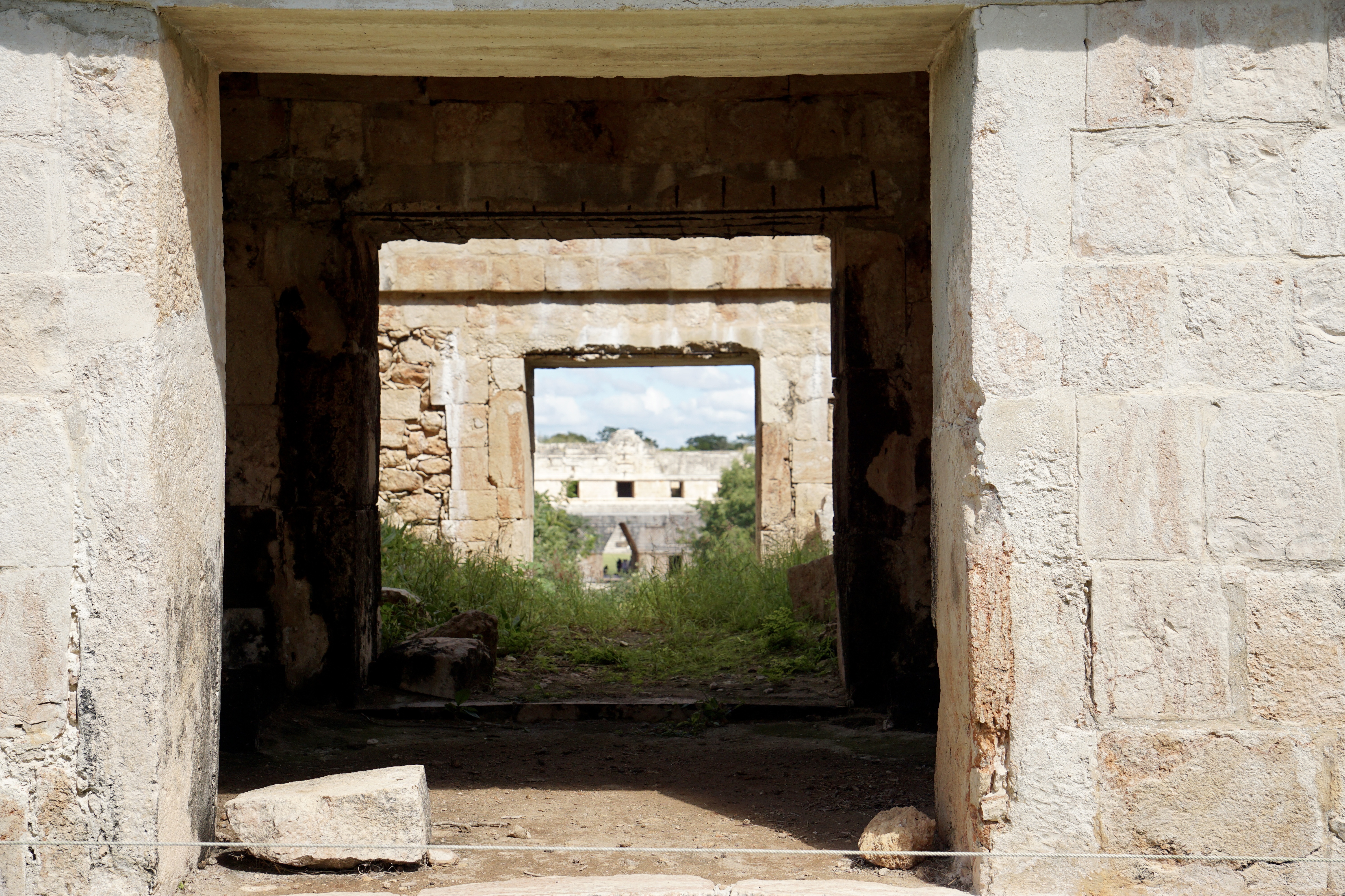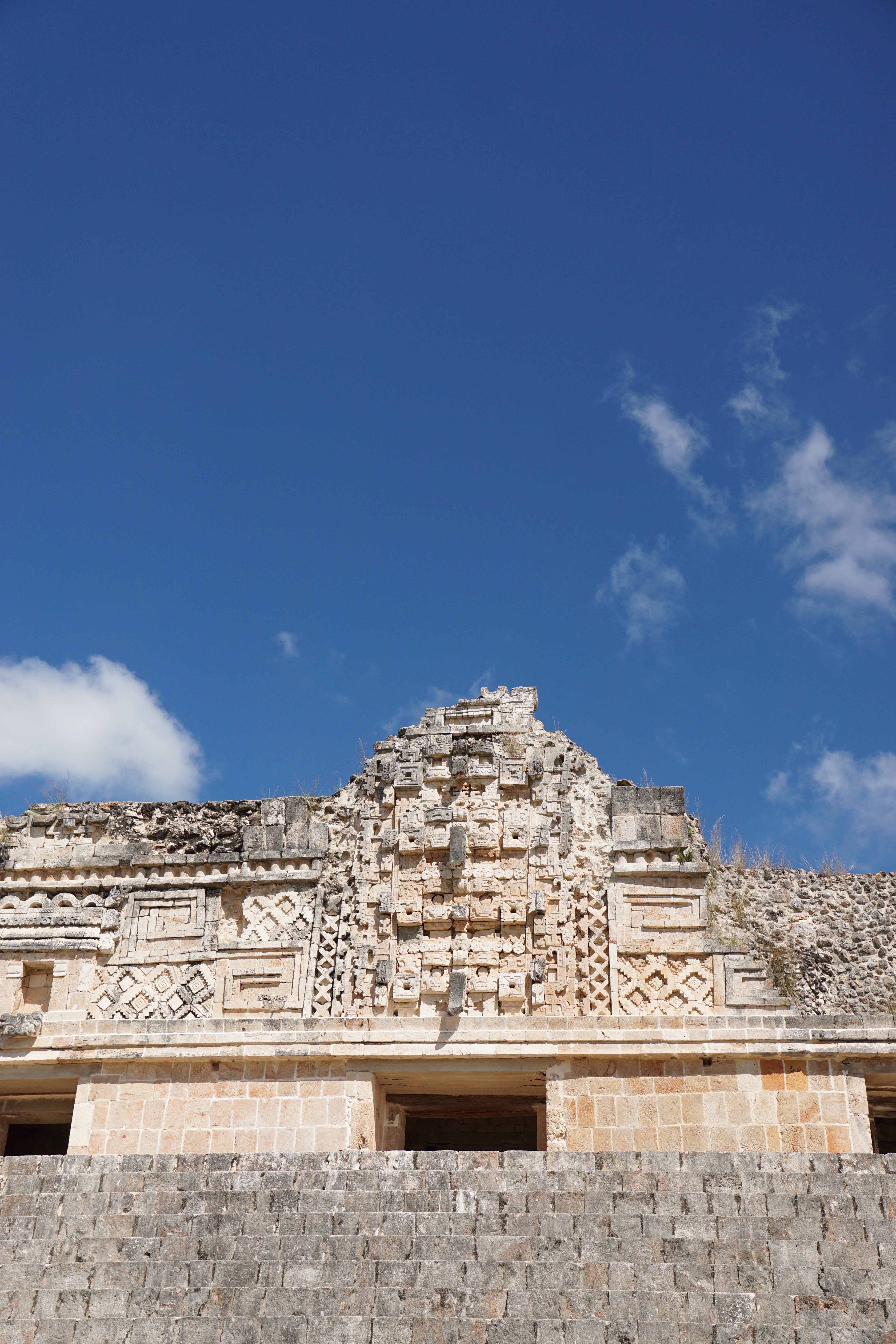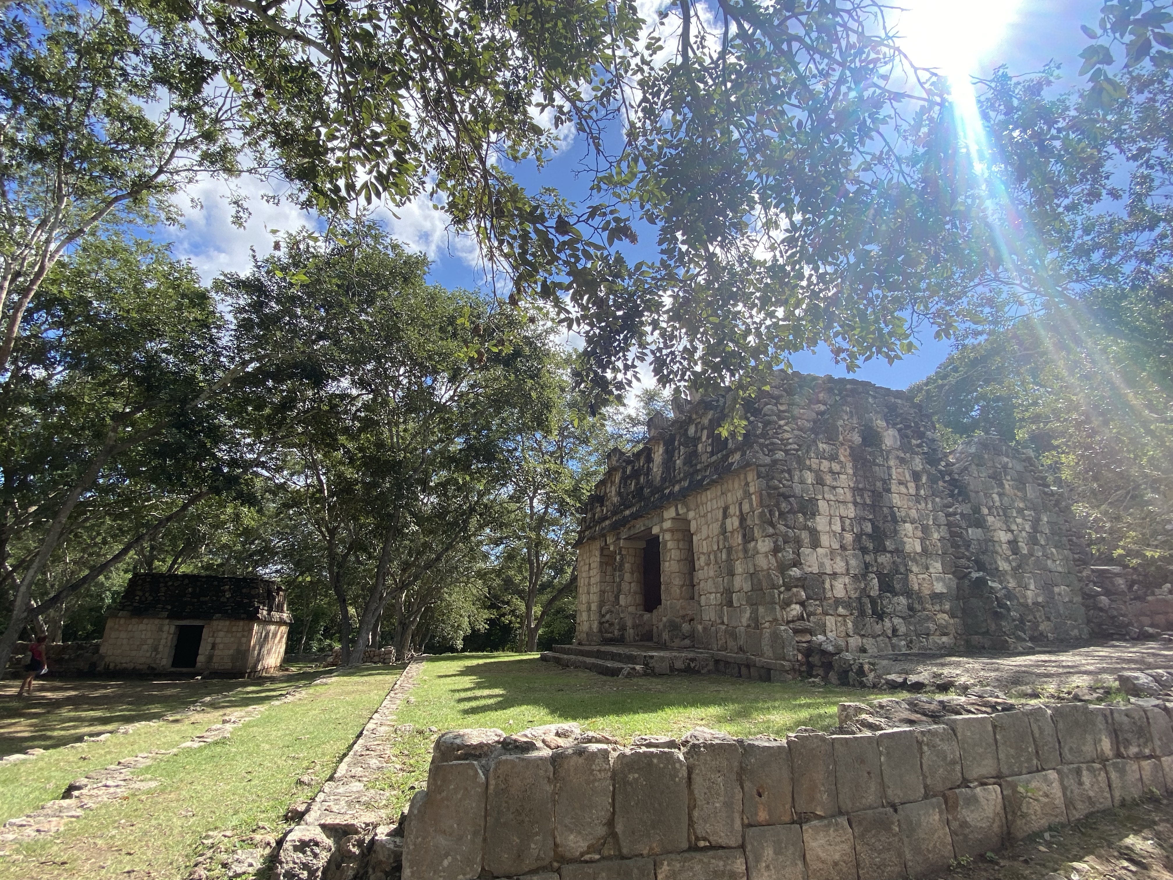 Nach dem entspannten Dienstag stand am Mittwoch wieder ein Ausflug an. Wir wollten eine der berühmten Pyramiden in Yucatan besuchen. Mit dem Bus fuhren wir entspannt vom ADO Busterminal nach Uxmal (10 € p.P Hin und Zurück). Leider gibt es nur recht wenige Busse, die von Mérida nach Uxmal fahren (9,12,15 Uhr) und auch nur einen bis zwei Busse, die wieder zurückfahren (15 und 17 Uhr). Daher ist man ungünstigerweise relativ beschränkt in der Buswahl. Wir nahmen also den Bus um 9 Uhr und waren 10:30 Uhr in Uxmal. Nach einem kurzen Fußweg kamen wir an den Pyramiden an. Der Eintrittspreis lag mit 25 € p.P. etwas höher als bei den anderen Pyramiden, die wir bisher besucht hatten. Die Anlage besteht aus zwei Pyramiden sowie einem Palast, dem sogenannten Nonnenkloster (von den Spaniern benannt) und einem Ballspielplatz. Die Anlage ist sehr gut erhalten und restauriert, weshalb man hier sehr einfach in das ursprüngliche Leben eintauchen kann. Vor allem die Vielfalt der Baustile und Verzierungen hat uns hier sehr gut gefallen. Wir liefen durch die Ruinen und die Teile, die rekonstruiert wurden und staunten immer wieder über die schönen Steinkunstwerke, die in die Gebäude verarbeitet wurden. Durch die grünen Wiesen, in Kombination mit der Sonne und dem blauen Himmel, sehen solche Stätten natürlich immer besonders toll aus. Wir entdeckten auch, dass einige Teile der Anlage nicht begehbar waren, da dort noch aktive Ausgrabungen und Rekonstruktionen stattfinden. Es ist immer wieder beeindruckend, was für Monumente vor vielen Hundert Jahren errichtet worden.