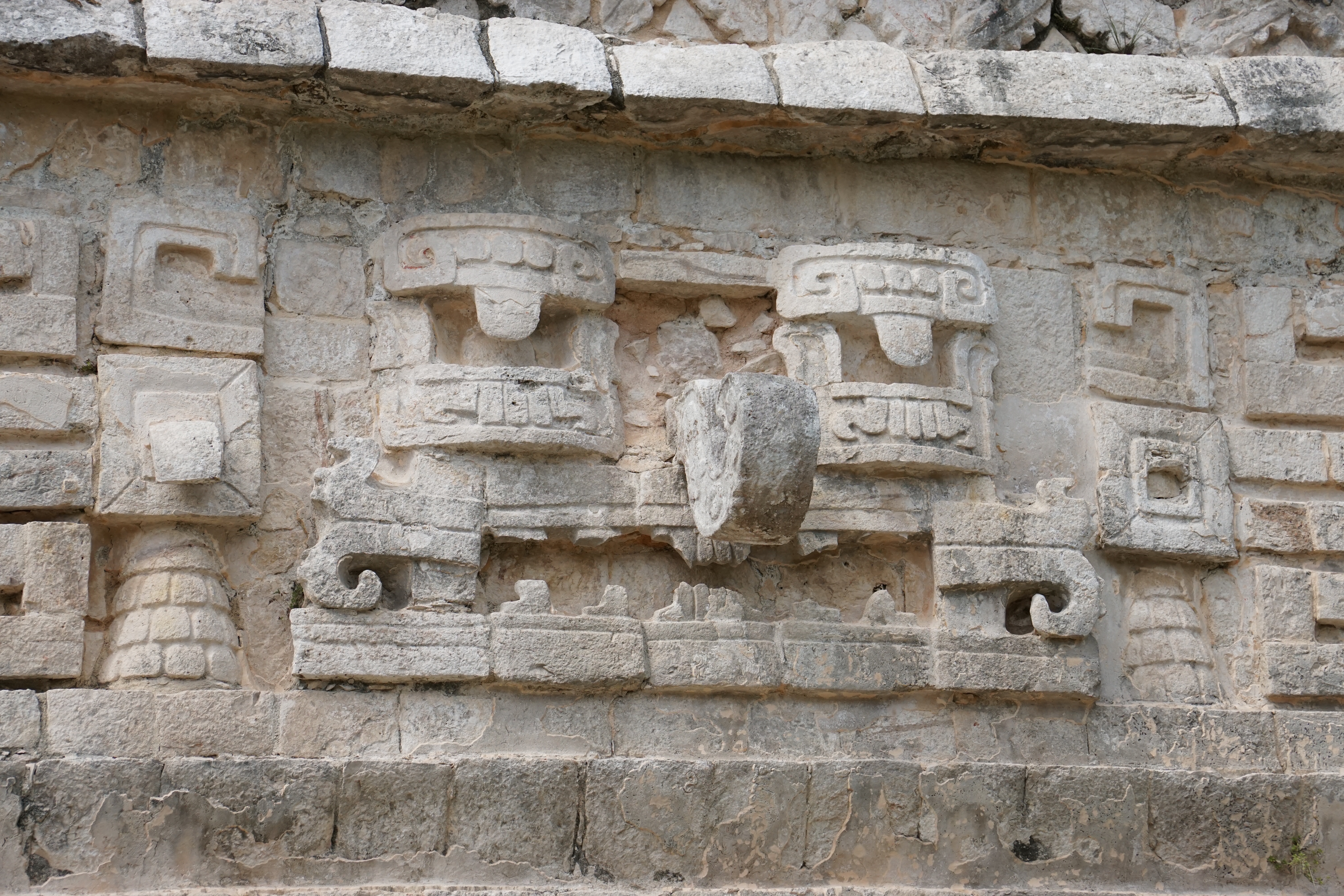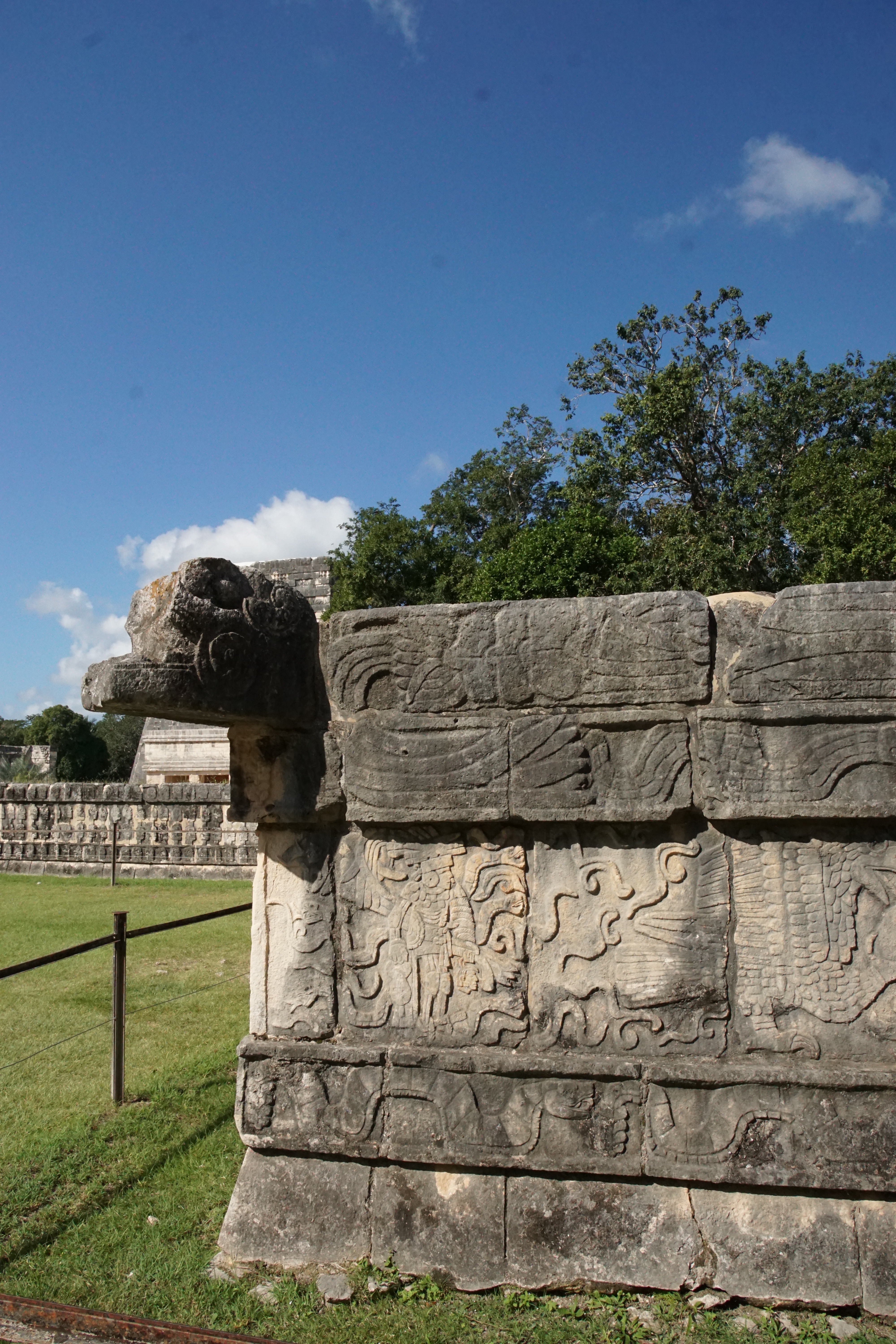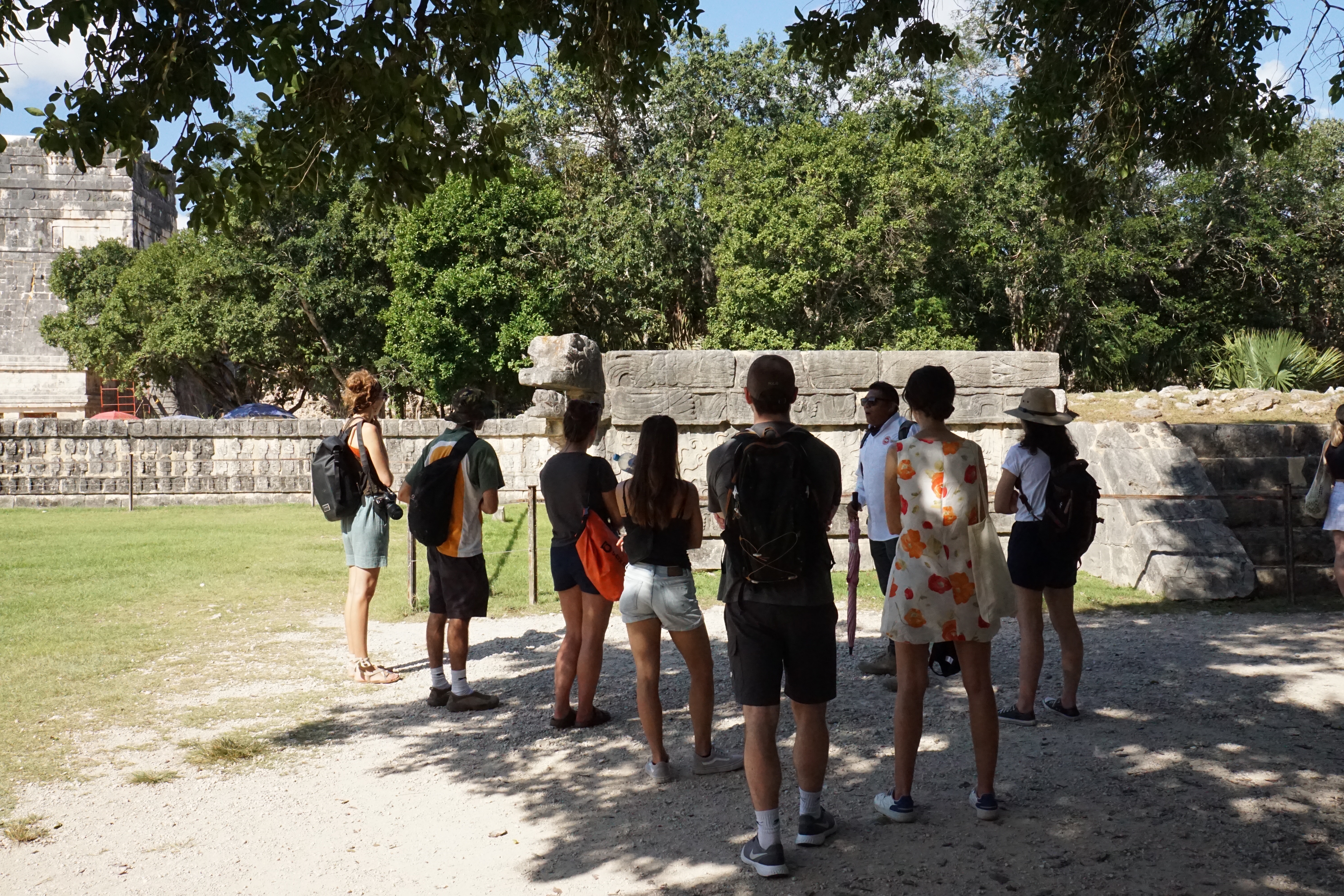 Doch am meisten erstaunt waren wir über die Bauweise in Bezug auf die Akustik. Generell ist die Pyramide, sowie eine nahegelegene Anlage so gebaut, dass sie die Akustik perfekt wiedergibt, ein Echo entsteht und Töne sogar noch verstärkt werden. Dies nutzten die Herrscher bei ihren Ansprachen vor dem Volk. Megafon oder Mikrofon gab es schließlich noch nicht. Wenn man klatschte oder etwas laut rief, wurde es mit einem lauten Echo zurückgeworfen. Doch eine Seite der Pyramide war besonders, wenn man hier in die Hände klatschte, wurde auch ein Sound zurückgeworfen. Allerdings hörte man das Geräusch eines einheimischen, und bei den Maya heiligen, Vogels. Dies funktionierte nur auf einer Seite, dafür aber auch immer und der Klang war sehr deutlich. Das war wirklich zutiefst beeindruckend, dass solche Besonderheiten in diesen Bau eingeflossen sind. Im Anschluss ging es noch zu einem Teil der Anlage, wo früher ein Ballspiel gespielt wurde. Die Wände waren mit interessanten Bildern, die in den Stein gehauen wurden, geschmückt. So eine Arena für den gleichen Sport hatten wir bereits in Uxmal gesehen. Allerdings erfuhren wir, dass mit diesem Spiel zum Teil auch die Menschenopfer ausgewählt wurden. Ganz sicher ist man nicht, wie die Regeln waren, oder wer dann geopfert wurde, ob Gewinner oder Verlierer. Nach anderthalb Stunden endete die Tour und wir erkundeten auf eigene Faust die restlichen Teile der Stätte und gingen auch nochmal zu den besonders interessanten Orten.