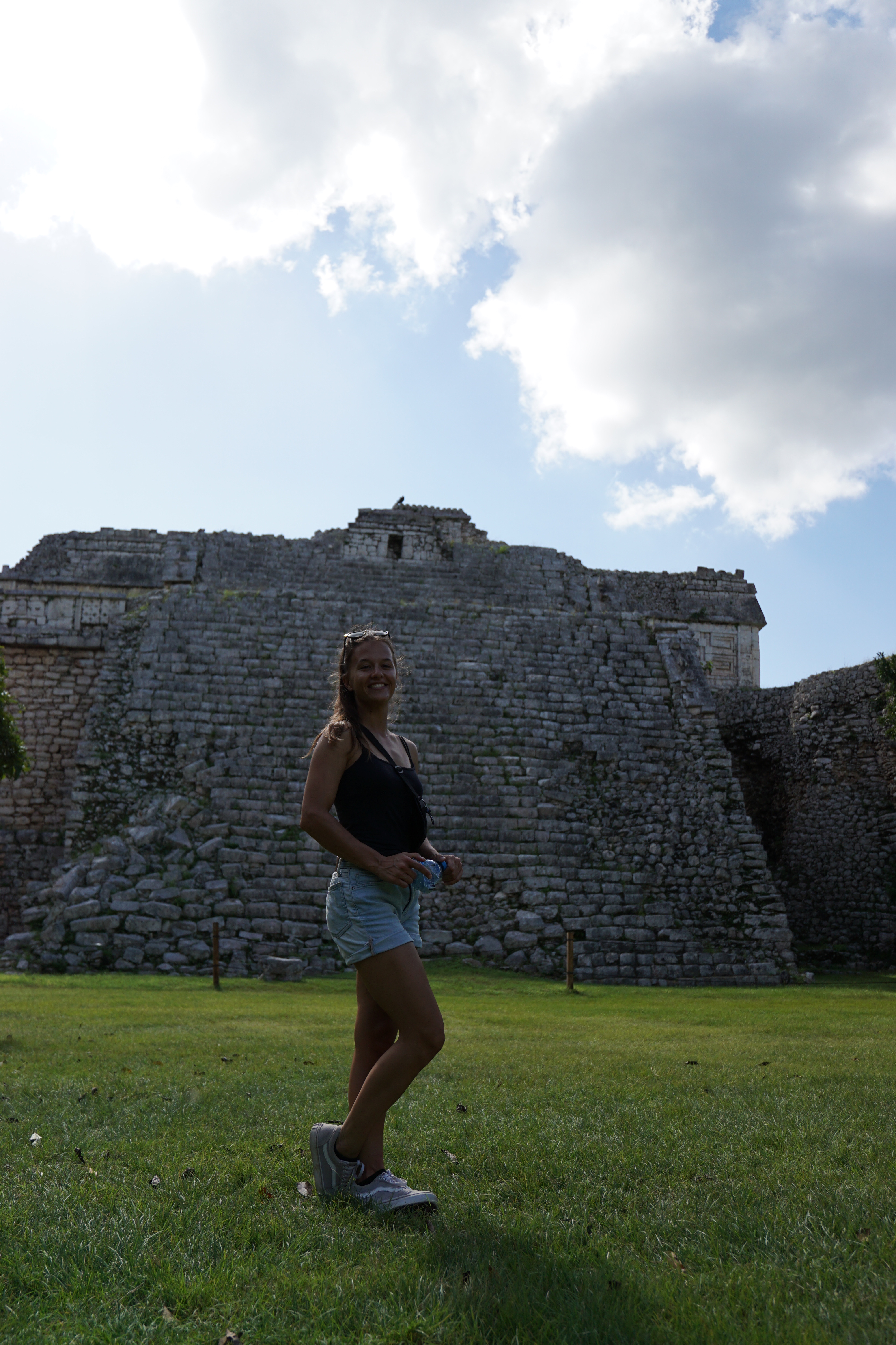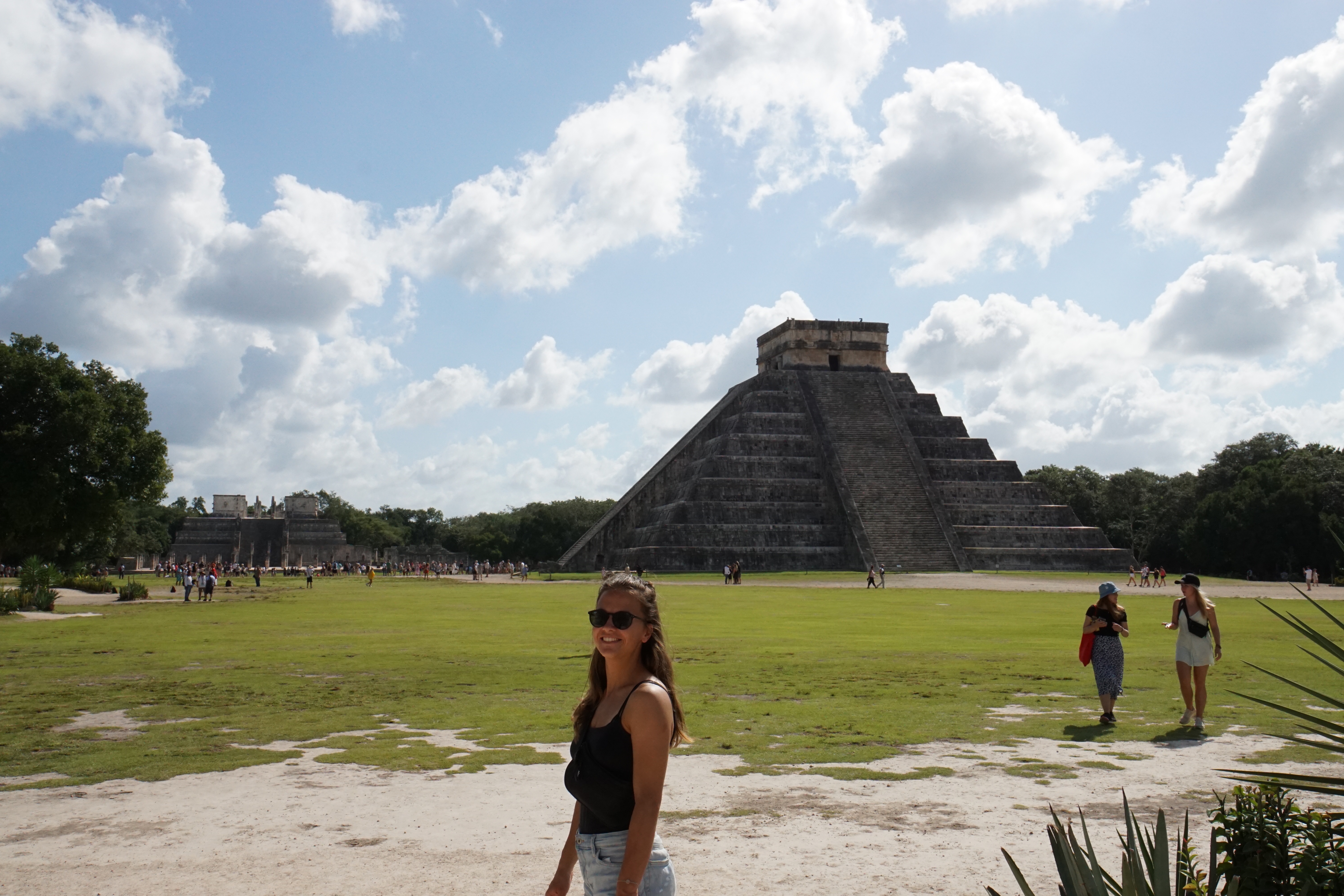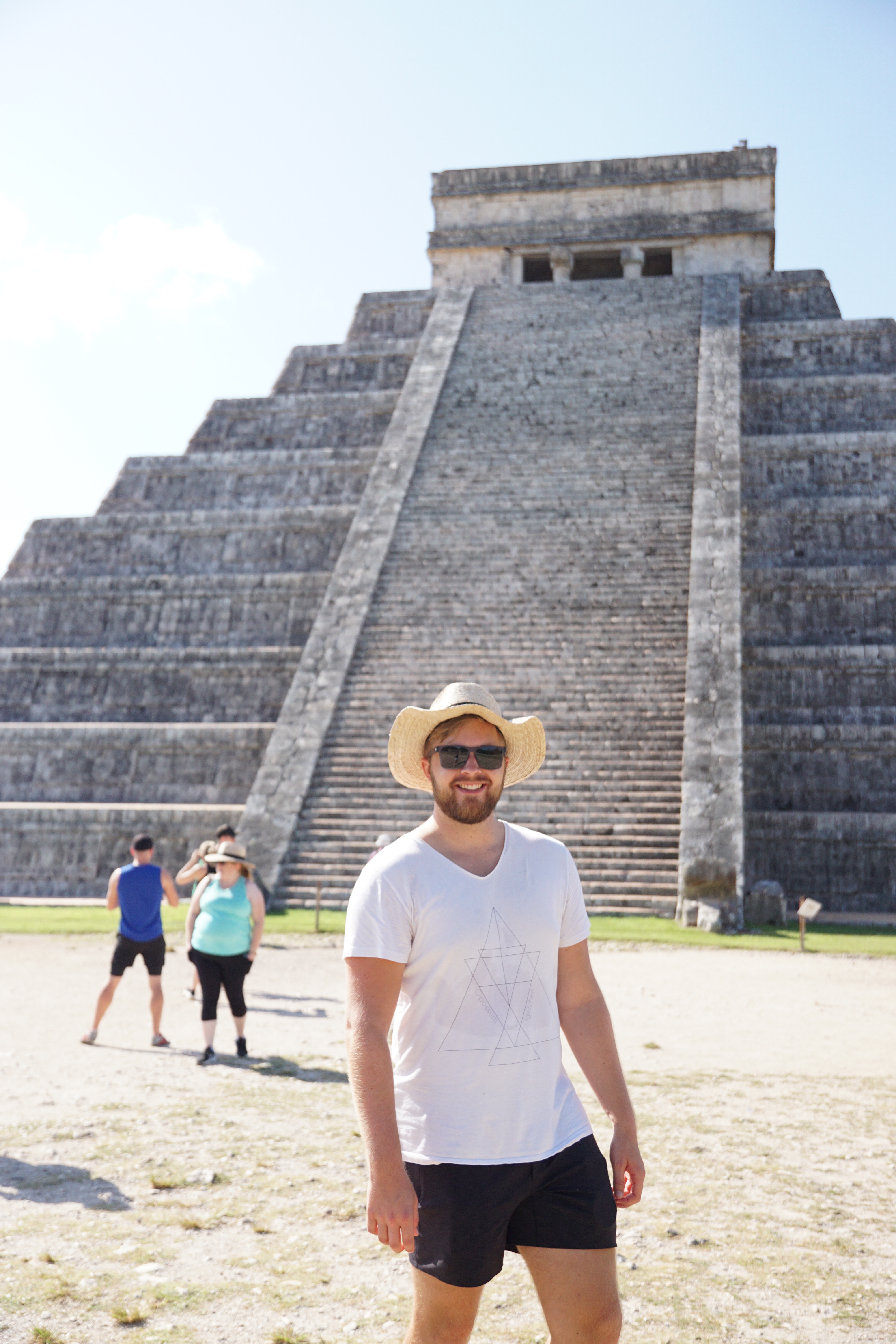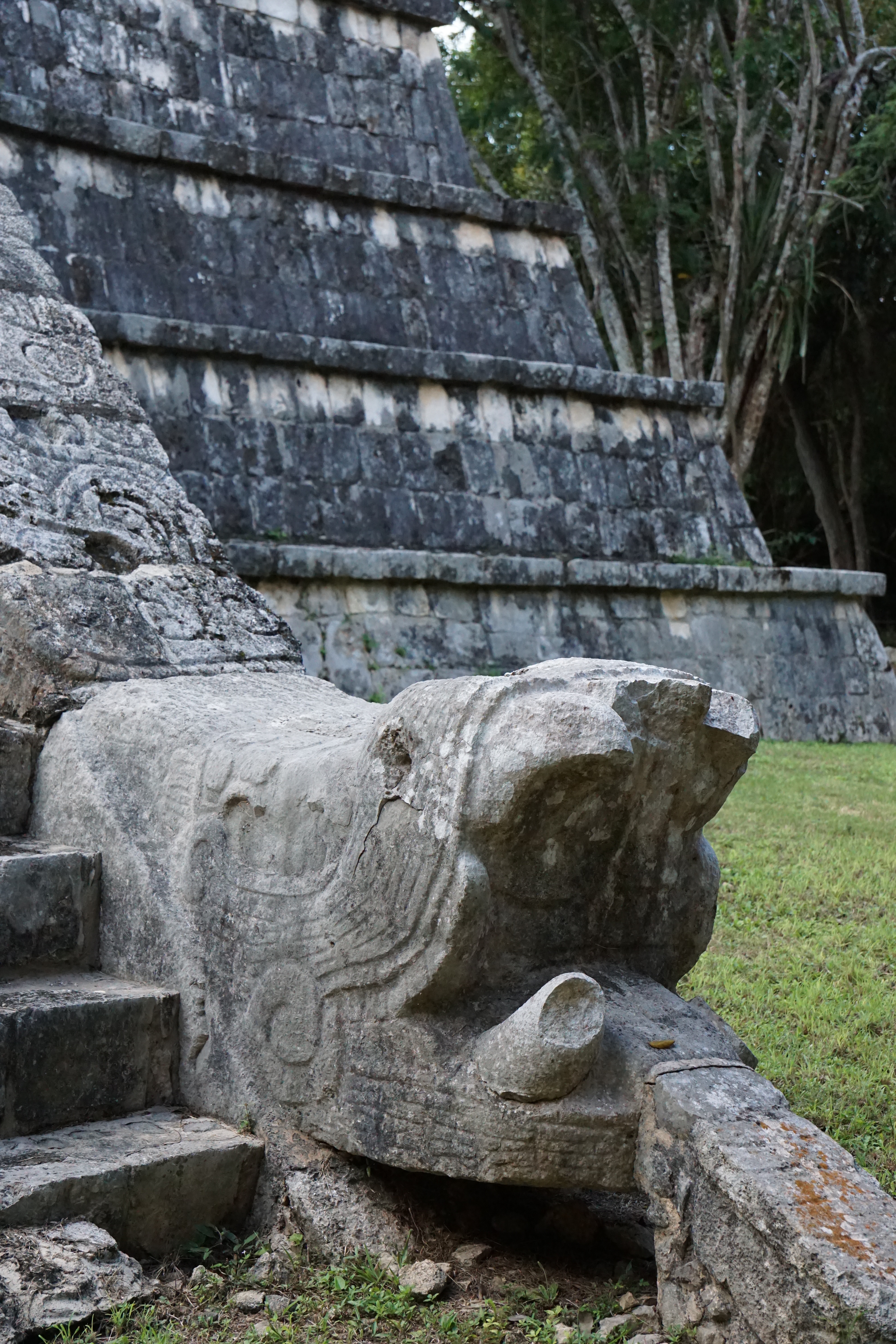 Wir liefen weiter und standen endlich vor der großen Pyramide. Die Fakten und Geschichten, die er uns dazu erzählte waren wirklich spannend und man wäre ohne Guide definitiv nicht darauf gekommen. Beispielsweise spiegelt sich der Maya-Kalender komplett in der Pyramide wider. Es gibt unter anderem 91 Stufen, an jeweils vier Seiten, die mit der letzten gemeinsamen Stufe zur oberen Plattform zusammen, 365 ergibt. Jede Seite steht für eine Jahreszeit. Dass die Maya sehr präzise mit ihren Kalendern waren, auch wenn diese sich leicht von dem heutigen differenziert, war uns bewusst, dass sie aber den Kalender komplett in die Pyramide eingebaut haben, hätten wir nicht gedacht. Zusätzlich zu den Stufen gibt es noch diverse weitere Merkmale, die beispielsweise die Monate darstellen. Zusätzlich sind die Treppen mit riesigen Schlangen verziert. Im Gegensatz zum Christentum, welches die Spanier später einführten, war die Schlange bei den Maya heilig und ein positives Zeichen. Die Pyramide ist nicht mit den Seiten in die Himmelsrichtungen ausgerichtet, da sie so angelegt wurde, dass zweimal im Jahr die Sonne so steht, dass die Schlangen durch die Schatten besonders markant sind. Zusätzlich liegt eine Seite komplett im Schatten, während die andere Seite perfekt in der Sonne ist. Diese Tage markieren die Zeitpunkte zum aussähen beziehungsweise ernten der Felder. Die Pyramide diente nämlich auch als landwirtschaftlicher Kalender.