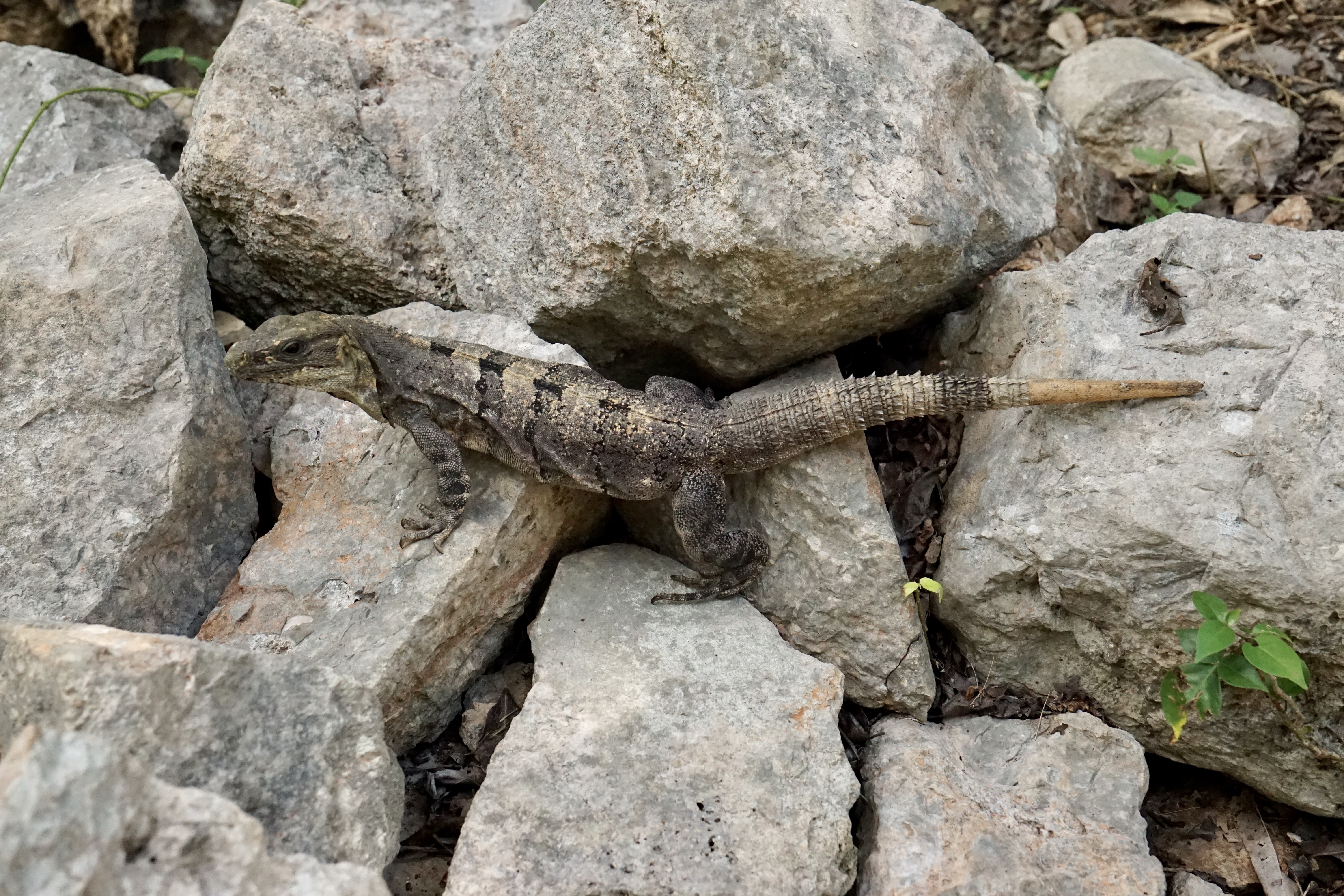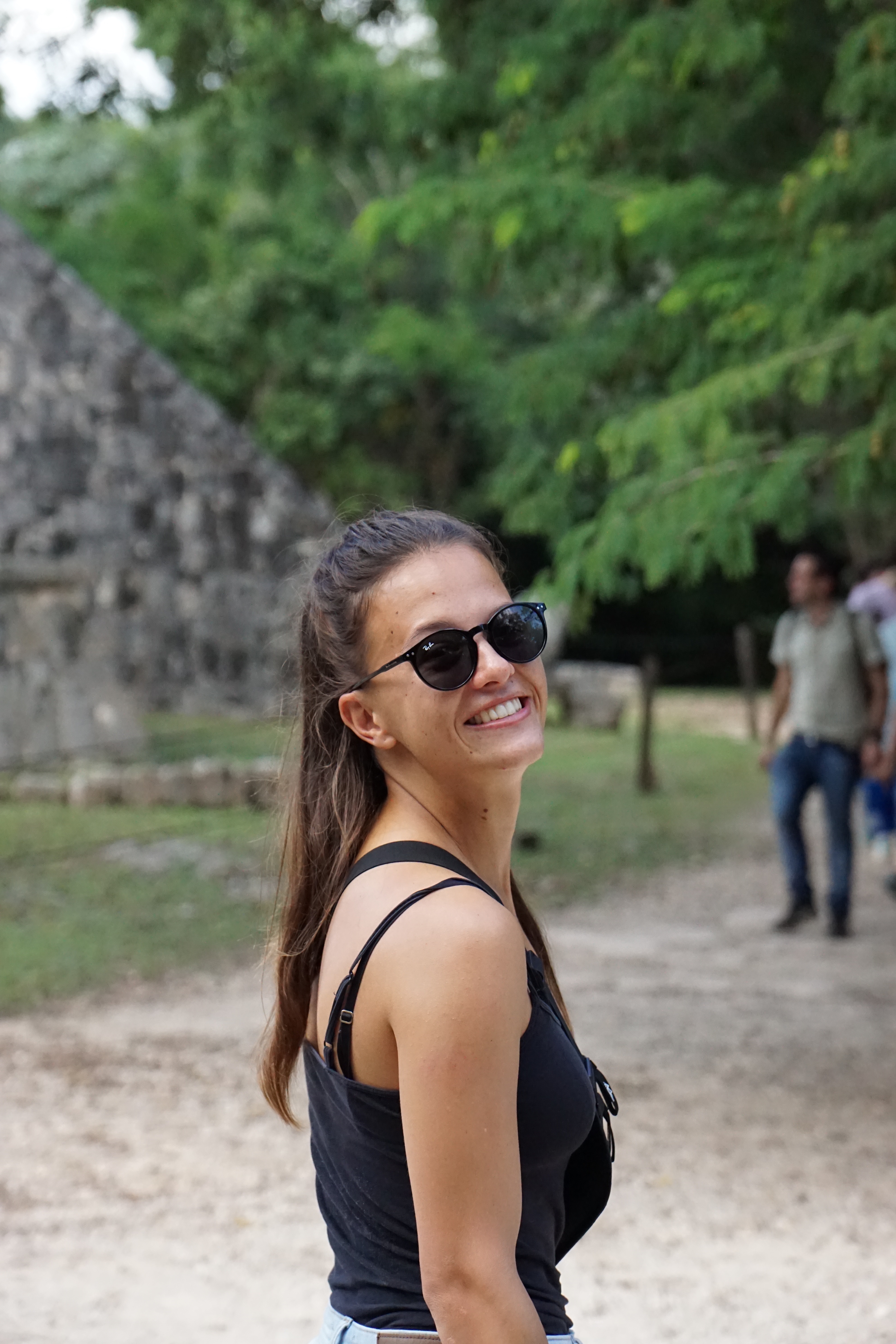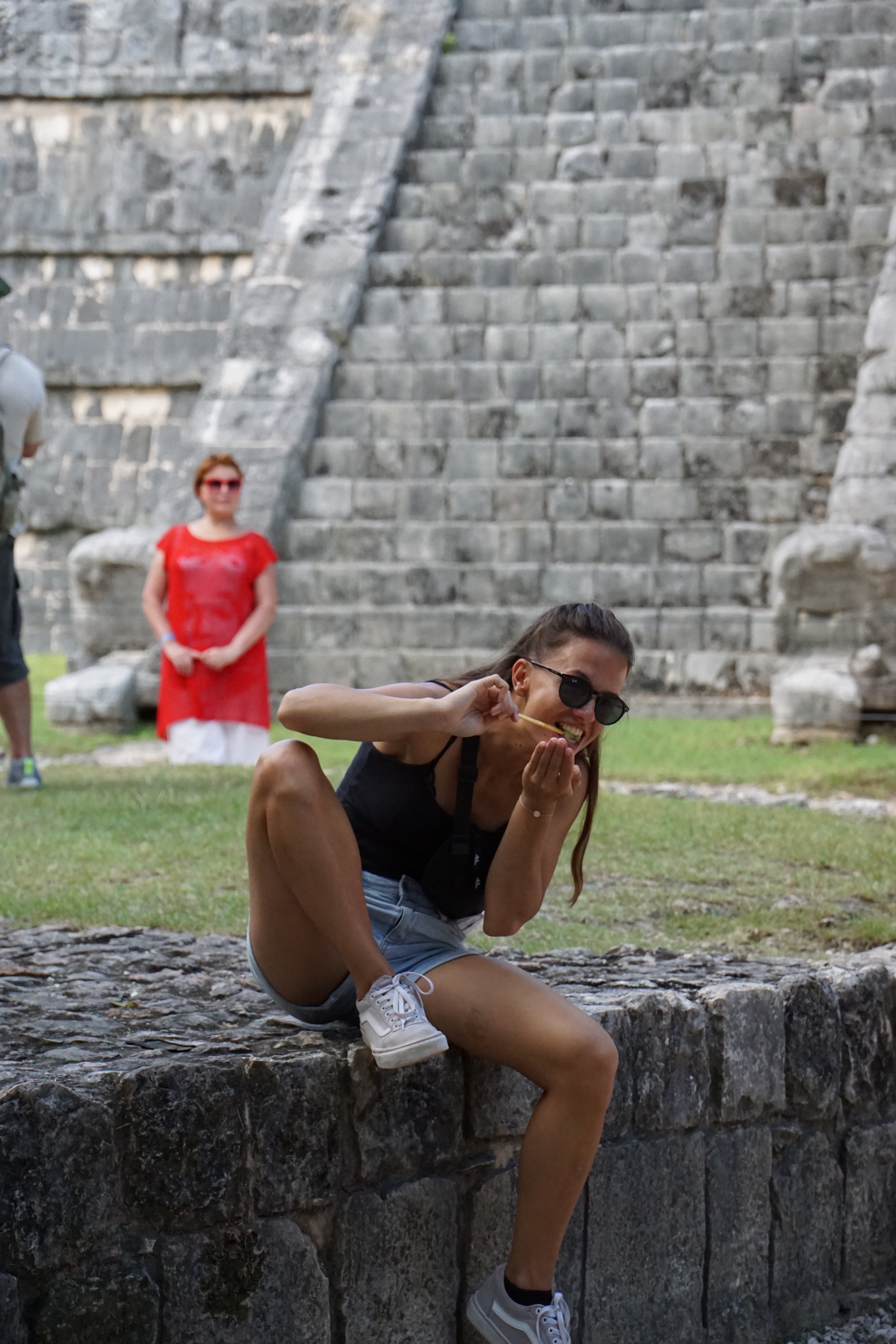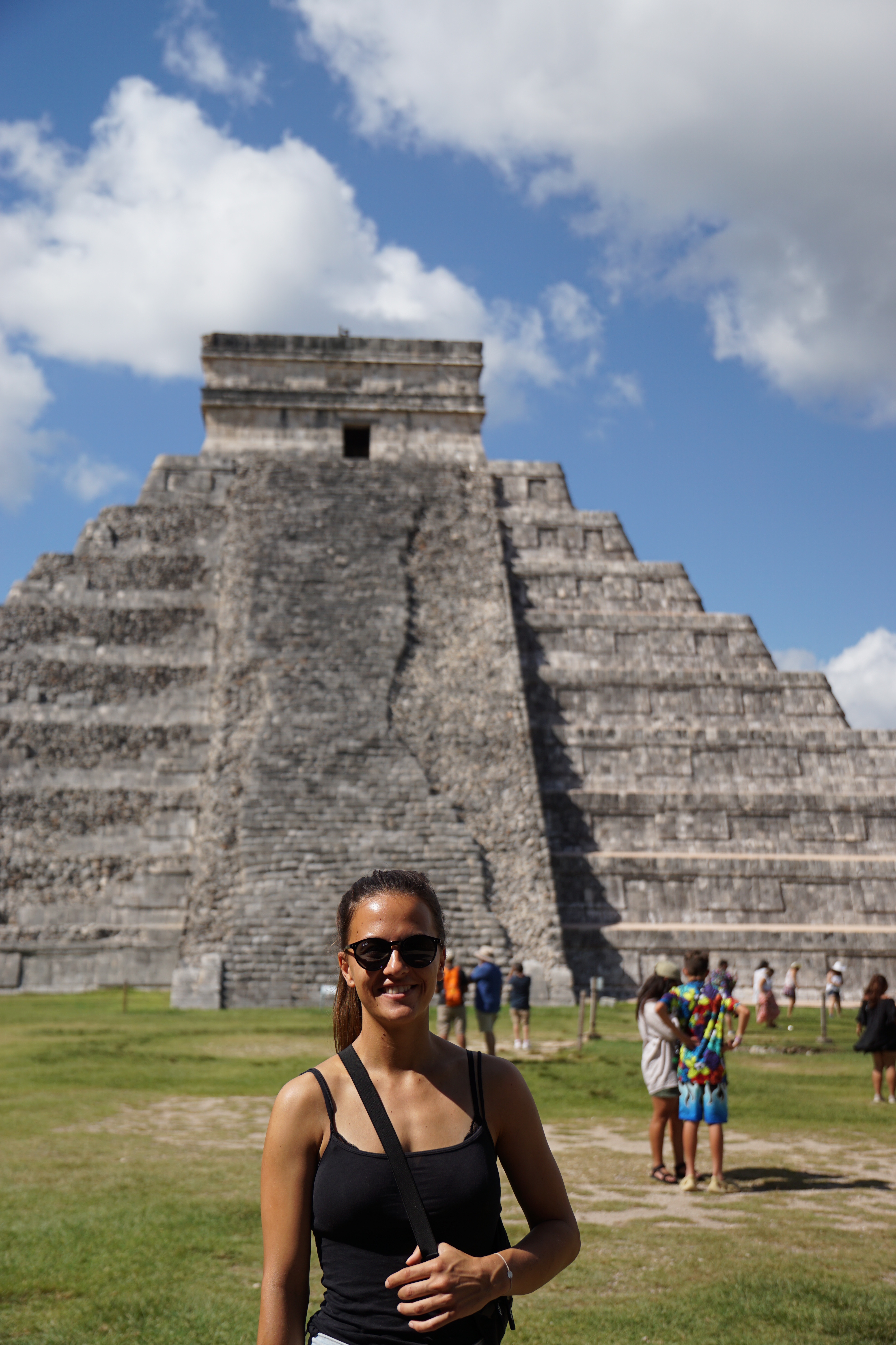 Wir liefen weiter und standen endlich vor der großen Pyramide. Die Fakten und Geschichten, die er uns dazu erzählte waren wirklich spannend und man wäre ohne Guide definitiv nicht darauf gekommen. Beispielsweise spiegelt sich der Maya-Kalender komplett in der Pyramide wider. Es gibt unter anderem 91 Stufen, an jeweils vier Seiten, die mit der letzten gemeinsamen Stufe zur oberen Plattform zusammen, 365 ergibt. Jede Seite steht für eine Jahreszeit. Dass die Maya sehr präzise mit ihren Kalendern waren, auch wenn diese sich leicht von dem heutigen differenziert, war uns bewusst, dass sie aber den Kalender komplett in die Pyramide eingebaut haben, hätten wir nicht gedacht. Zusätzlich zu den Stufen gibt es noch diverse weitere Merkmale, die beispielsweise die Monate darstellen. Zusätzlich sind die Treppen mit riesigen Schlangen verziert. Im Gegensatz zum Christentum, welches die Spanier später einführten, war die Schlange bei den Maya heilig und ein positives Zeichen. Die Pyramide ist nicht mit den Seiten in die Himmelsrichtungen ausgerichtet, da sie so angelegt wurde, dass zweimal im Jahr die Sonne so steht, dass die Schlangen durch die Schatten besonders markant sind. Zusätzlich liegt eine Seite komplett im Schatten, während die andere Seite perfekt in der Sonne ist. Diese Tage markieren die Zeitpunkte zum aussähen beziehungsweise ernten der Felder. Die Pyramide diente nämlich auch als landwirtschaftlicher Kalender.