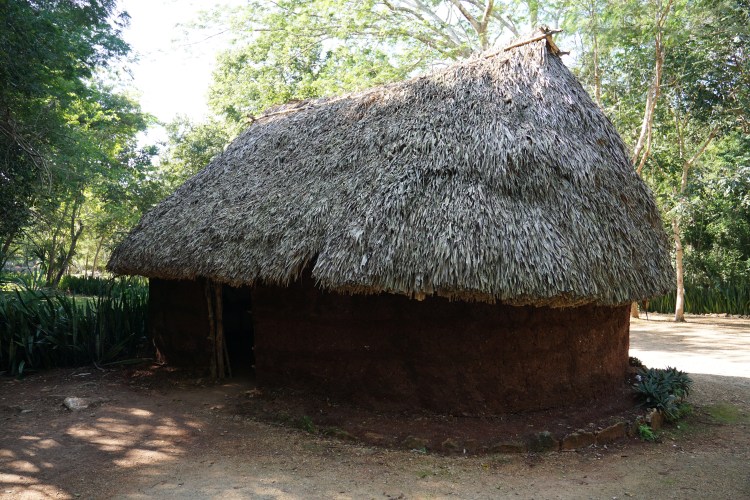 Im Anschluss liefen wir zu einer Nachbildung einer Maya-Hütte, wie sie früher die Bewohner hatten. Interessanterweise war die archäologische Stätte von Chichén Itzá noch bis vor weniger als dreißig Jahren dicht besiedelt mit solchen Hütten, in denen Einheimische lebten. Die Stadt und auch Straßen verliefen direkt an den Ruinen vorbei. Allerdings änderte sich das mit Beginn der Ausgrabungen, und die Häuser wurden abgerissen. Diese bestanden grundsätzlich aus Holz, Kalkstein und einem Blätterdach. Selbst unser Guide lebte als Kind noch in einer solchen Hütte.