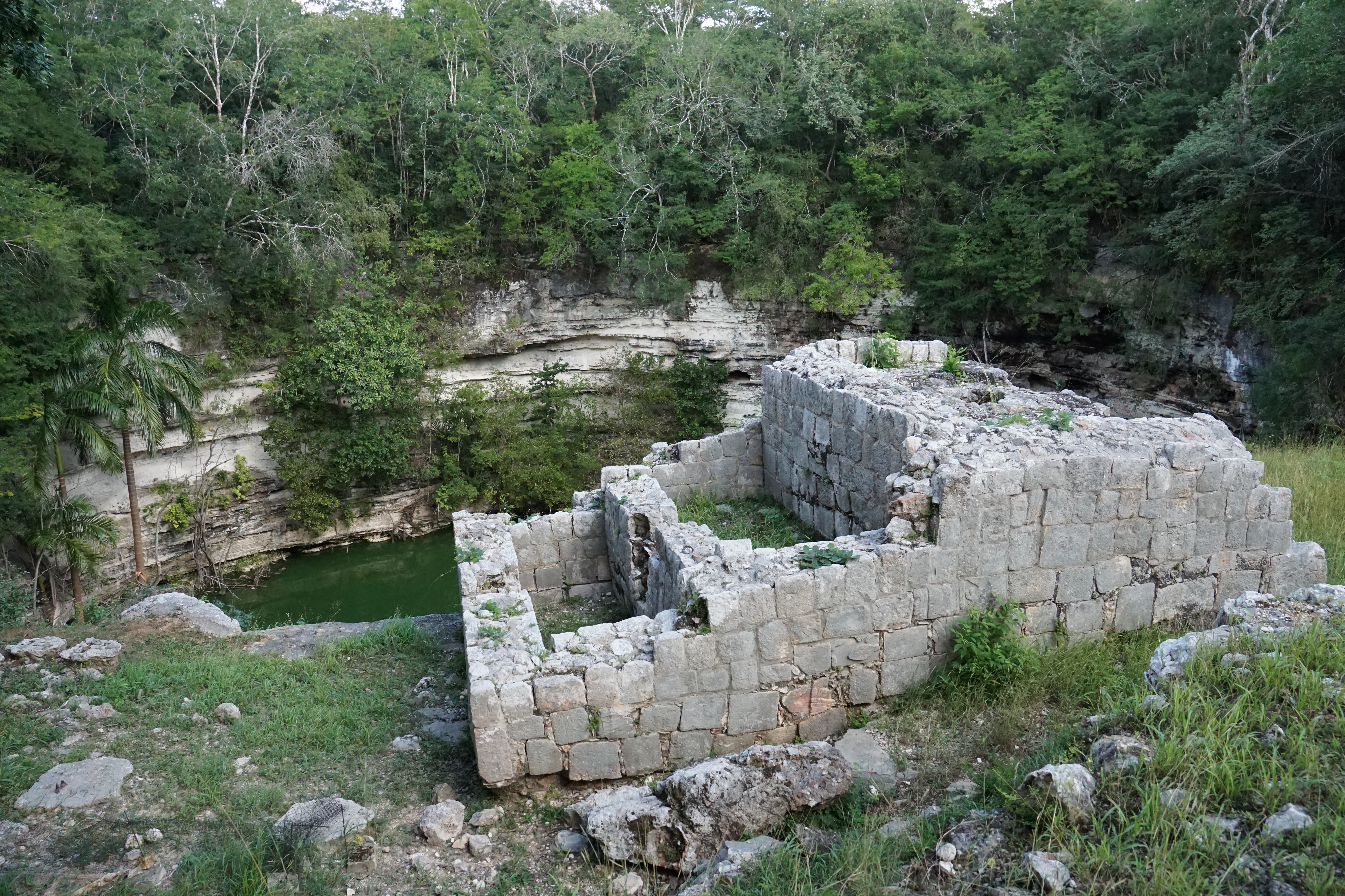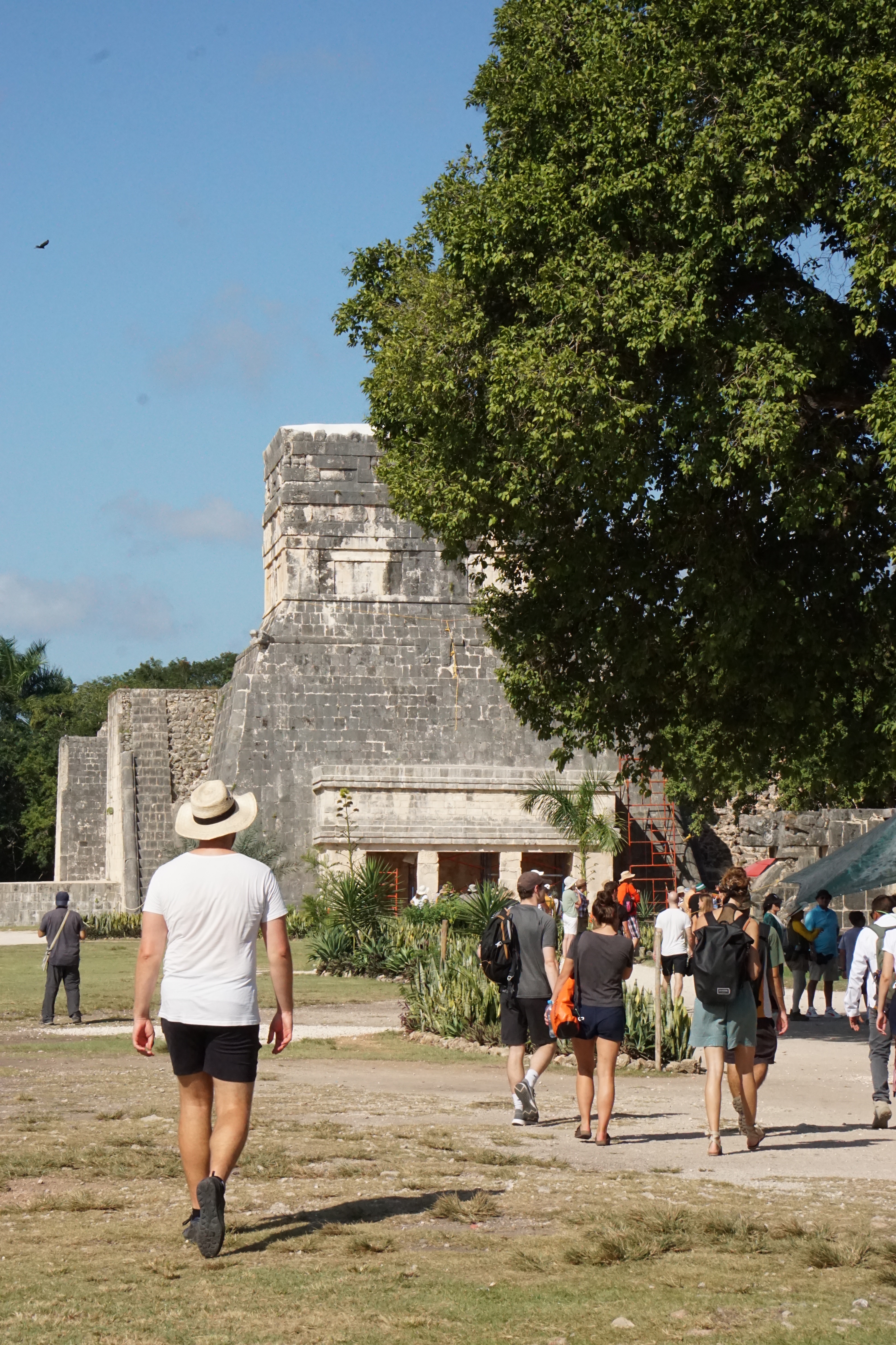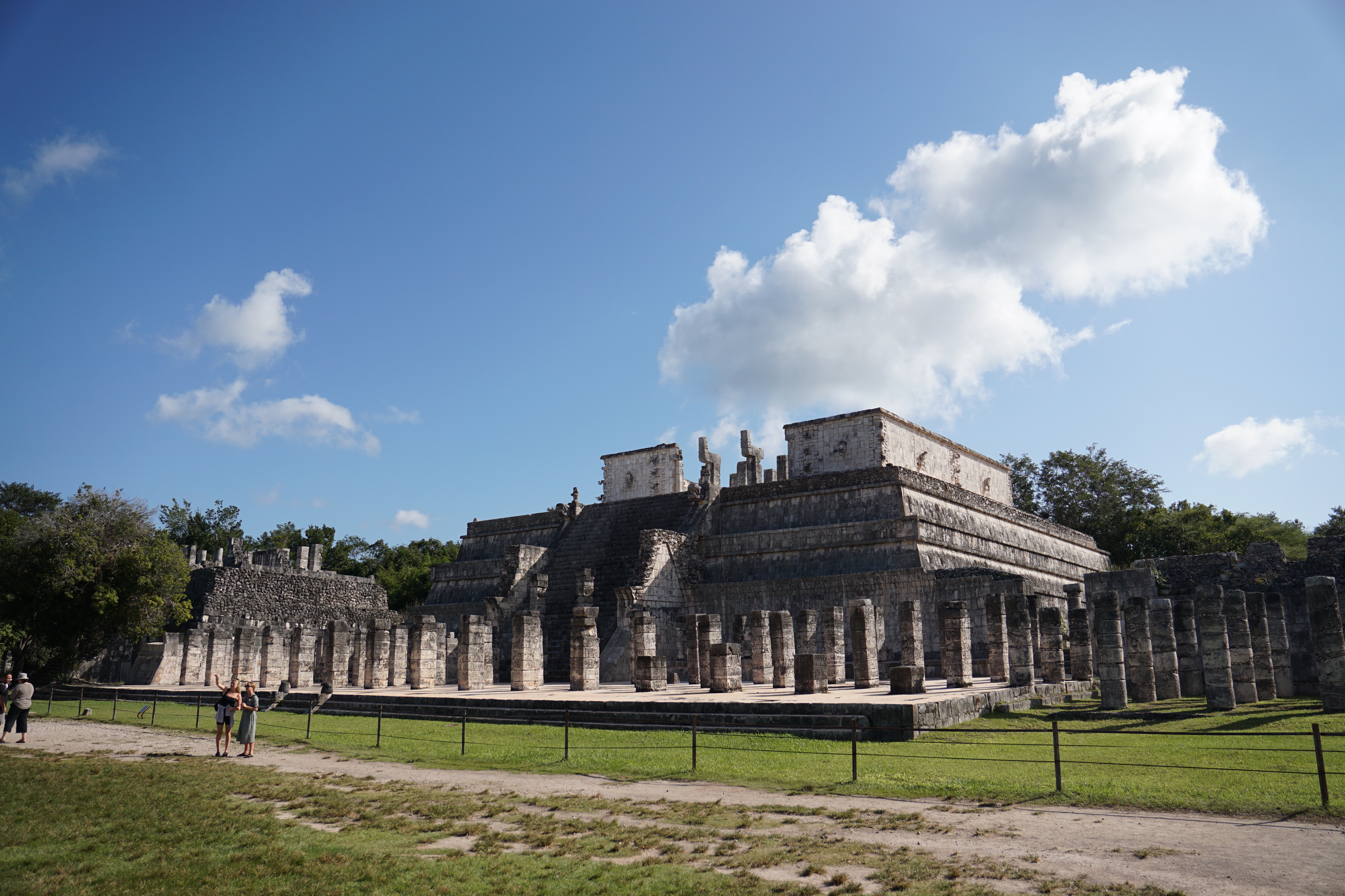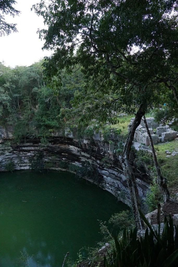 Unsere kleine Gruppe von Personen aus dem Colectivo wurde direkt von einem Guide begrüßt, der uns erstmal erklärte, wo wir später wieder abgeholt werden können, wo die Kassen sind, und einige weitere Details, ehe er seine Tour anbot. Zusammen mit insgesamt sechs weiteren ließen wir uns zu der Tour überreden, um mehr Informationen zu diesem berühmten Ort bekommen zu können. Wir kauften zunächst die Tickets, die mit 27 €/p.P ähnlich teuer wie in Uxmal waren. Dann ging die Tour los. Zunächst liefen wir an der eigentlichen Attraktion, der großen Pyramide von Chichén Itzá vorbei. Es ging zu einer Cenote. Unser Guide klärte uns über die Entstehung und das frühere Aussehen dieser auf. Früher hatten die meisten Cenoten noch ein natürliches Dach, welches mit der Zeit allerdings meist einstürzte, wodurch oftmals nur noch die (Wasser-)Löcher zurückbleiben. Zudem hatten die Cenoten zu Zeiten der Maya eine besondere symbolische Bedeutung. Ihrem Glauben nach, lebte in ihnen der Gott des Regens und der Fruchtbarkeit, schließlich befand sich viel Wasser in den Cenoten. Aus diesem Grund wurden regelmäßig Opfer, auch Menschenopfer, dem Gott erbracht, in dem lebende Menschen in die Cenoten geworfen wurden. Aus diesem Grund befanden sich auch oftmals Tempel entweder direkt an der Cenote, oder in der Nähe. Hierbei sei aber vermerkt, dass nur wenige der über 5.000 Cenoten in Yucatan für Opferungen genutzt wurden.