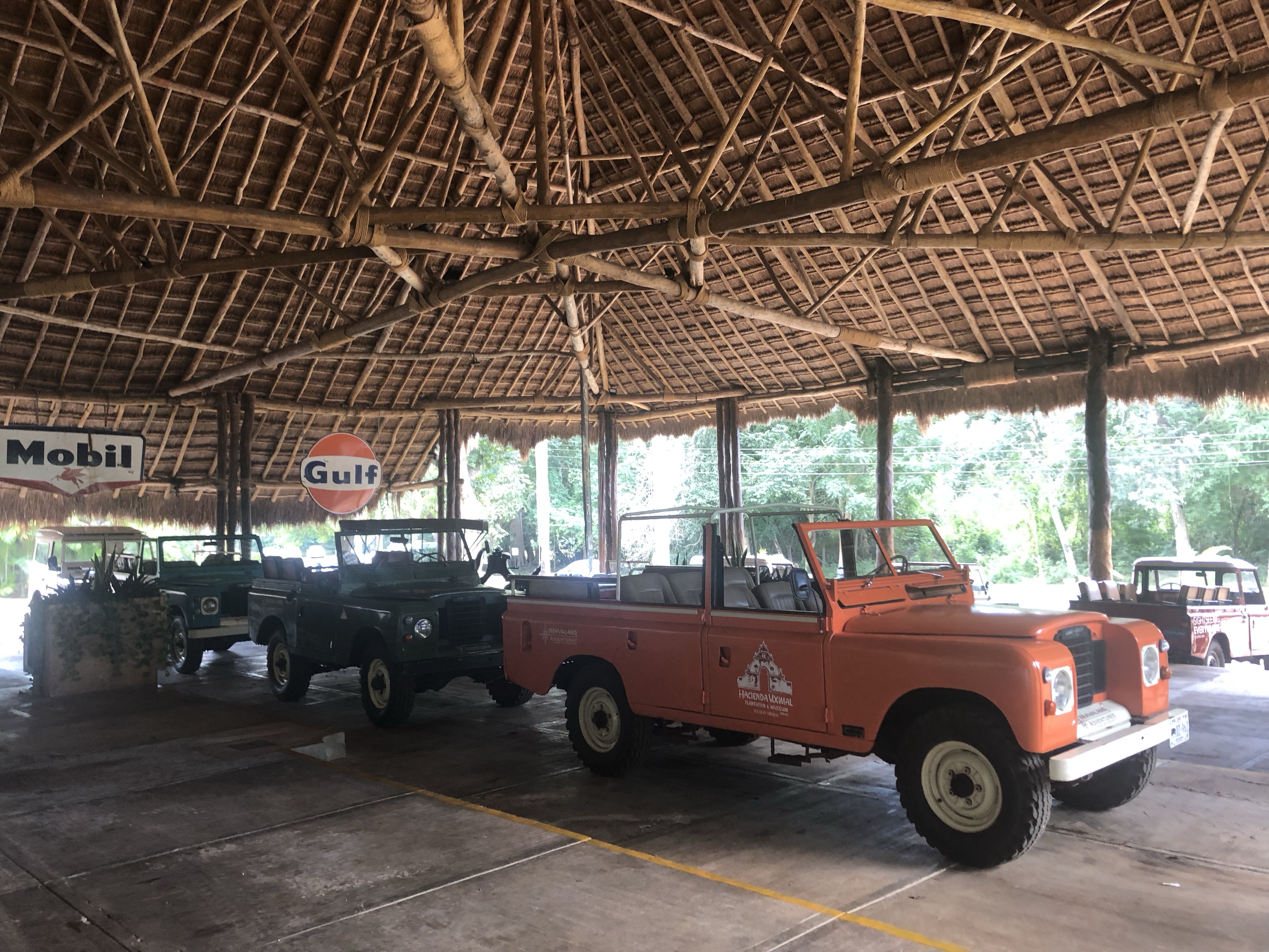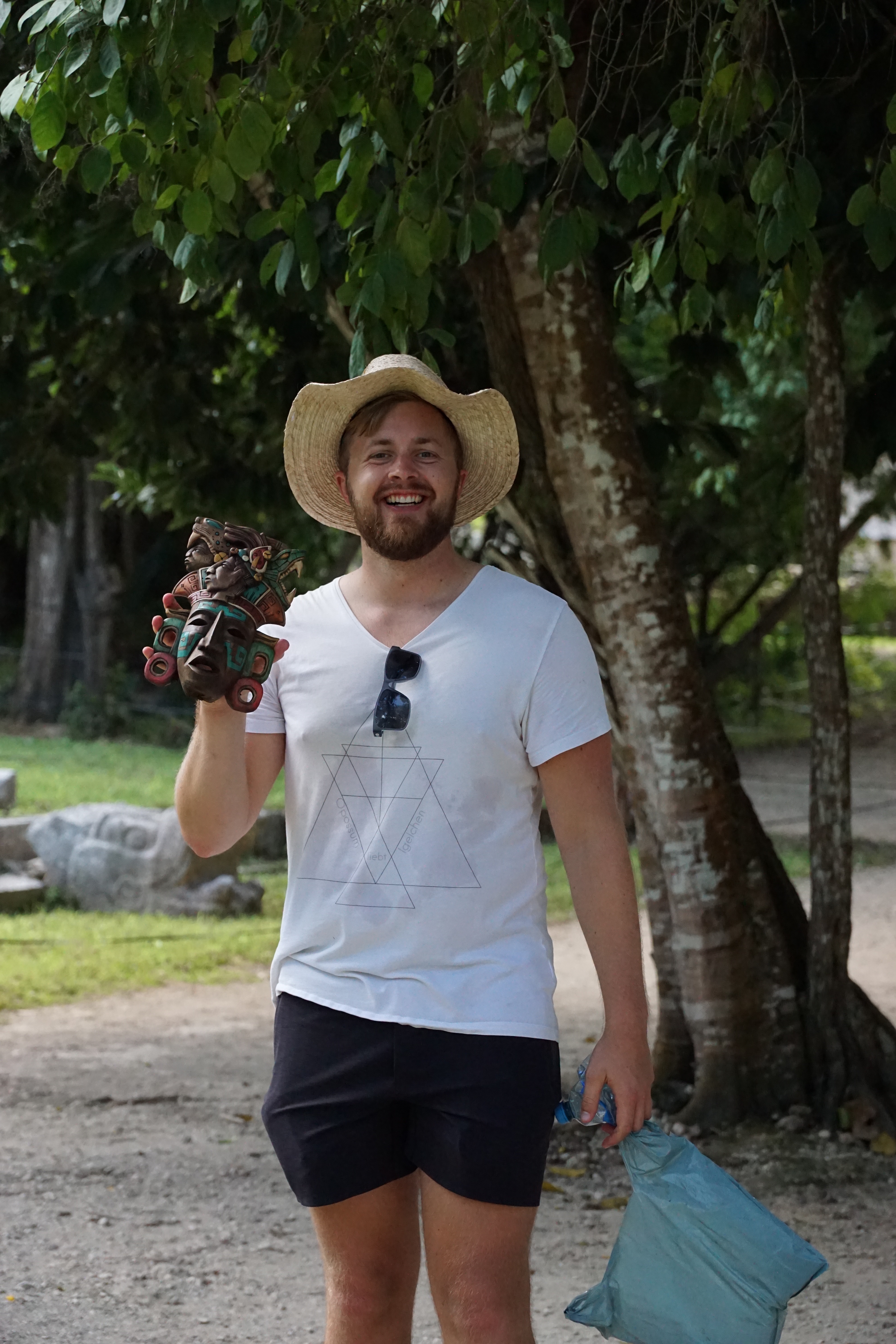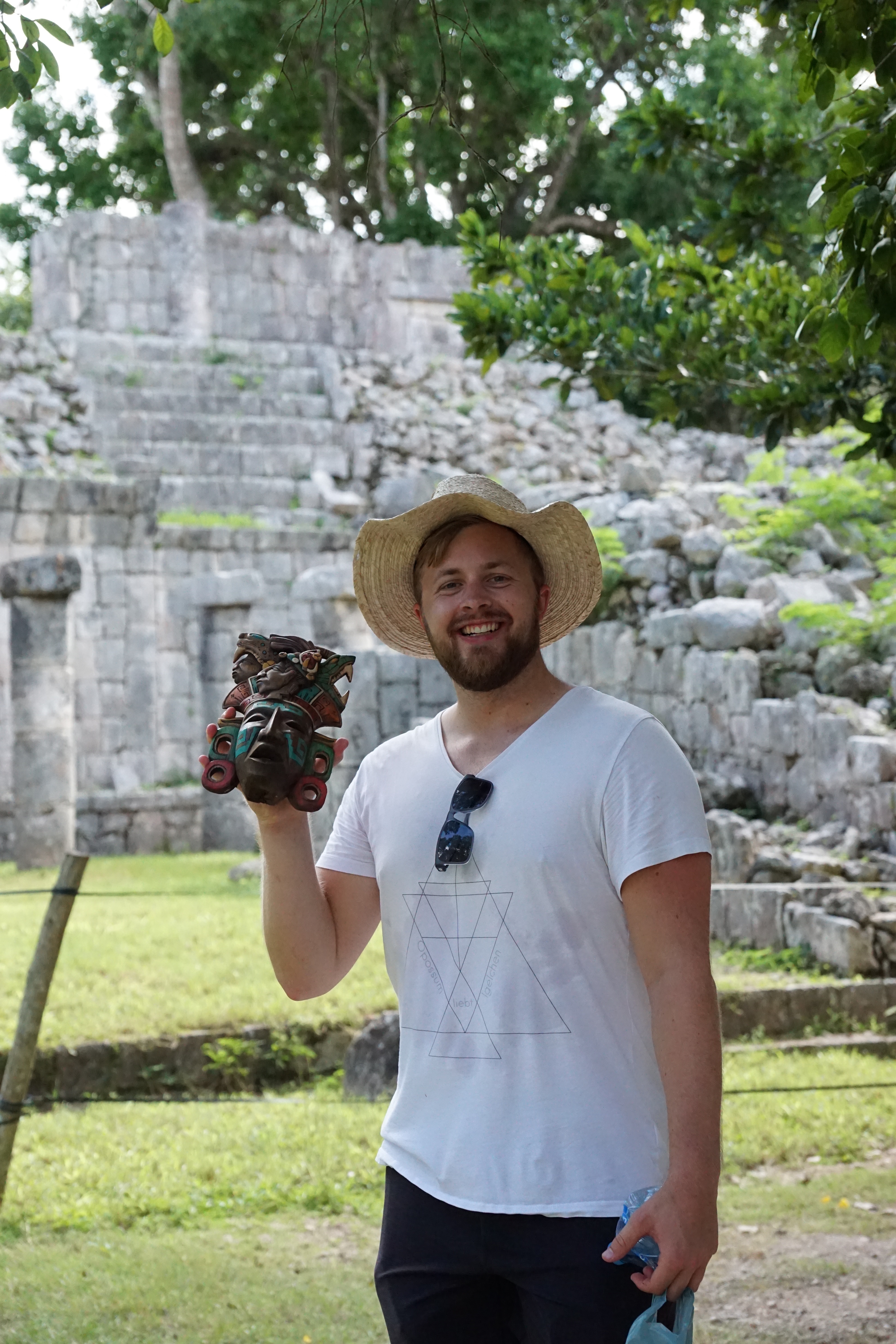Unter anderem gibt es dort auch ein Observatorium, zumindest wird es so genannt, welches große Ähnlichkeit mit heutigen Observatorien aufweist. Allerdings konnte nicht zu einhundert Prozent bestätigt werden, dass es wirklich eines ist, wobei viele Indizien darauf hindeuten. Wir waren wirklich begeistert von diesem Ort. Der Besuch hat sich definitiv gelohnt. Vor allem hat es sich auch gelohnt, dass wir so früh dort waren, da es später immer voller wurde, insbesondere durch die vielen Reisebusse. Doch morgens ist es noch angenehm leer. Wir schlenderten noch über die Ausgrabungsstätte und kauften uns eines der wenigen Souvenirs, die wir über die Reise gesammelt haben. Eine Maske aus Holz. Wir dachten zunächst, es wären Massenanfertigungen, möglicherweise gar China-Ware, sahen dann aber überall, wie die Verkäufer diese Masken selber schnitzten. Das fanden wir wirklich toll und kauften somit ein Andenken. Im Anschluss verließen wir die Ruinen, nahmen aber nicht sofort das nächste Colectivo. Erstmal hatte sich der Hunger breit gemacht und wir liefen ein kurzes Stück zu einem kleinen Restaurant. Neben einer kalten Cola gab es auch ein leckeres Mittagessen. Das Gericht, welches uns der Guide aus Mérida empfohlen hatte. Schweinefleisch, welches mariniert wird und dann in Bananenblätter gewickelt und in einem Erdloch mit Glut überhäuft wird. Dort gart es dann für einige Stunden und es entsteht ein super leckeres Gericht, welches sehr an pulled Pork erinnert. Dazu gab es Tortillas, Reis, Bohnen und etwas scharfe Salsa. Hendrik war begeistert.