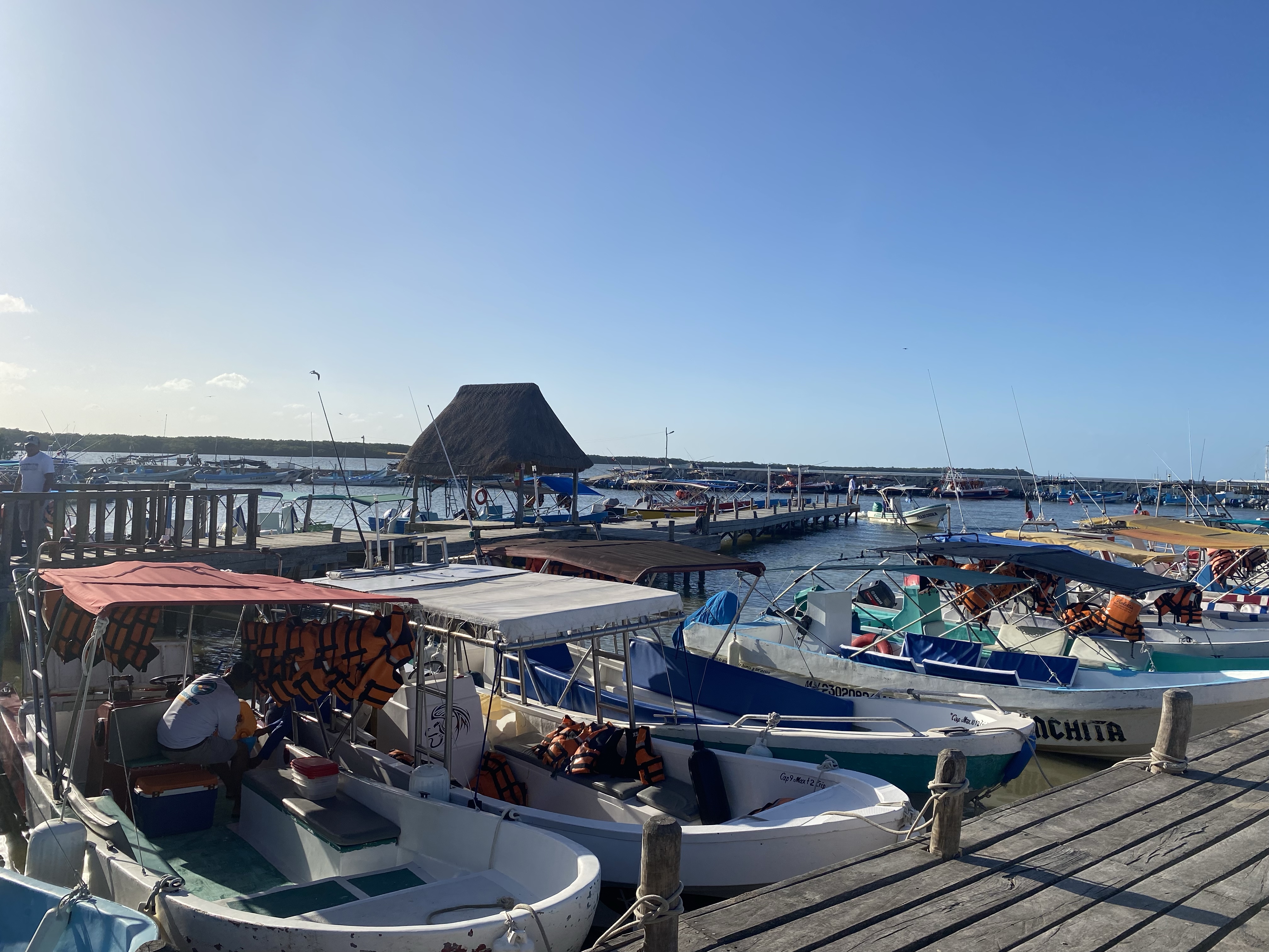 Mit einer Insel hat unsere Zeit in Yucatan angefangen, mit einer Insel soll die Reise auf der Halbinsel auch wieder enden. Wir packten unsere Sachen nach dem Frühstück und verließen die Unterkunft. Nach einem zwanzigminütigen Marsch erreichten wir komplett durchgeschwitzt das Busterminal. Wir waren früh dran und hatten somit noch etwas mehr als eine halbe Stunde zum Akklimatisieren. Dann wurde unser Bus aufgerufen und luden unsere großen Rucksäcke in den Bus, ehe wir selber einstiegen. Die Fahrt dauerte drei Stunden und wir durchquerten mal wieder eine Zeitzone. Jetzt sind wir wieder auf sechs Stunden an Deutschland dran. Der Bus fuhr Straßen entlang, wo man immer wieder erstaunt ist, dass der Bus da lang passt oder lang fahren kann, und gleichzeitig von den Fähigkeiten der Busfahrer beeindruckt ist. Wir erreichten schließlich Chiquilá, ein winziges Dorf, von wo alle Fähren zu der Insel Holbox ablegen. Wir kauften uns Fährtickets (10 €/p.P. pro Fahrt) und gingen zu unserer Fähre. Ohne weitere Wartezeit wurden die Passagiere auf die Fähre gelassen und nach ungefähr einer Viertelstunde ging die Fahrt los. Das Wasser ist hier aktuell ziemlich grün und nicht so gewohnt klar und blau wie andernorts. Wir hoffen, dass es auf der anderen Seite der Insel, wo der Strand ist, besser ist.
