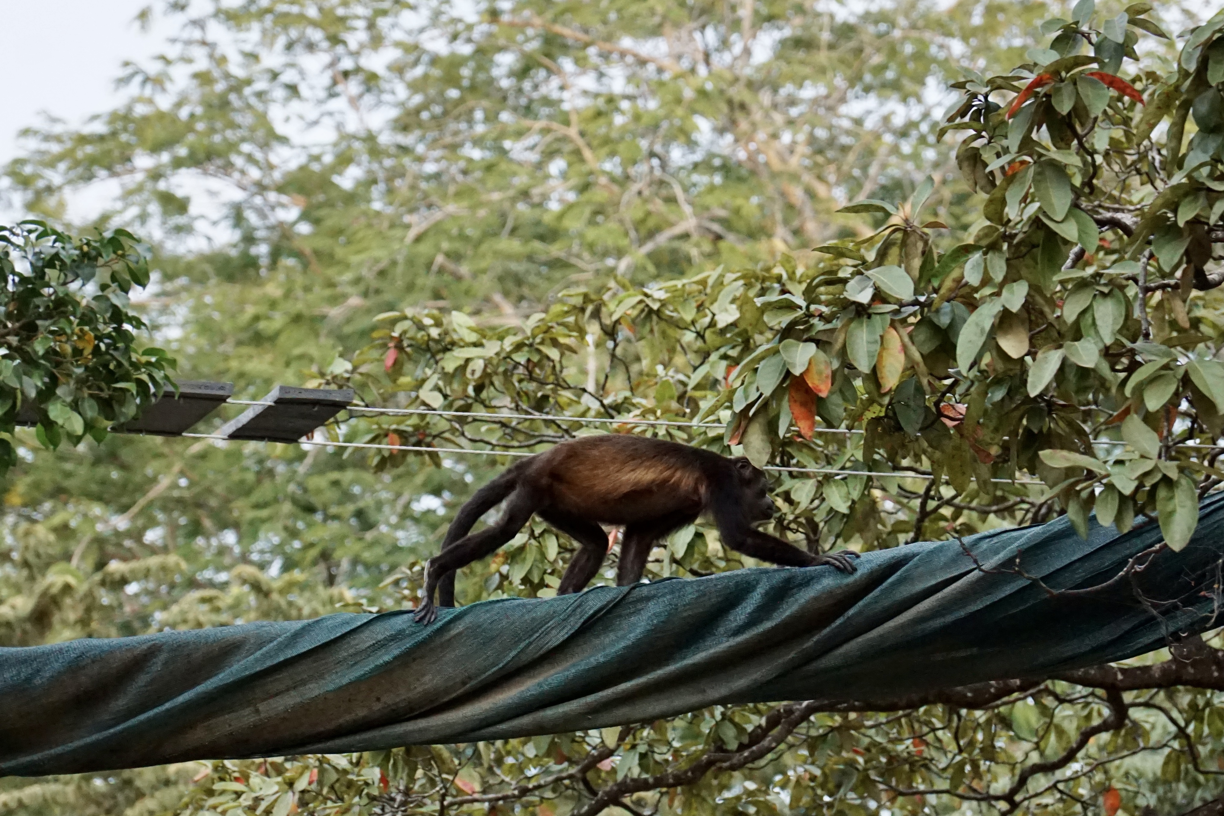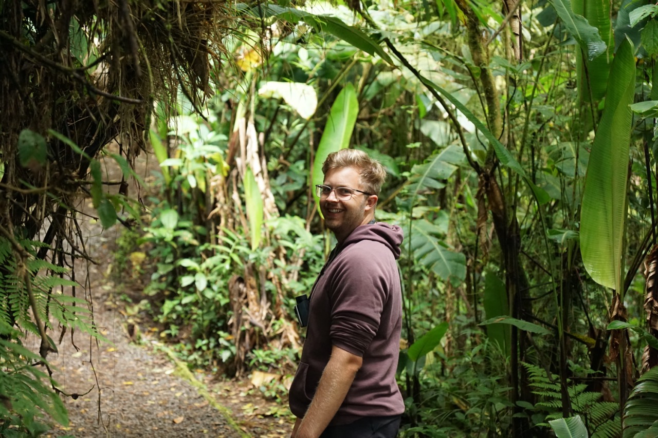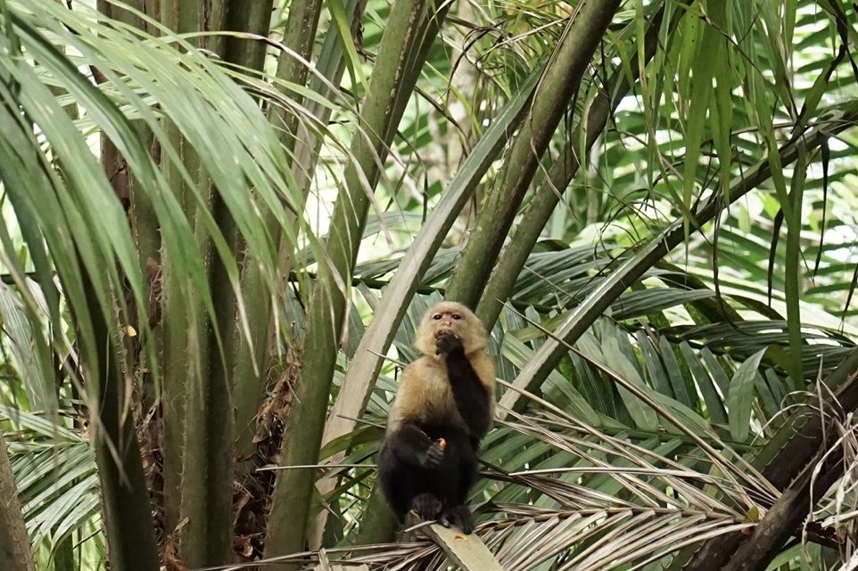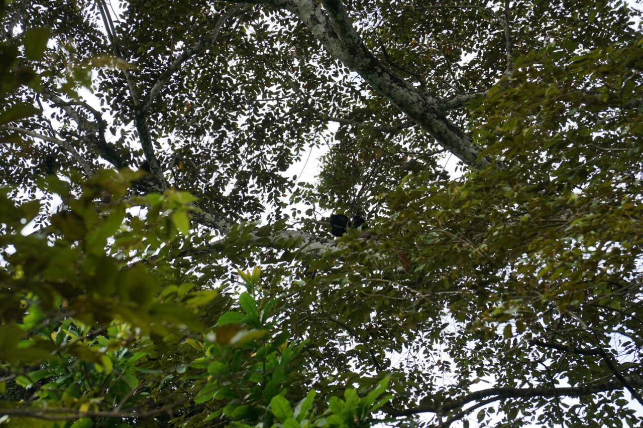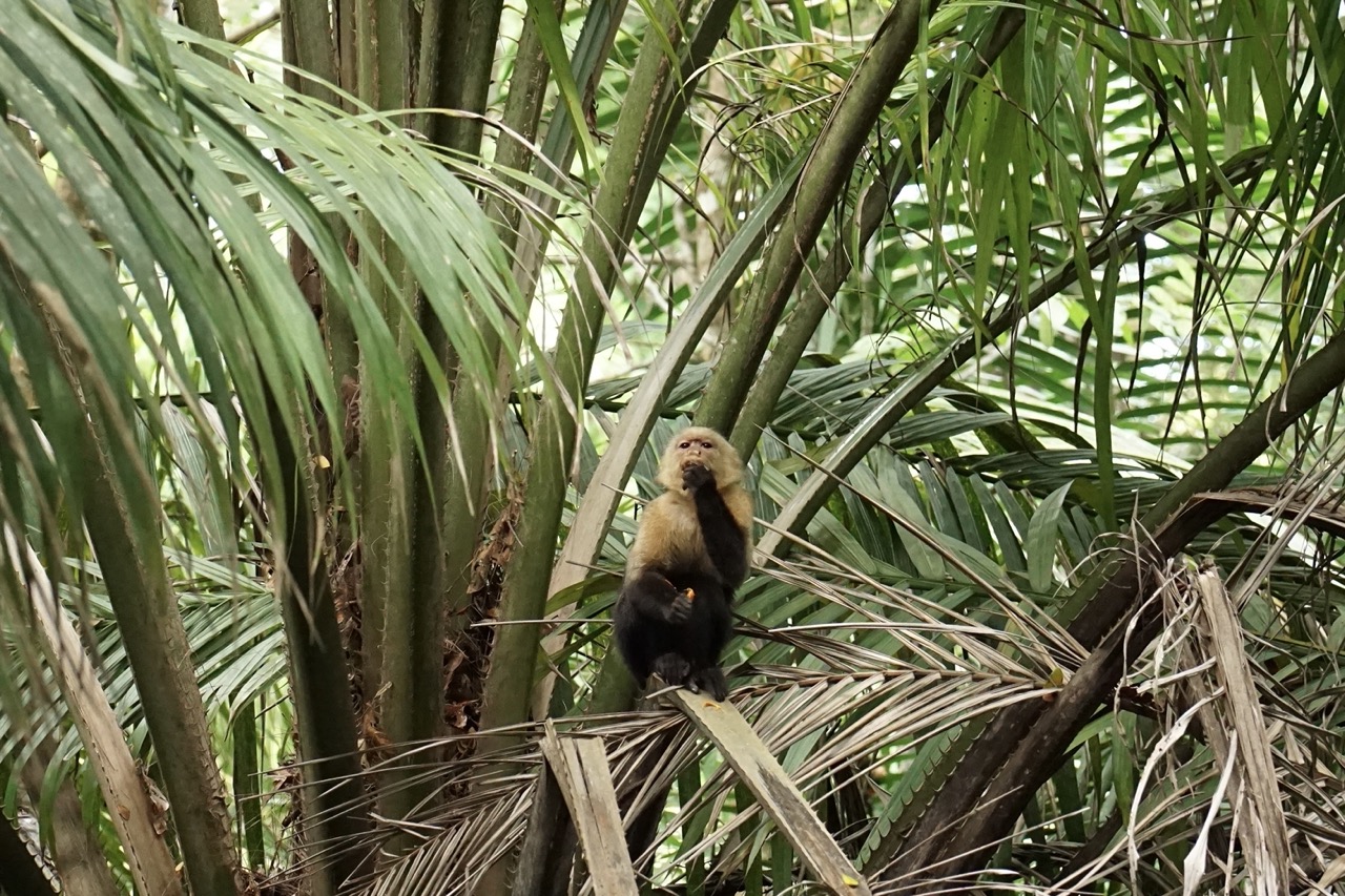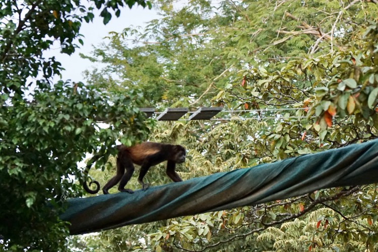 Die Mittagshitze gepaart mit der sehr hohen Luftfeuchtigkeit in Costa Rica machten das spazieren zu einer sehr schweißtreibenden Angelegenheit. Doch wir wollten ja unbedingt noch ein paar Tiere sehen, also wanderten wir tapfer weiter durch das Blätterdach riesiger Bäume und über wackelige Holzbrücken. Irgendwann sahen wir dann auf unserem Weg auch noch ein paar kleine Mini-Wildschweine. Das war ja schon fast wie zu Hause in Berlin. Leider entdeckten uns die Schweinchen auch recht schnell, weshalb sie viel zu versteckt für ein schönes Foto blieben. Unsere Geduld sollte sich auch noch weiter auszahlen. Auf unserem letzten Wanderabschnitt hörten wir plötzlich etwas ganz laut über uns brüllen. Und da, als wir ein zweites Mal hinsahen, sahen wir endlich die Brüllaffen, die wir vorher immer nur gehört hatten. Und ein paar hudert Meter weiter konnten wir sogar ein Kapuzineräffchen beim Mittagsessen beobachten. Endlich hatte sich der Wunsch nach einer Affensichtung erfüllt (Damals wussten wir noch nicht, dass wir später noch sehr viel mehr Äffchen sehen würden).
