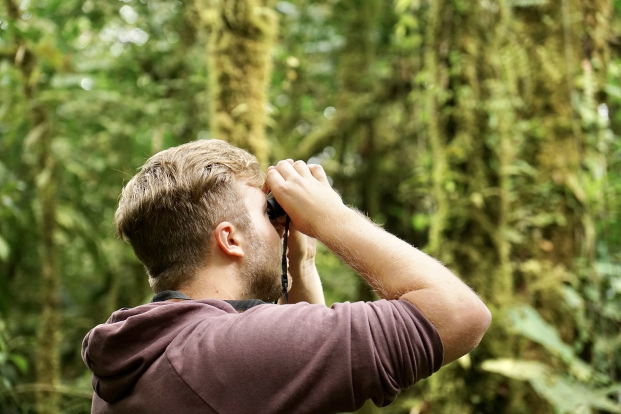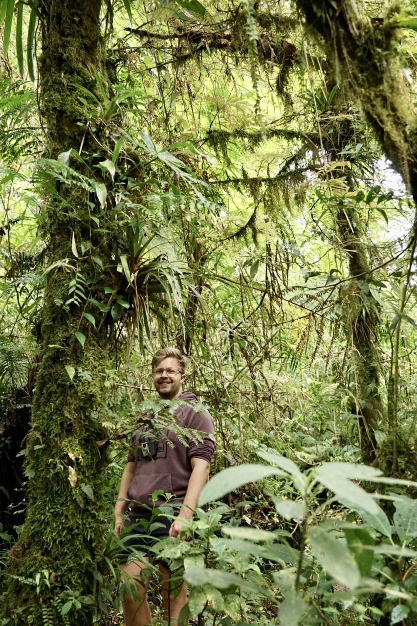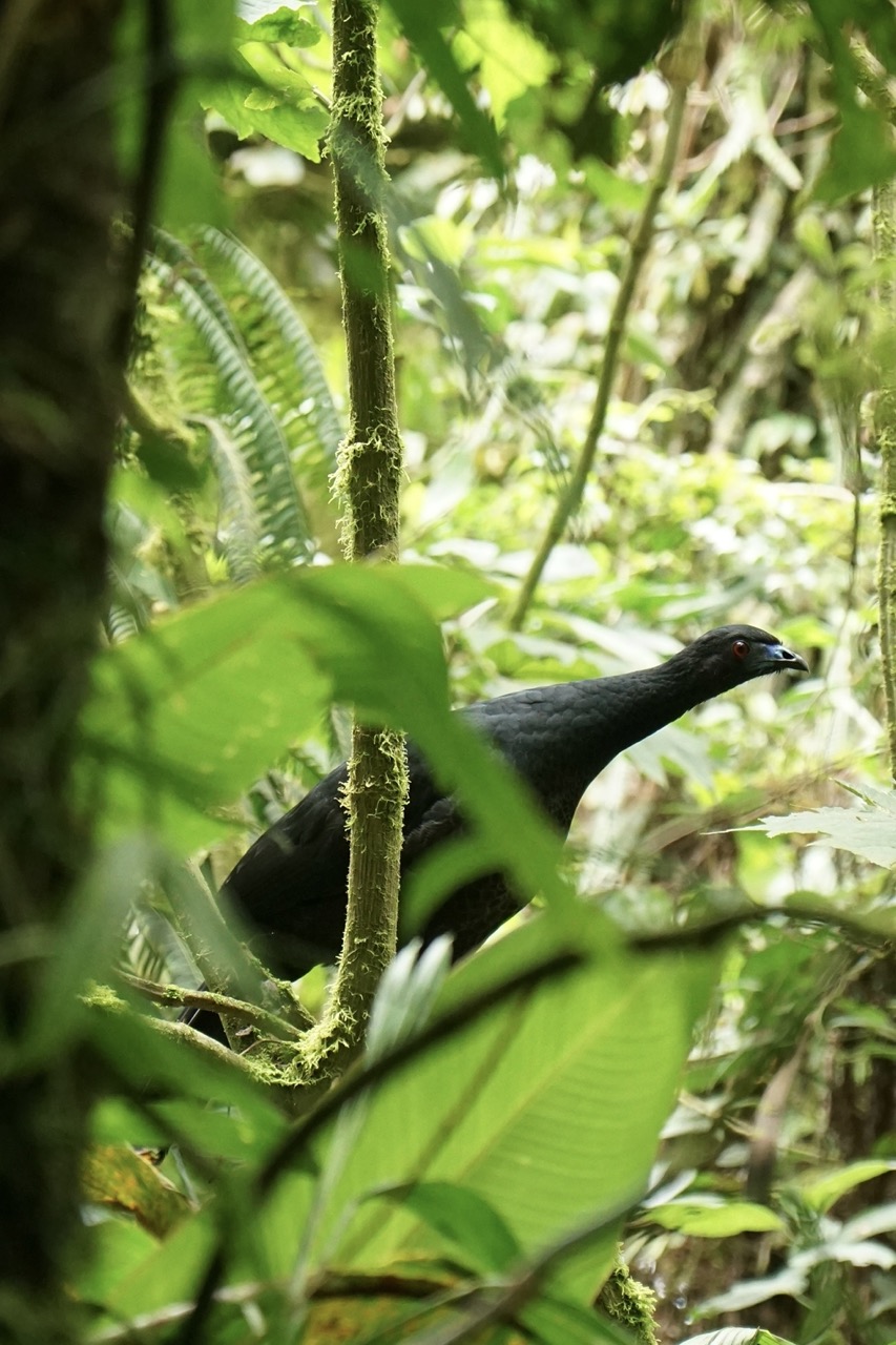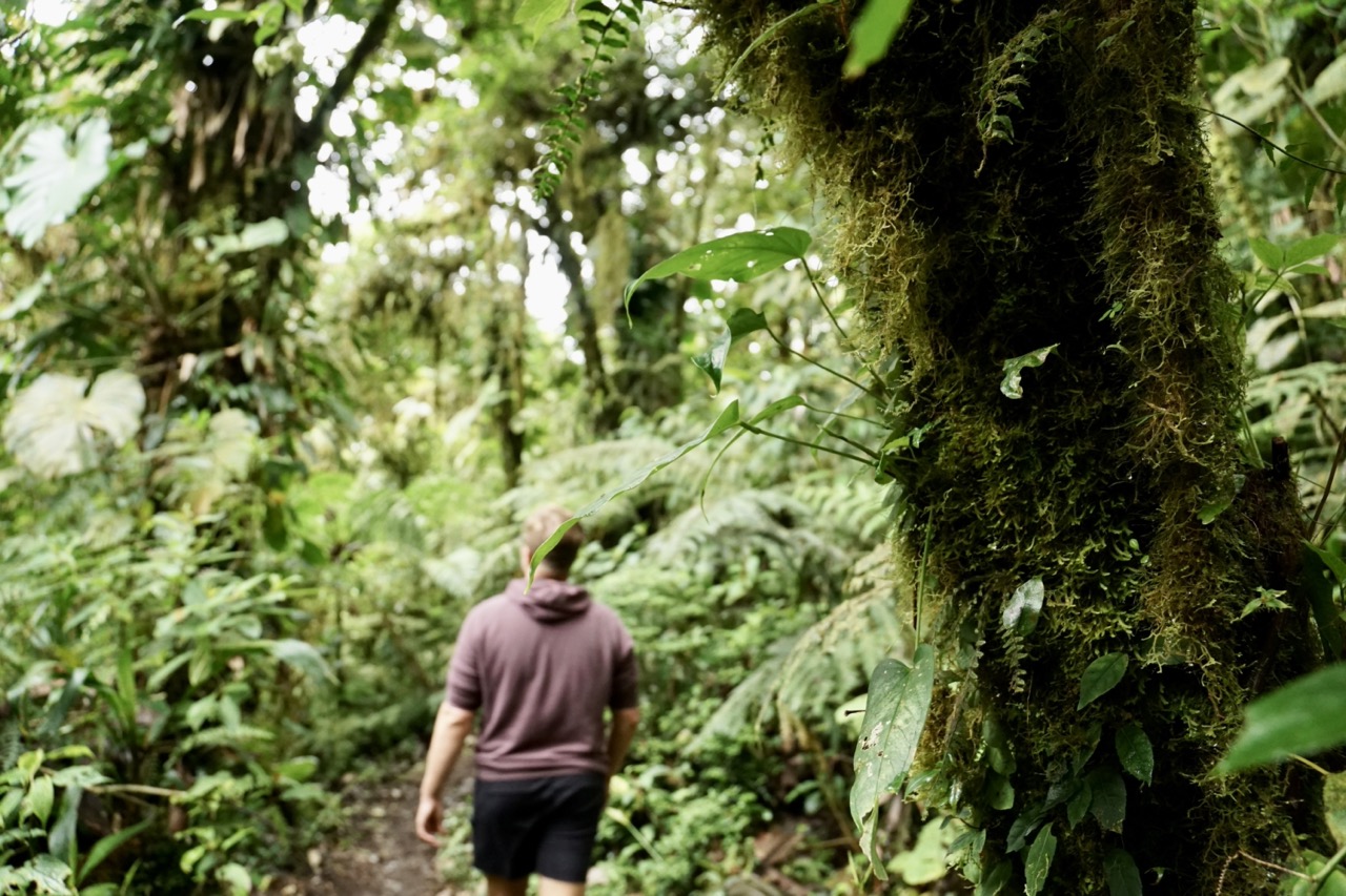 Die meiste Zeit genossen wir also die absolute Stille um uns herum, welche nur ab und zu durch ein Rascheln oder Zwitschern unterbrochen wurde. Schon nach den ersten Metern fiel uns auf, dass wir uns fühlten, als wären wir im Tropenhaus im botanischen Garten. Dank der Höhe, lagen die Temperaturen bei angenehmen 20 Grad, die Luftfeuchtigkeit war jedoch enorm hoch und um uns herum sahen wir nur grün. Wunderschöne Lianen schlängelten sich die majestätischen Bäume hinauf, Schmarotzer- und Halbschmarotzerpflanzen begrünten die braunen Äste, und Pilze, Flechten und Moose überwucherten den Boden. Der dichte Nebelwald machte es natürlich auch unglaublich schwer, Tiere auszumachen. Auch wenn wir immer wieder ein Knacken oder Rascheln hörten, sahen wir die Tiere dazu größtenteils nicht. Ein paar schöne bunte Vögel wie den „collared redstart“ (endemisch in Costa Rica) oder den „black guan“ bekamen wir dann doch noch auf die Kamera. Doch auch ohne Faultier oder Affen-Sichtung lohnte sich die Wanderung allemal. Wir waren wirklich sehr begeistert und würden einen Besuch in den Nebelwäldern Costa Ricas jedem empfehlen. Man bewegt sich durch so einen Wald dann doch ganz anders als durch die Wälder und Nationalparks Kanadas und Alaskas. Dort versucht man durchaus Geräusche zu machen, um die Bären nicht zu überraschen, hier versucht man jedes Geräusch zu vermeiden und zum Teil lieber zu schleichen. Wir versuchten, für die Hobby-Ornithologen unter den Lesern, möglichst viele Bilder von Vögeln zu bekommen, allerdings sind diese entweder zu schnell (beispielsweise die Kolibris, die wir gesehen haben), oder zu weit weg für unser Kamera-Objektiv. Oftmals hörte man auch nur deren Gezwitscher in diesem dichten Wald.