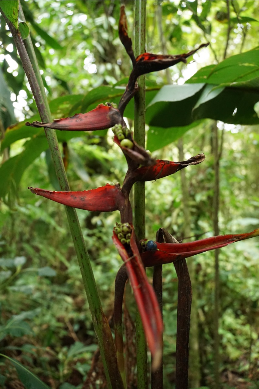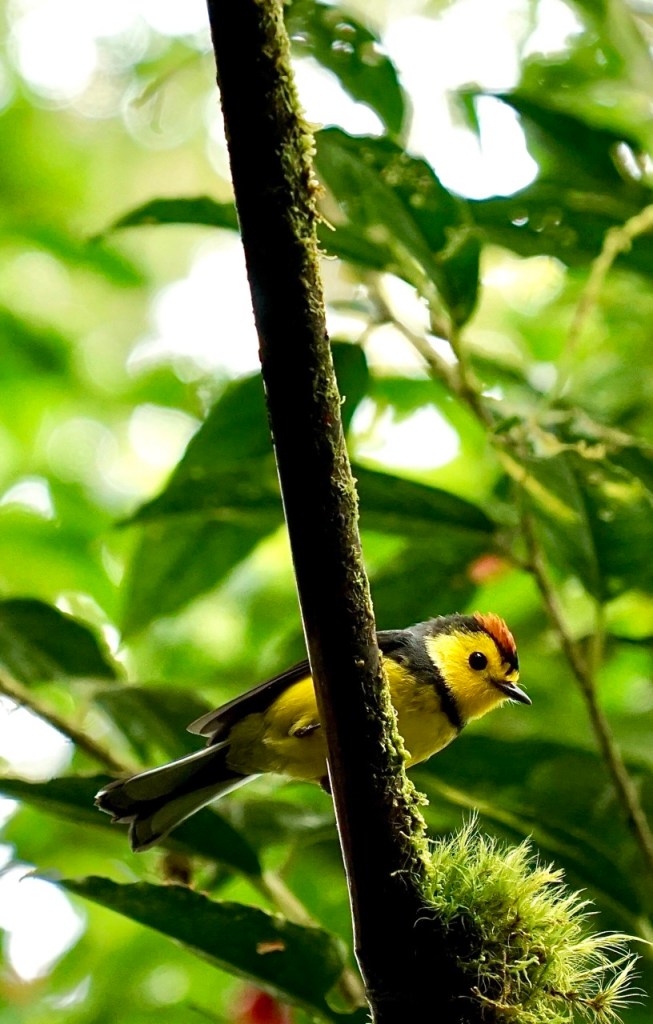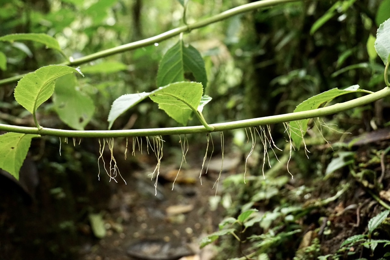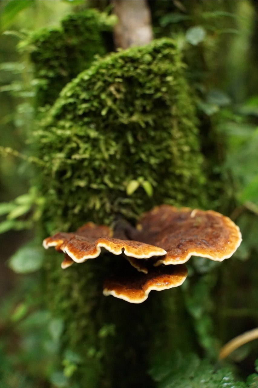 Die meiste Zeit genossen wir also die absolute Stille um uns herum, welche nur ab und zu durch ein Rascheln oder Zwitschern unterbrochen wurde. Schon nach den ersten Metern fiel uns auf, dass wir uns fühlten, als wären wir im Tropenhaus im botanischen Garten. Dank der Höhe, lagen die Temperaturen bei angenehmen 20 Grad, die Luftfeuchtigkeit war jedoch enorm hoch und um uns herum sahen wir nur grün. Wunderschöne Lianen schlängelten sich die majestätischen Bäume hinauf, Schmarotzer- und Halbschmarotzerpflanzen begrünten die braunen Äste, und Pilze, Flechten und Moose überwucherten den Boden. Der dichte Nebelwald machte es natürlich auch unglaublich schwer, Tiere auszumachen. Auch wenn wir immer wieder ein Knacken oder Rascheln hörten, sahen wir die Tiere dazu größtenteils nicht. Ein paar schöne bunte Vögel wie den „collared redstart“ (endemisch in Costa Rica) oder den „black guan“ bekamen wir dann doch noch auf die Kamera. Doch auch ohne Faultier oder Affen-Sichtung lohnte sich die Wanderung allemal. Wir waren wirklich sehr begeistert und würden einen Besuch in den Nebelwäldern Costa Ricas jedem empfehlen. Man bewegt sich durch so einen Wald dann doch ganz anders als durch die Wälder und Nationalparks Kanadas und Alaskas. Dort versucht man durchaus Geräusche zu machen, um die Bären nicht zu überraschen, hier versucht man jedes Geräusch zu vermeiden und zum Teil lieber zu schleichen. Wir versuchten, für die Hobby-Ornithologen unter den Lesern, möglichst viele Bilder von Vögeln zu bekommen, allerdings sind diese entweder zu schnell (beispielsweise die Kolibris, die wir gesehen haben), oder zu weit weg für unser Kamera-Objektiv. Oftmals hörte man auch nur deren Gezwitscher in diesem dichten Wald.