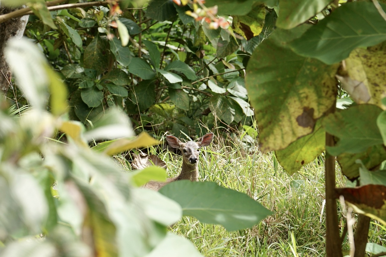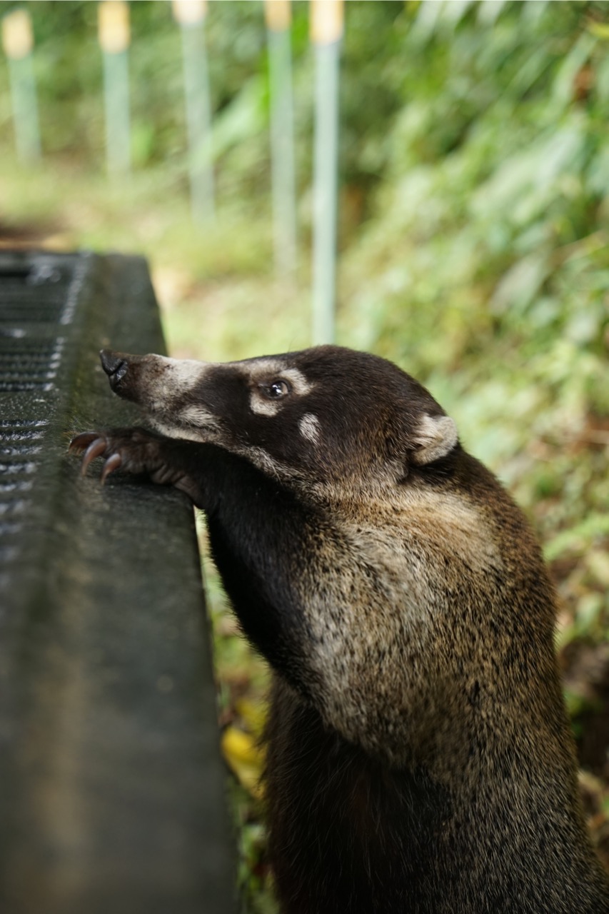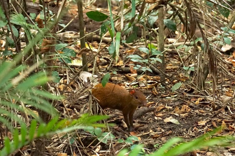 Wir haben bereits auf diesem kurzen Weg unsere erste Tierbegegnung gemacht. Aus dem hohen Gras guckten uns ein paar Rehaugen an und am Waldesrand tollte eine Nasebärfamilie herum. Als wir aus dem Auto gestiegen sind, umgab uns eine unglaubliche Ruhe und Entspannung. Da alle Besucher möglichst viele Tiere sehen wollen, bewegen sie sich dementsprechend vorsichtig und ruhig, was zu einer sehr angenehmen und entspannten Atmosphäre im Reservat führt. Wir haben uns einen kleinen Wanderplan in der Info besorgt und los ging es. Auf mehreren kleinen Rundwegen kann man den tropischen Wald erkunden. Auch wenn wir schon von Beginn an immer wieder ein Rascheln im Unterholz oder entferntes Brüllen hörten, sahen wir lange Zeit kein Tier. Hendrik entdeckte schließlich unser erstes. Ein uns bisher fremdes Tier, welches ein bisschen aussah wie ein zu groß geratenes Meerschwein suchte scheinbar ein Mittagessen im Gebüsch. Später fanden wir heraus, dass es sich um ein Aguti handelte, welches tatsächlich mit Stachelschweinen und Meerschweinen verwandt ist.