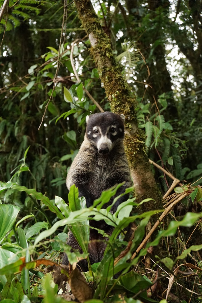 Am Parkplatz angekommen gab es dann erst mal eine kleine Stärkung bestehend aus Ananas und Muffins. Vor allem die Ananas mit ihrem süßen Geruch blieb jedoch nicht unentdeckt. Und so besuchte uns ein kleiner, neugieriger und scheinbar sehr hungriger Nasenbär. Ganz mutig kam er immer näher und versuchte irgendwann sogar ins Auto zu klettern, was ihm nach einigen Anläufen auch gelang. Er war so niedlich und lieb, dass wir ihn zwar aus dem Auto wieder herausschickten, uns aber trotzdem herzlich über seine weiteren Annäherungsversuche amüsierten. Am liebsten hätten wir ihn ja mitgenommen, aber im Dschungel Costa Ricas fühlt sich der Kleine dann wahrscheinlich doch wohler als im Berliner Großstadtdschungel.