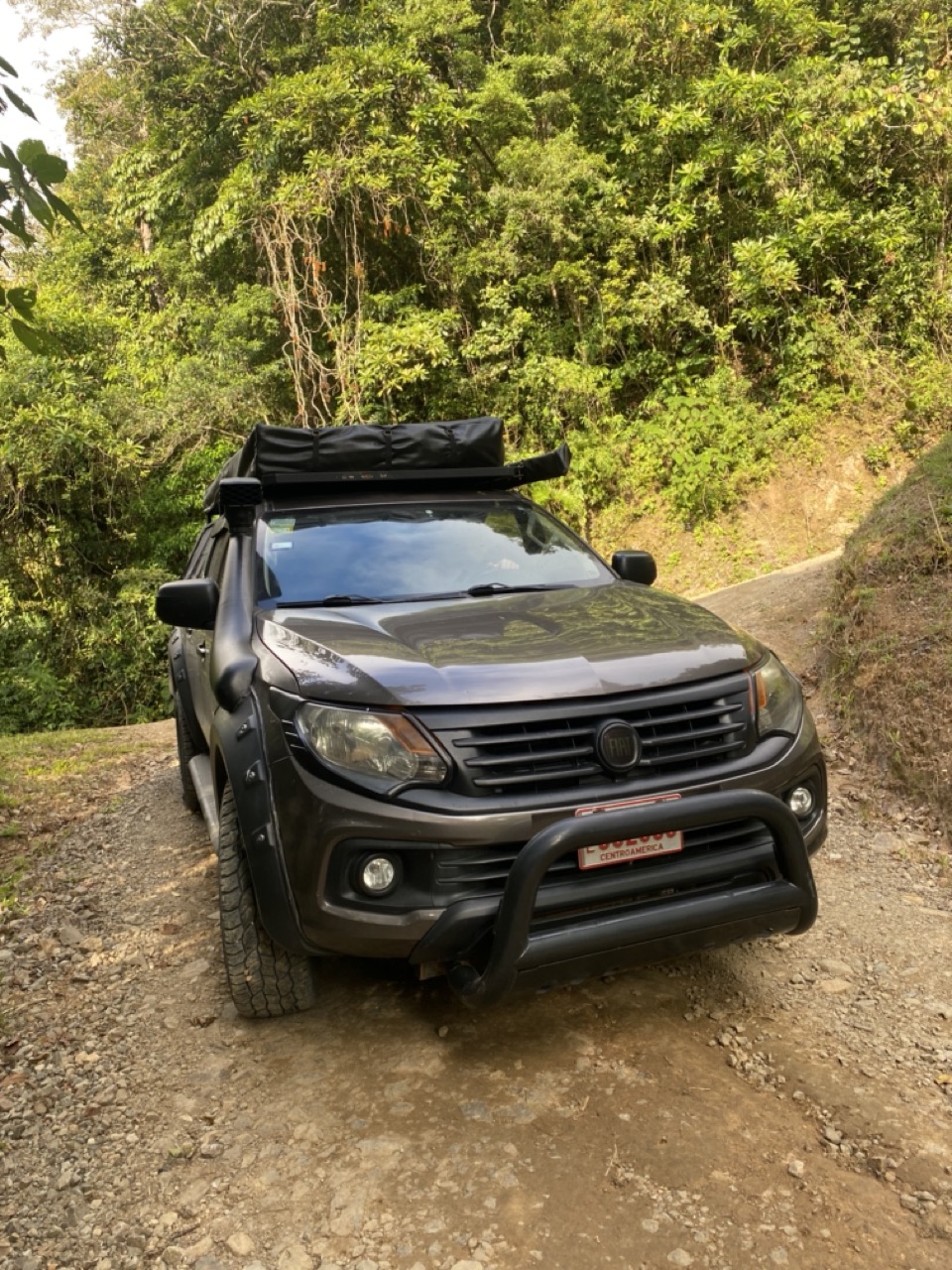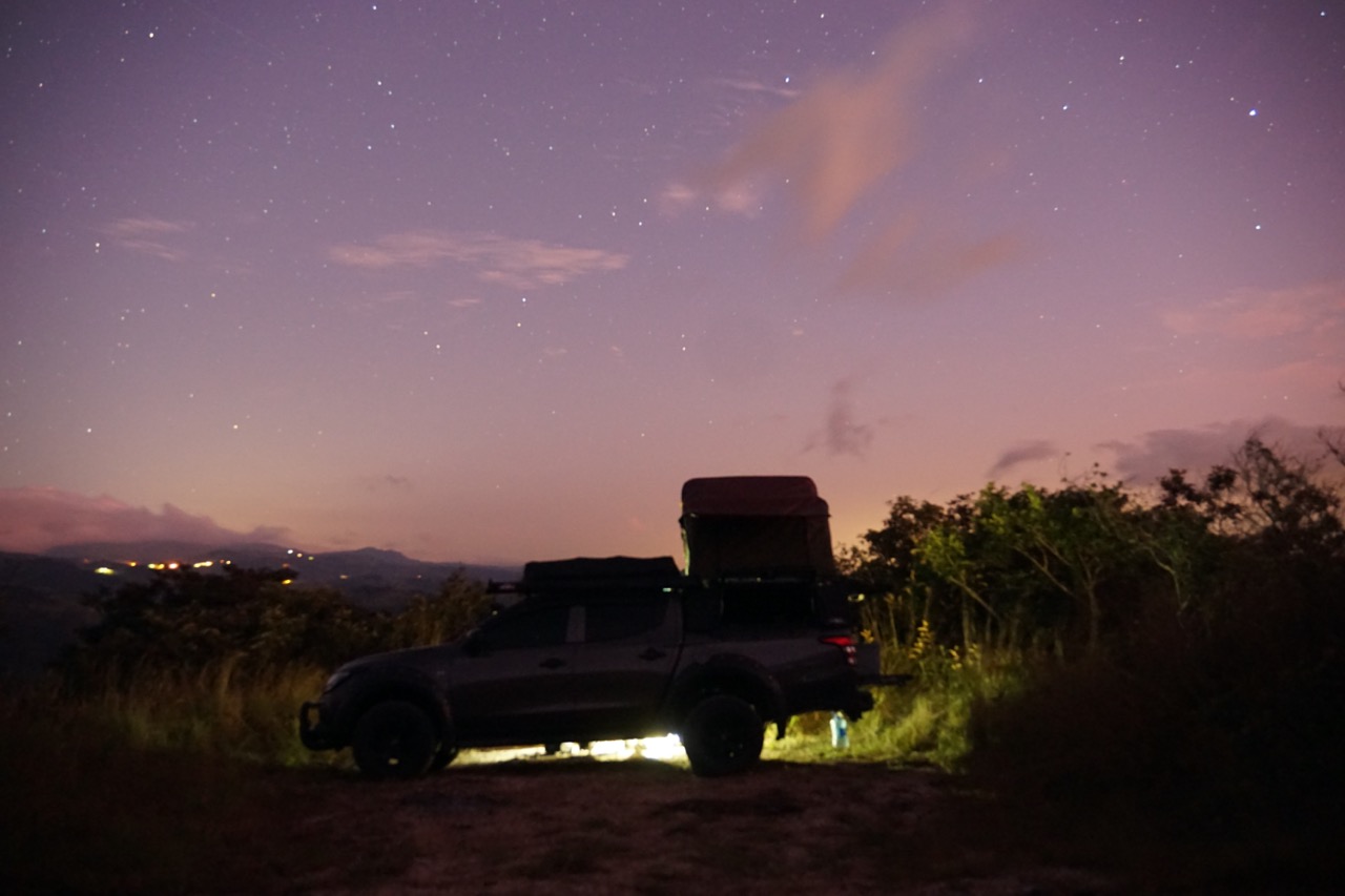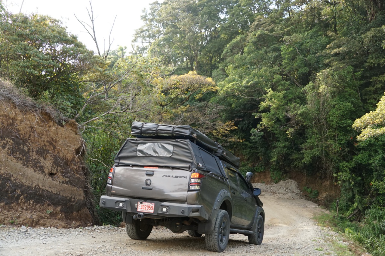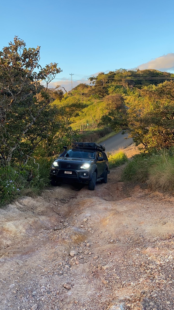 So langsam wurde es Abend und wir genossen eine wundervolle Fahrt raus aus dem Nebelwald in Richtung Küste. Hoch oben auf den Bergkämmen ging es über gut asphaltierte Straßen immer in Richtung Sonnenuntergang. Wir wollten heute zum ersten Mal wild campen. Von unserem ausgesuchten Campingspot trennte uns nur noch eine wirklich steile Schotterstraße und viele Höhenmeter. Also Allrad an und los gehts. Langsam aber stetig kämpften wir uns den Berg nach oben. Und dann gings plötzlich nicht mehr. In einer besonders steilen Kurve war es einfach zu steil für unseren Jacky und der Motor verreckte. Auch gutes Zureden half nicht viel, also mussten wir in einer abenteuerlichen Aktion wenden und hinab ging es wieder. Dann eben ein anderer Spot. Auch unser zweiter Spot war ein bisschen schwer zu erreichen, der Berg dahin war jedoch nur wenige Meter lang und für Hendrik und Jacky ohne Probleme zu bewältigen. Wir schlugen unser Dachzelt in der untergehenden Sonne auf und stießen mit unserem Sun-Downer (Rum + Saftmix) auf einen wundervollen Tag an. Ja, so kann es weitergehen.
