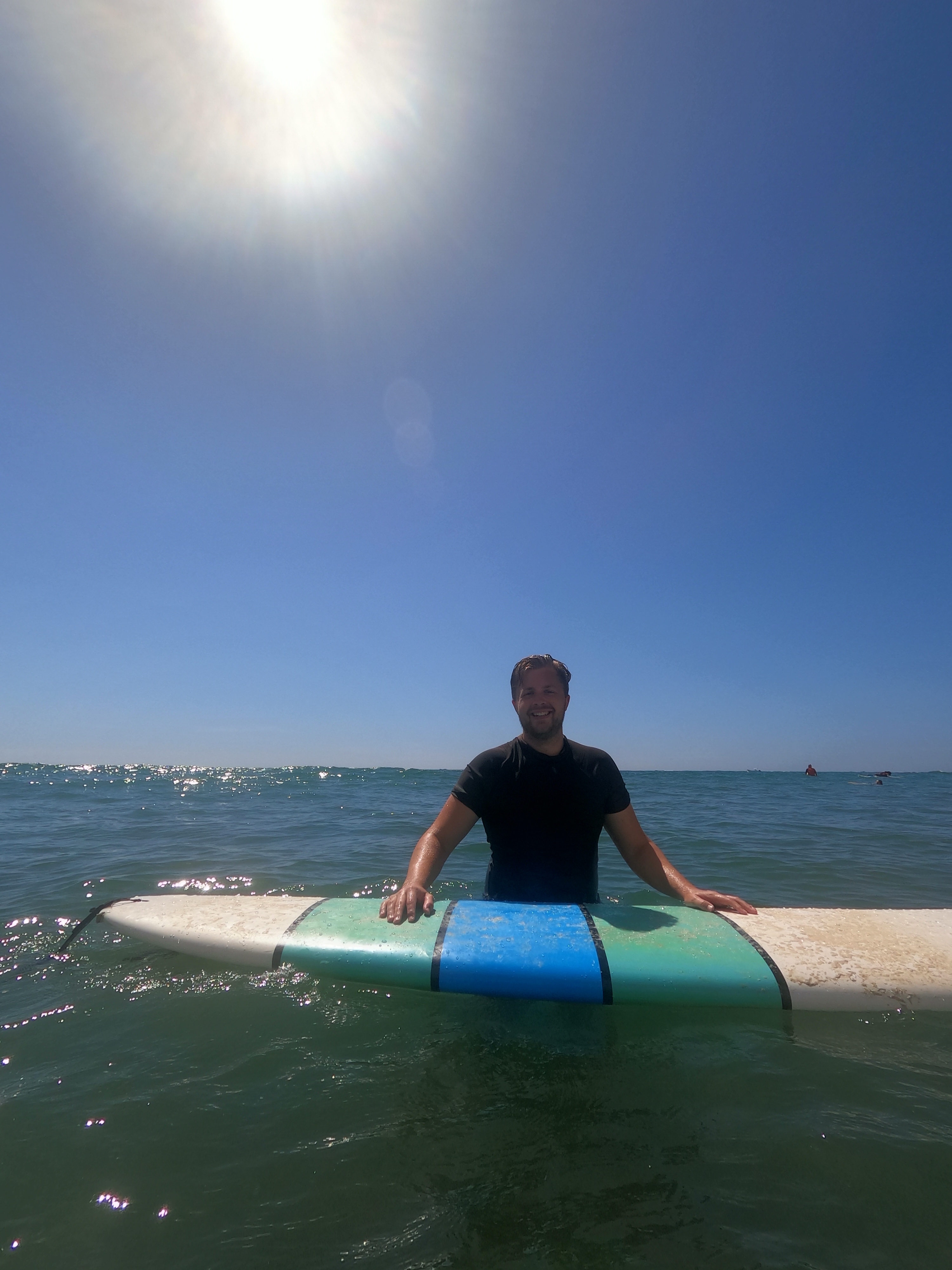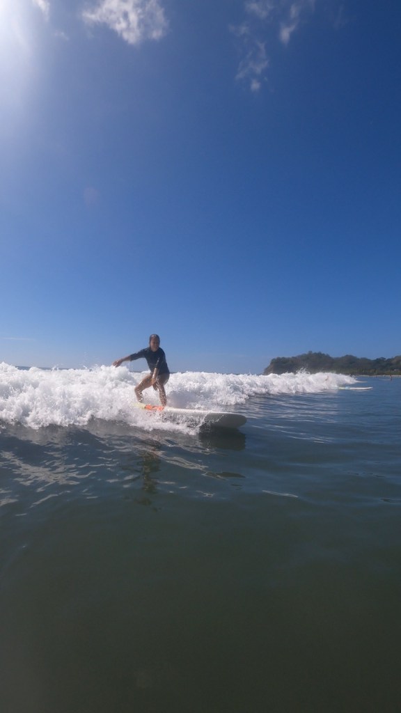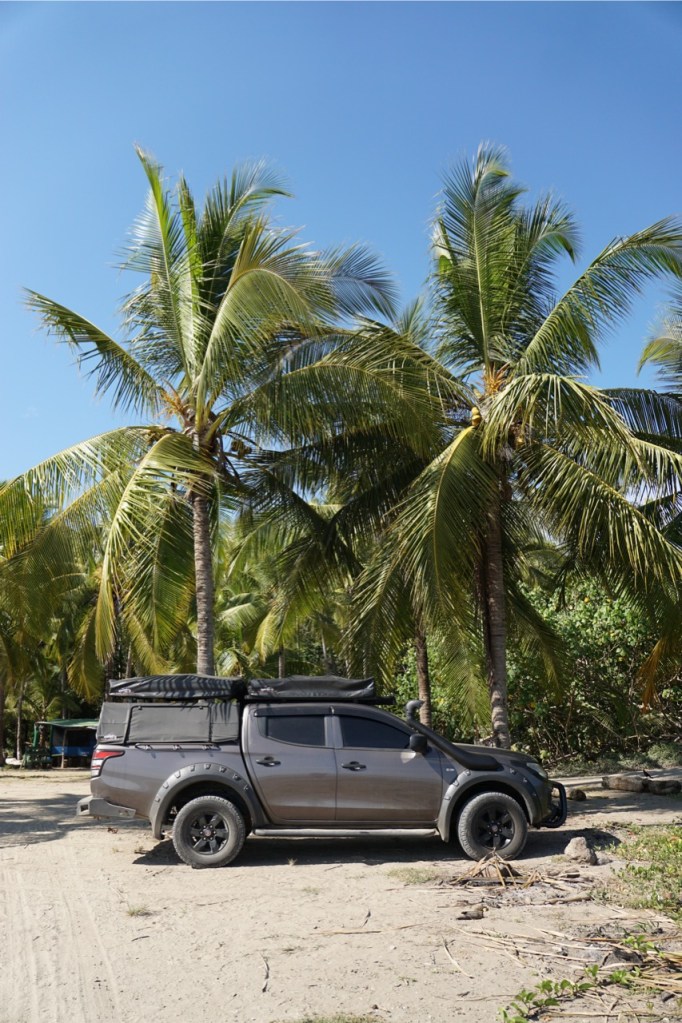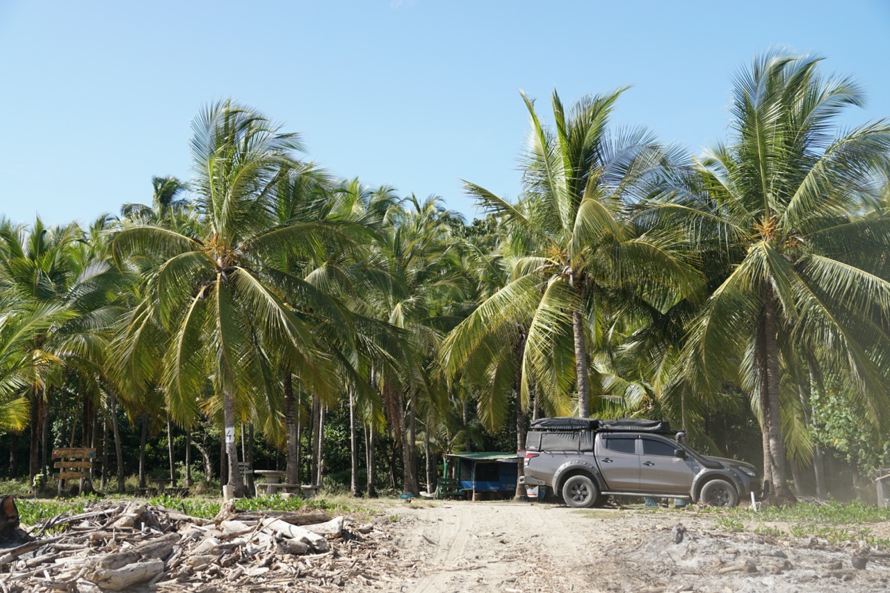 Wir waren, wie zu erwarten, wieder sehr früh wach. Gegen halb sieben verließen wir das Dachzelt, cremten uns gut mit Sonnencreme ein und schlüpften in unsere Badeklamotten. Dann wurden die ausgeliehenen Surfbretter genommen und wir liefen den Strand runter zum Meer. Wir waren die Ersten am ganzen langen Strand, die mit ihren Surfbrettern durch die Wellen glitten. Die Wellen waren zum Surfen wieder etwas besser, und genauso wie erhofft, da es wieder kurz nach der Flut war. Ohne großes Zögern legten wir uns auf die Bretter und standen direkt die erste gute Welle gemeinsam. Die Sonne war zum Glück noch nicht so kräftig, sondern noch ausgesprochen angenehm. Mit der Kombination des Wassers, vor der wunderschönen Strand-Palmen-Aussicht, war das ein wundervoller Start in den Tag! Nach ungefähr anderthalb Stunden stiegen wir aus den Wellen und gaben unsere geliehenen Boards wieder ab. Dann wurde es Zeit für das Frühstück, dieses hatten wir schließlich ausgelassen, um uns direkt in die Wellen stürzen zu können. Im Anschluss entschieden wir uns dann dafür, keine weitere Nacht hier zu verbringen und stattdessen wieder einen neuen Ort zu erkunden. Also wurden die Sachen gepackt, das Zelt abgebaut und es ging wieder auf die Straße. Inzwischen fing die Sonne auch wieder richtig an zu brennen und wir waren froh im klimatisierten Auto zu sitzen. Selbst Annelie war es deutlich zu warm und beschwerte sich ständig über die Hitze. Womöglich haben wir auch einfach etwas zu viel Sonne am Tag zuvor abbekommen, allerdings ohne Sonnenbrand.