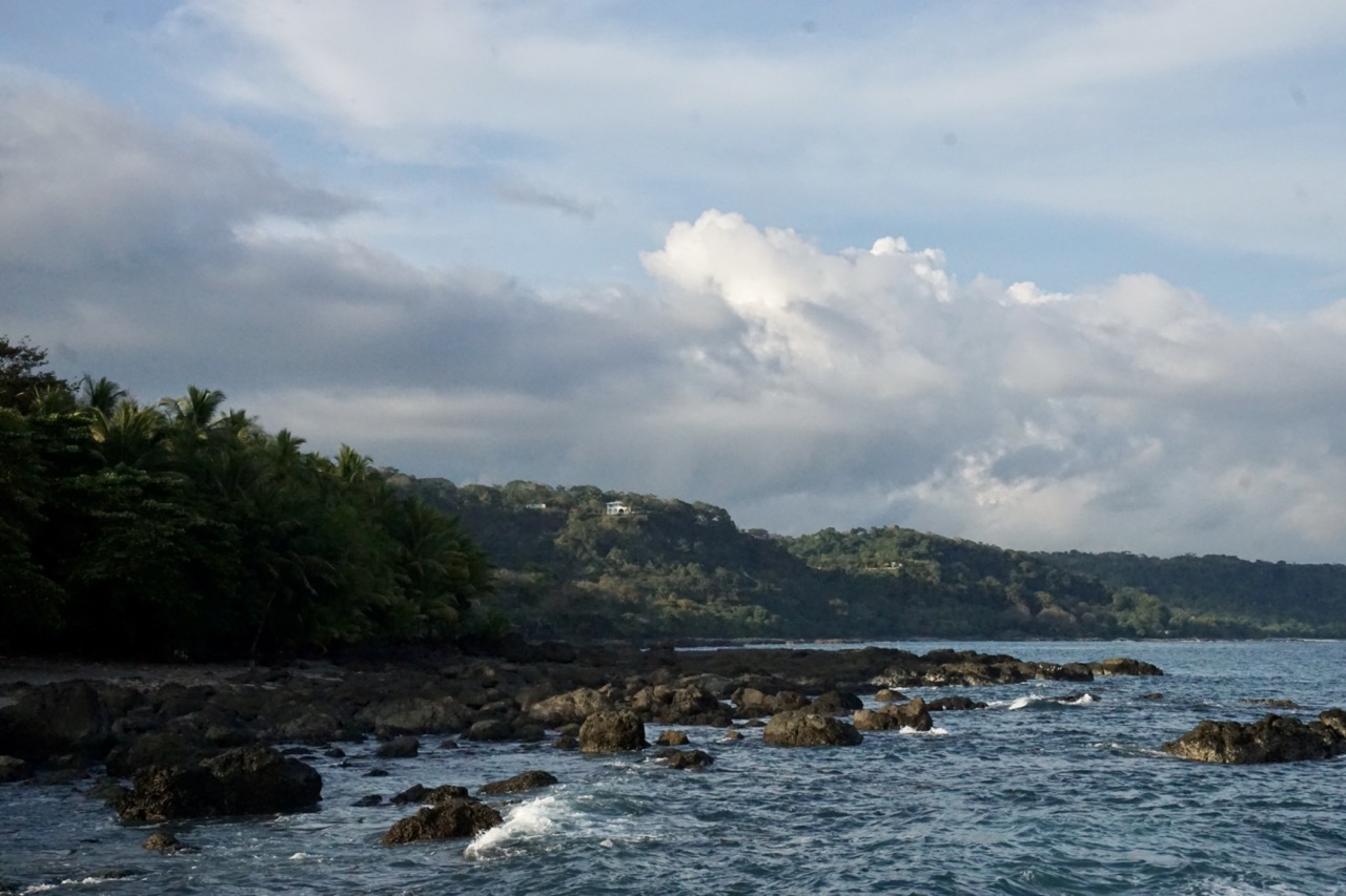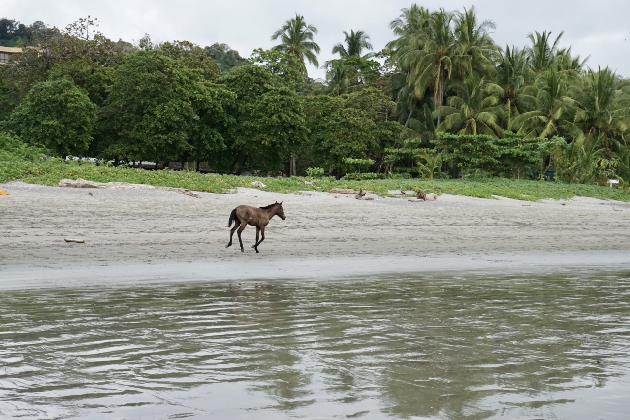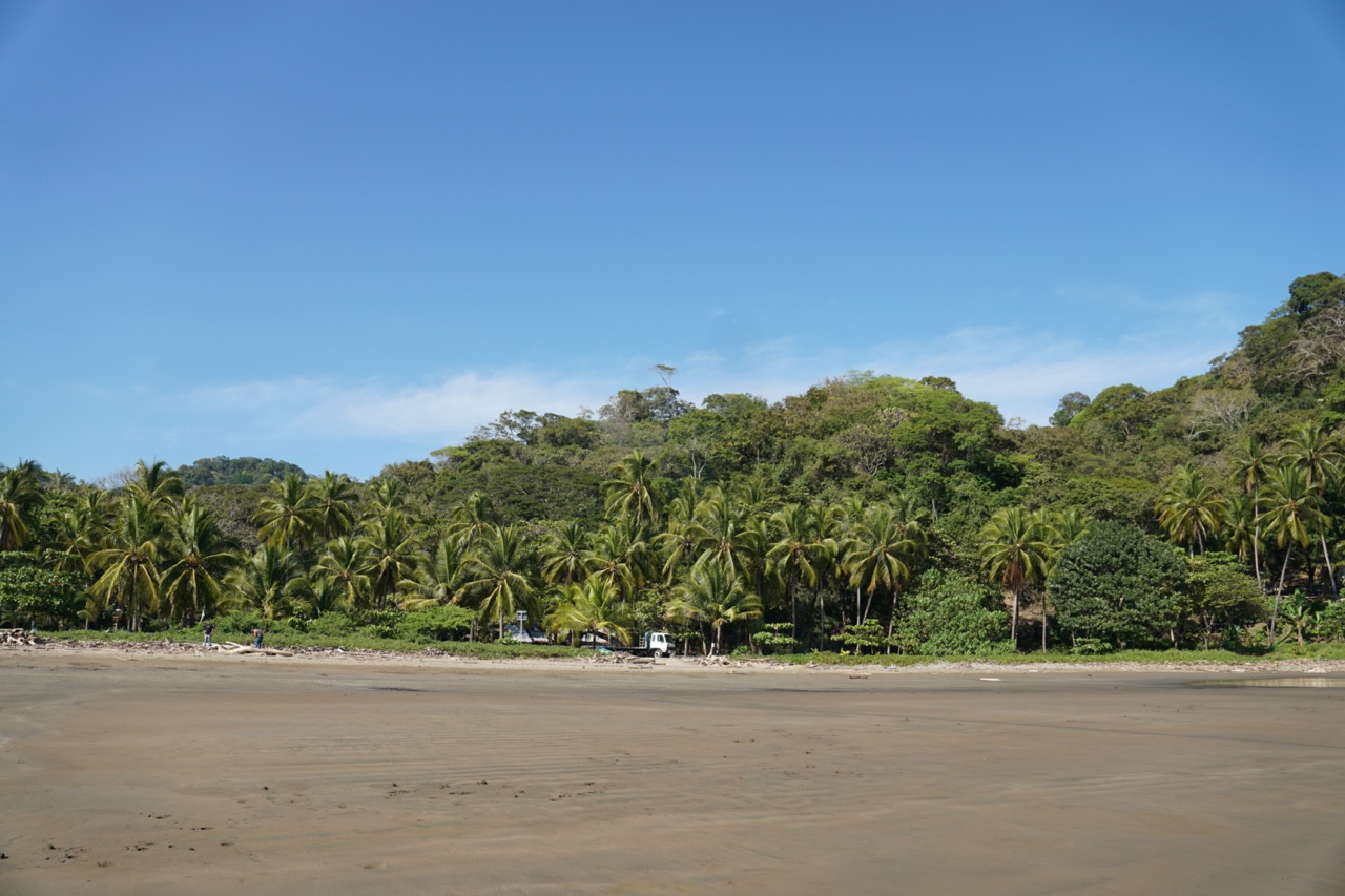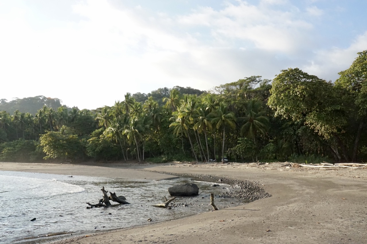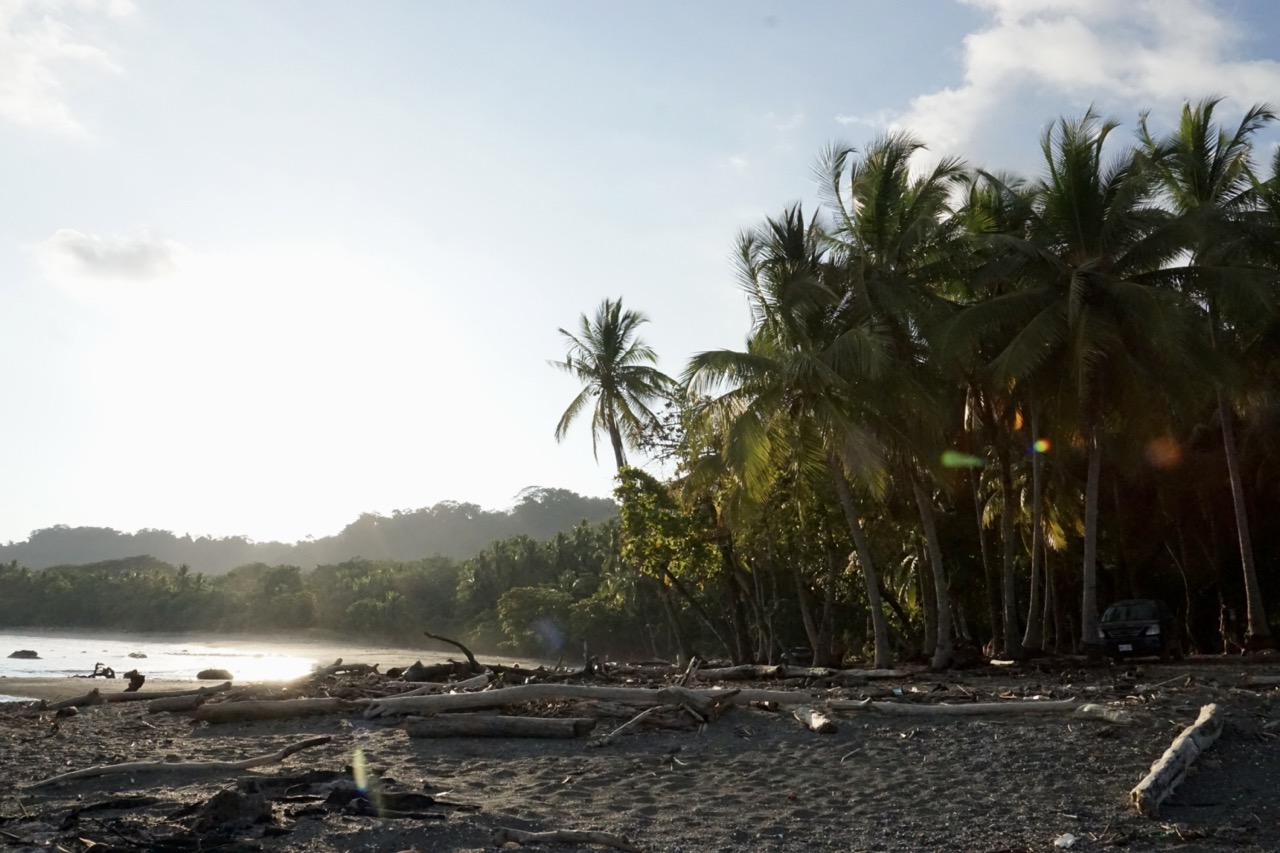 Nach der heißen Wanderung suchten wir noch Abkühlung im Meer. Zu dem Refuge gehört nämlich auch eine Bucht mit großem, dunklen Sandstrand. Eigentlich hatte Hendrik gehofft, noch ein wenig Unterwasserwelt erkunden zu können, doch das flache, trübe Wasser machte eine gute Sicht unmöglich. Abkühlung brachte das Wasser trotzdem. Nach unserem Vormittagsausflug machten wir uns dann auf den Weg nach Montezuma, ein kleines Dörfchen etwas weiter südlich. Nach einem kurzen Bummel durch die eine kurze Straße des Örtchens beschlossen wir, unser Lager etwas außerhalb aufzustellen. Wir fanden ein sehr tolles Plätzchen zwischen großen Kokospalmen am Strand.