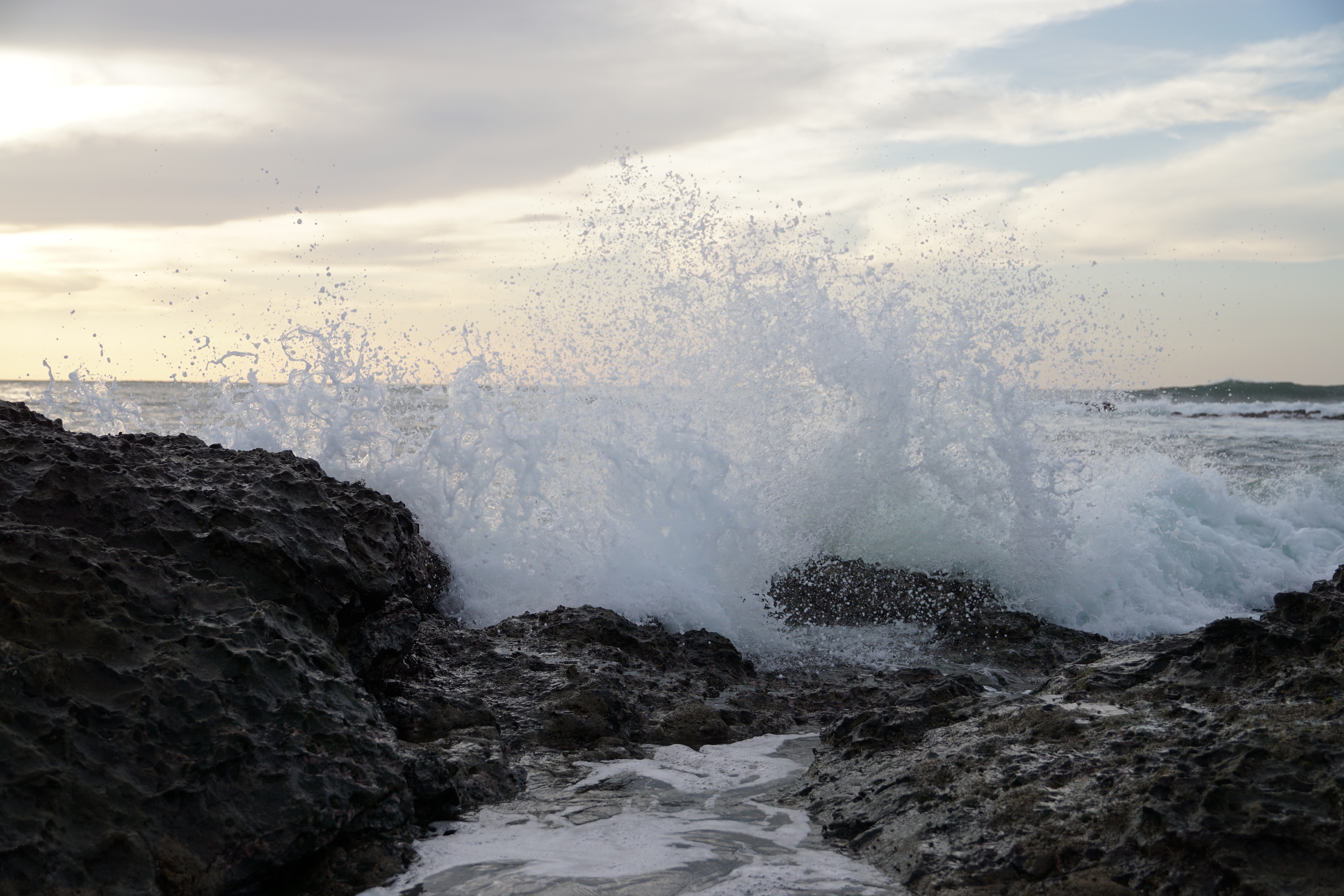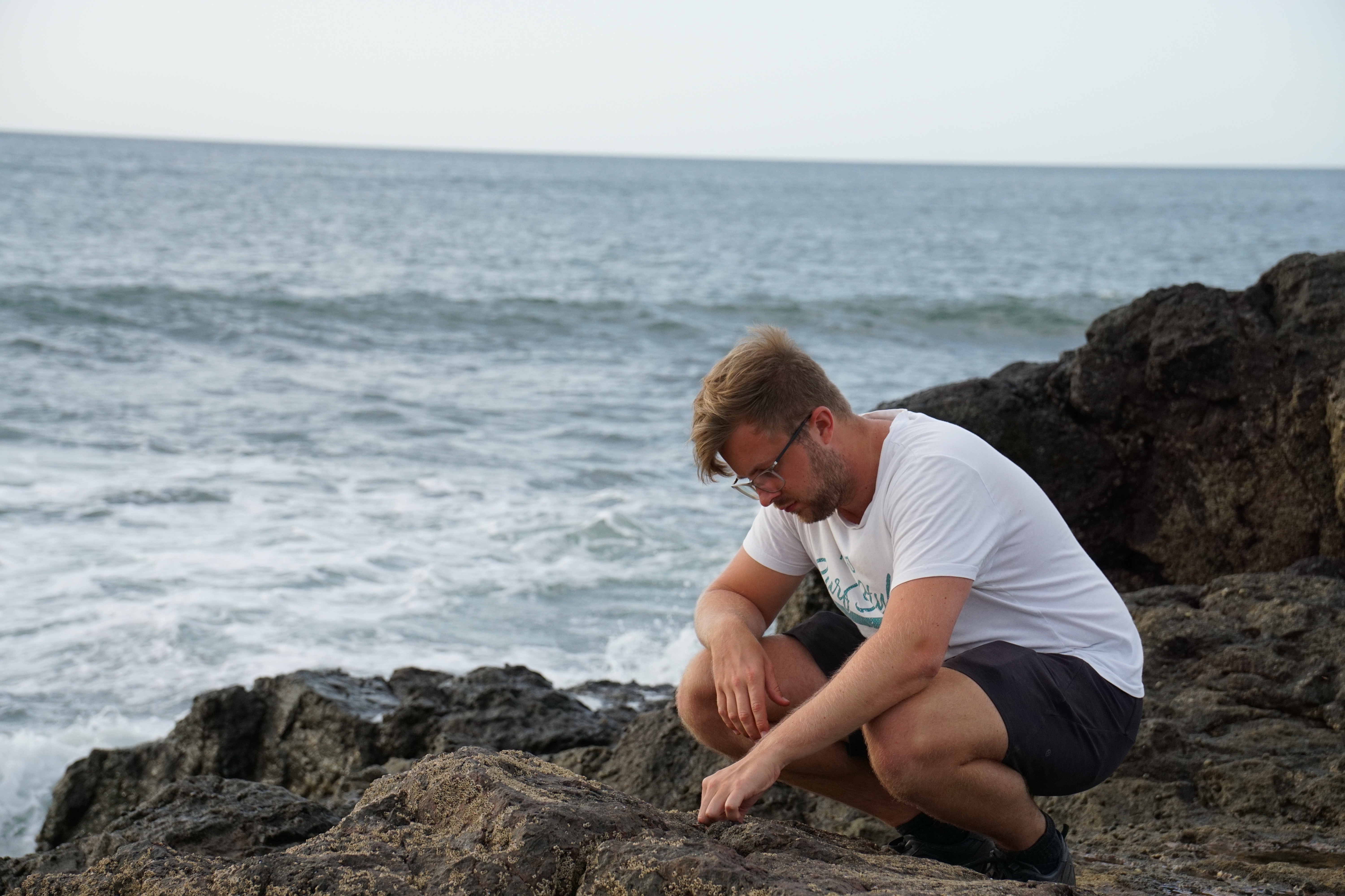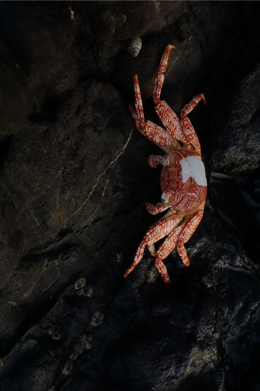 Als wir auf Höhe des Camping-Platzes waren, entschieden wir uns noch weiter den Strand entlangzulaufen. An den Felsen konnten wir dann noch die Wellen beobachten, wie sie langsam, mit zunehmender Flut, stärker wurden und sehr schön anzusehend an den Felsen brachen. Die Sonne ging langsam unter und wir wanderten noch kurz umher. In den Gezeiten-Pools konnte man wunderschöne kleine eigene Welten voller Leben bestaunen. Sowohl kleine Fische, als auch Krebse, Schnecken und Seesterne lebten dort.