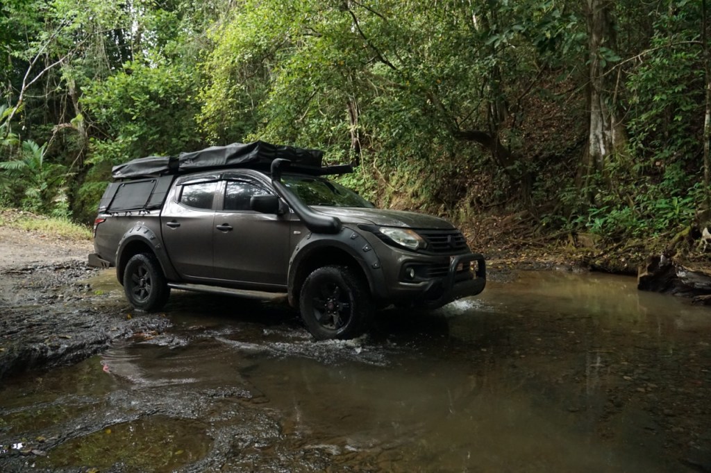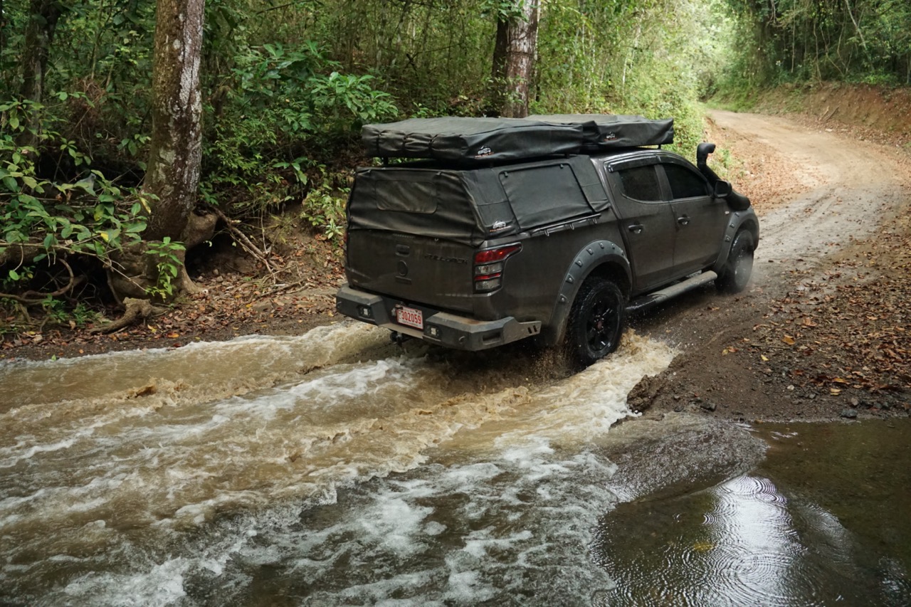 Langsam wird die Straße steiler und löchriger, doch das macht Rallye Hendrik natürlich nichts aus. Hinter einer Bergkuppe dann die erste scharfe Bremsung. Da wo die Straße sein soll, ist ein kleines Flüsschen. Eigentlich sollte Wasser für unser Auto kein Problem sein und tief sieht der Fluss auch nicht aus. Sicherheitshalber prüft Annelie nochmal den Bach und gibt die Fahrt frei. Mit Schwung geht es durch den Fluss und auf der anderen Seite ohne große Probleme wieder heraus. Die Taufe von Jacky ist somit gemeistert.