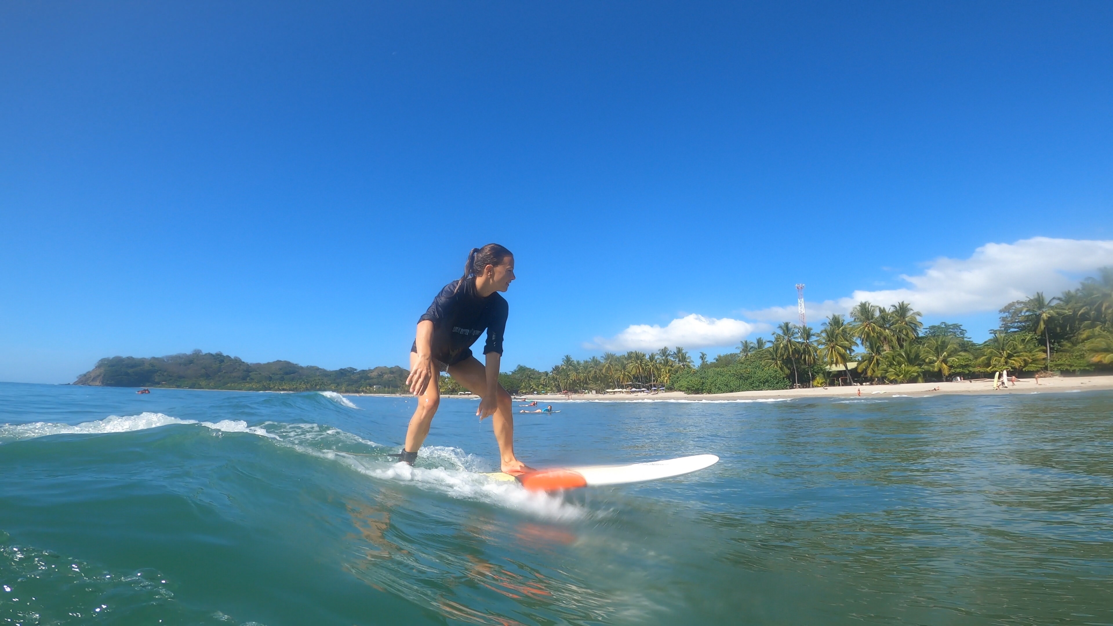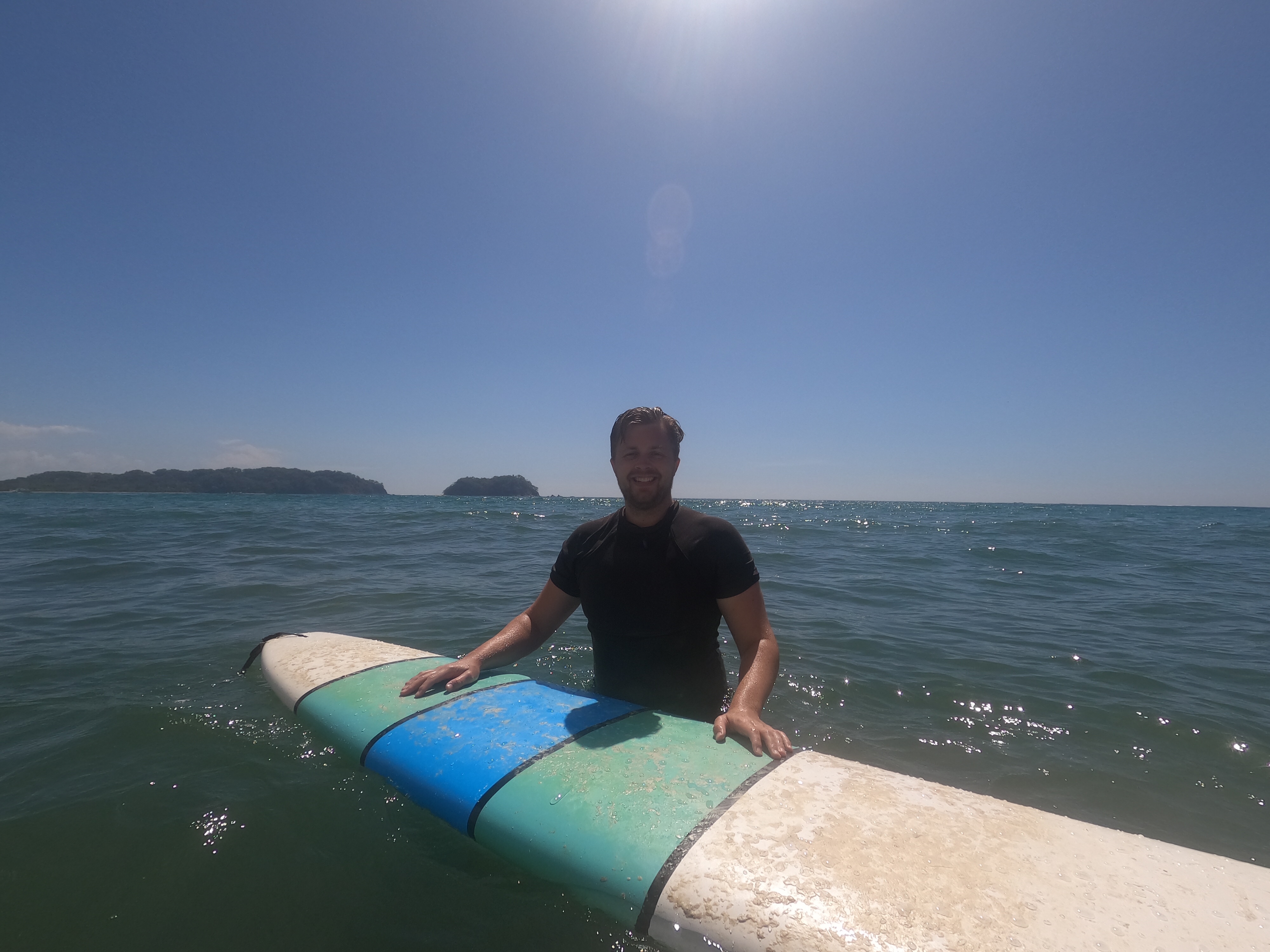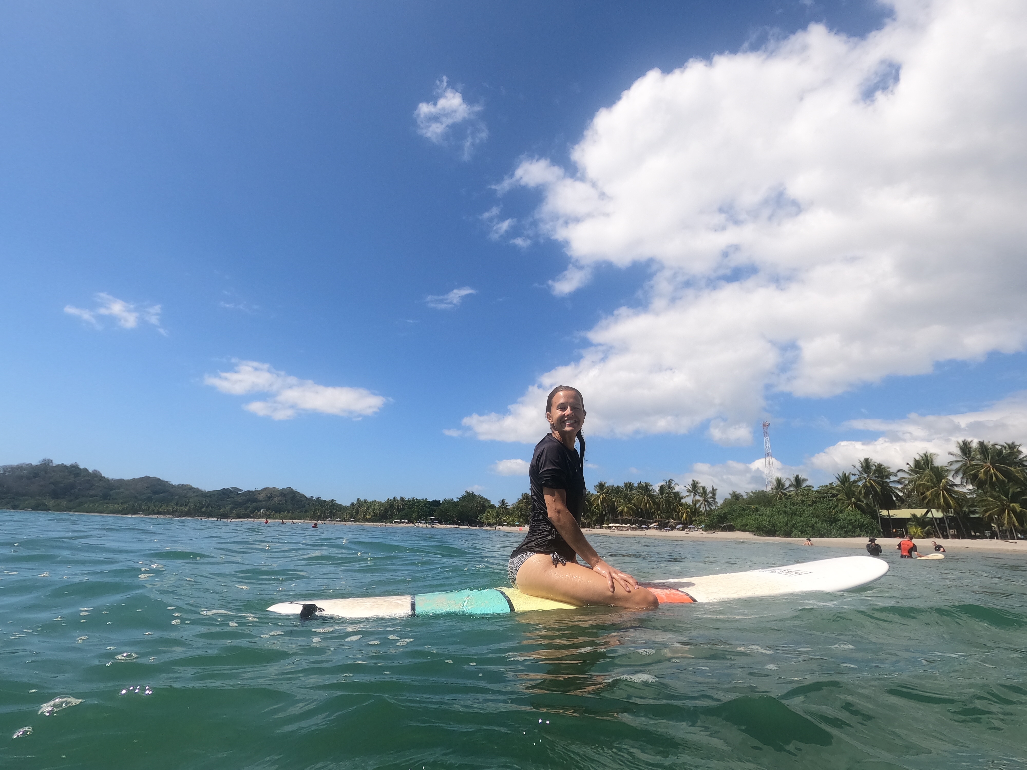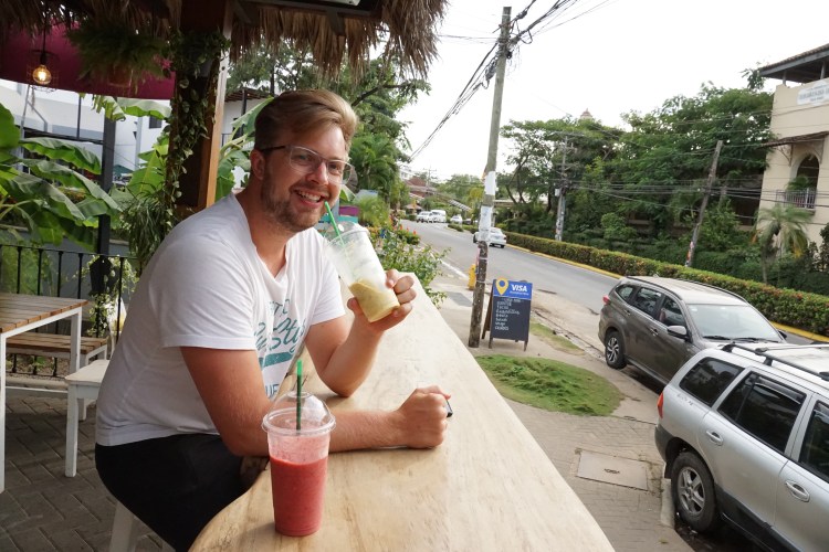 Für den Samstag hatten wir uns einen ganz entspannten Tag vorgenommen. Wir wollten mal so richtig „Pura Vida“ genießen und einfach einen tollen Urlaubstag verbringen. Der Tag startete perfekt mit einem leckeren Frühstück mit Blick auf das Meer. Nach unserem Frühstück liehen wir uns am Surfboardverleih ein paar Surfbretter aus und stürzten uns in die Wellen. Wir sind beide keine Surfprofis und haben eher wenig Erfahrung. Doch trotz ein paar unfreiwilligen Nasenspülungen und Bauchplatschern schafften wir es einige Wellen zu reiten. Angefühlt hat es sich auf jeden Fall, als wären wir Hawaiireif und könnten bald bei den großen Surftourneen mitmachen. Wir hatten sehr viel Spaß uns genossen das kühle Wasser bei den sehr heißen Temperaturen draußen. Samara gilt als recht Anfängerfreundlich, da der Meeresboden nur aus Sand besteht und die Brandung sehr sacht zugeht. Am Samstag wollte das Meer wahrscheinlich besonders sacht sein und brachte nur vereinzelt ein paar surfbare Wellen hervor. Wir hätten wahrscheinlich auch einfach ein Tick eher dran sein müssen.