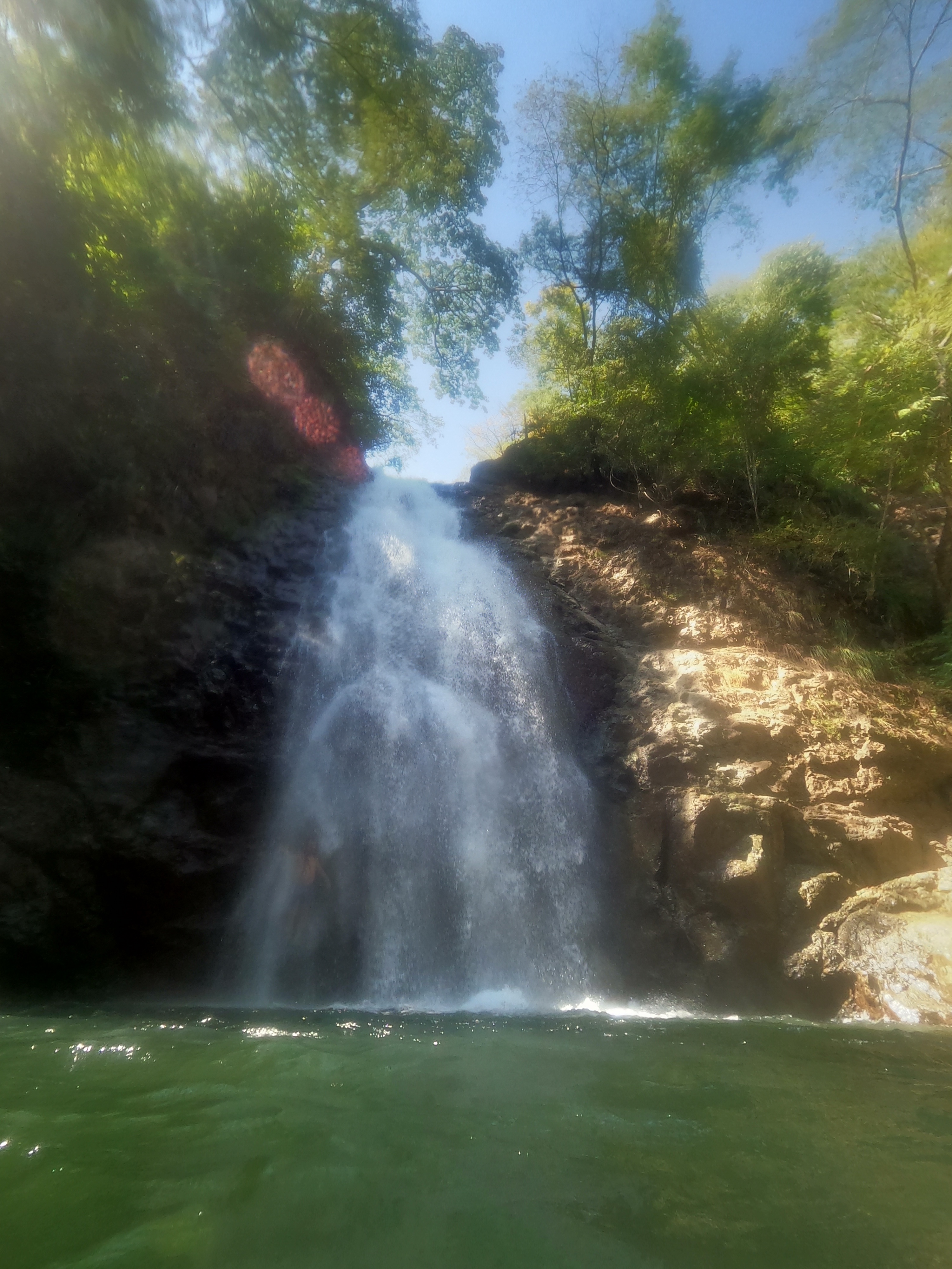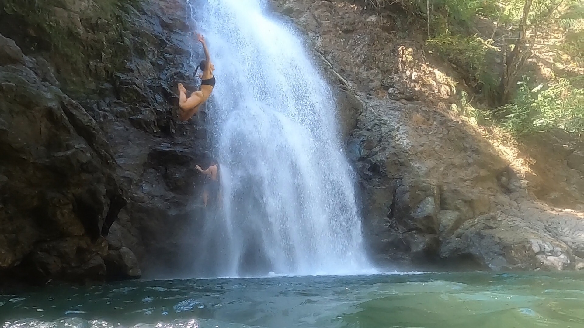 Nach anfänglichem Zögern und Beobachten trauten wir uns dann auch und sprangen mehrere Male von einem ca. 3 Meter hohen Felsen direkt ins Becken des Wasserfalls. Der Weg hinauf war zwar immer wieder beschwerlich, Spaß gemacht hat es aber jedes Mal. Die ganz verrückten Einheimischen springen auch tatsächlich vom oberen Punkt des Wasserfalls (25 m). Wir haben uns wirklich nur gefragt, wie verrückt und vielleicht auch bisschen lebensmüde man sein kann, um das zu tun. Schließlich könnte die Landung sehr unschön werden, springt man nur ein paar Meter zu kurz oder zu weit links/rechts. Doch an dem Tag gab es keinerlei verfehlte Landungen, sondern nur eine Menge Platscher, Spaß und Fotos.