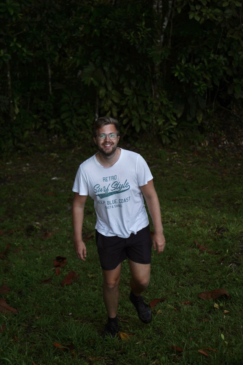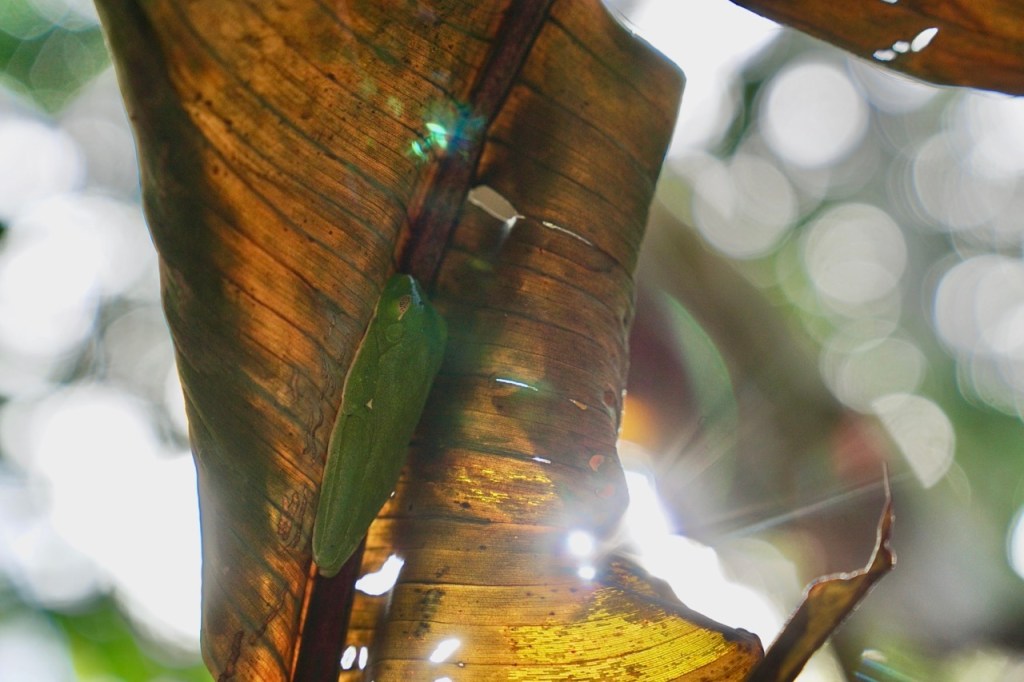 Nach einigen Metern hielten wir an und unser Guide meinte, wir sollen mal nach einem Frosch suchen, der sich hier versteckt. Ein grüner, kleiner Frosch im grünen, großen Dschungel. Dagegen ist jedes Wimmelbuch ein Klacks. Der Guide freute sich sehr darüber, dass seine List aufgegangen war und zeigte uns dann irgendwann den Frosch. Unter einem braunen Blatt hatte er sich kaum erkennbar zusammengekauert und verbrachte da sein Mittagsschläfchen.