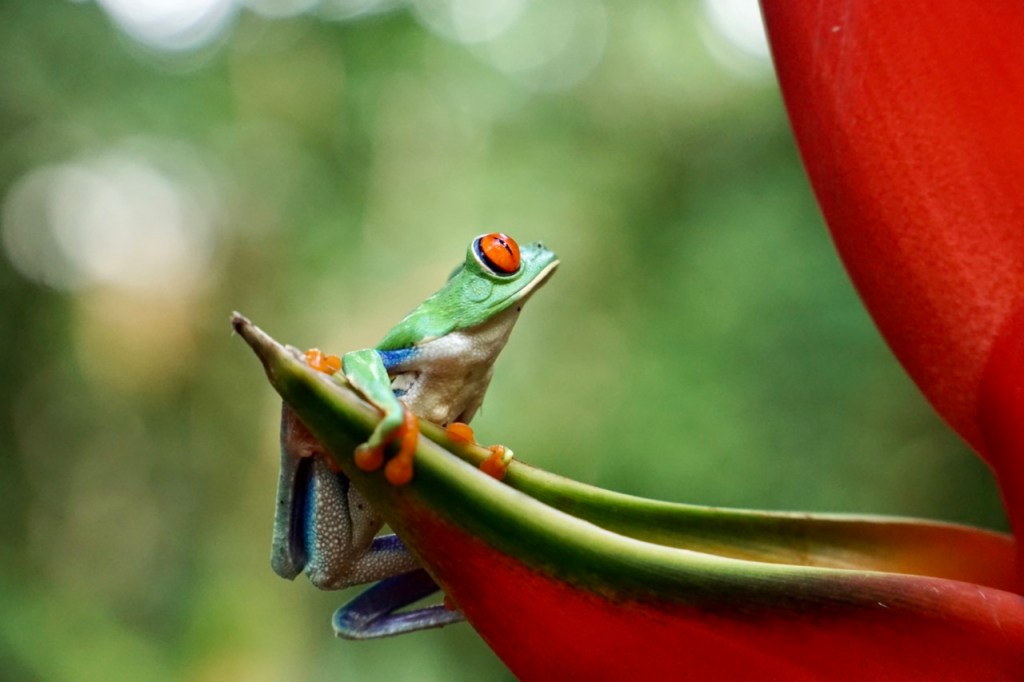 Uns wurde noch erklärt, dass man eigentlich keine Tiere in Costa Rica anfassen darf, für uns machte der Guide jedoch eine Ausnahme, wir sollen es nur nicht erzählen… Das kann man jetzt natürlich ein bisschen kritisch betrachten, sind diese Regeln doch gar nicht so unnütz. Er holte den Frosch also aus seinem Blatt heraus und so bekamen wir die Möglichkeit den Kleinen in seiner vollen Pracht zu sehen. Wie ein kleines Model setzte er sich perfekt ins Licht auf eine Blüte und posierte für ein Foto. Nach ein paar Minuten sorgte der Guide jedoch wieder dafür, dass der Frosch an seinen geschützten Platz zurückkommt und jetzt hoffentlich ungestört weiter schlafen kann. Auf den Frosch folgte ein noch schweres Suchspiel. Eine perfekt getarnte Echse versteckte sich einige Meter von uns entfernt in den Bäumen. Auch wenn wir es versuchten, war es hier quasi unmöglich ein Foto des Tieres zu erhaschen.