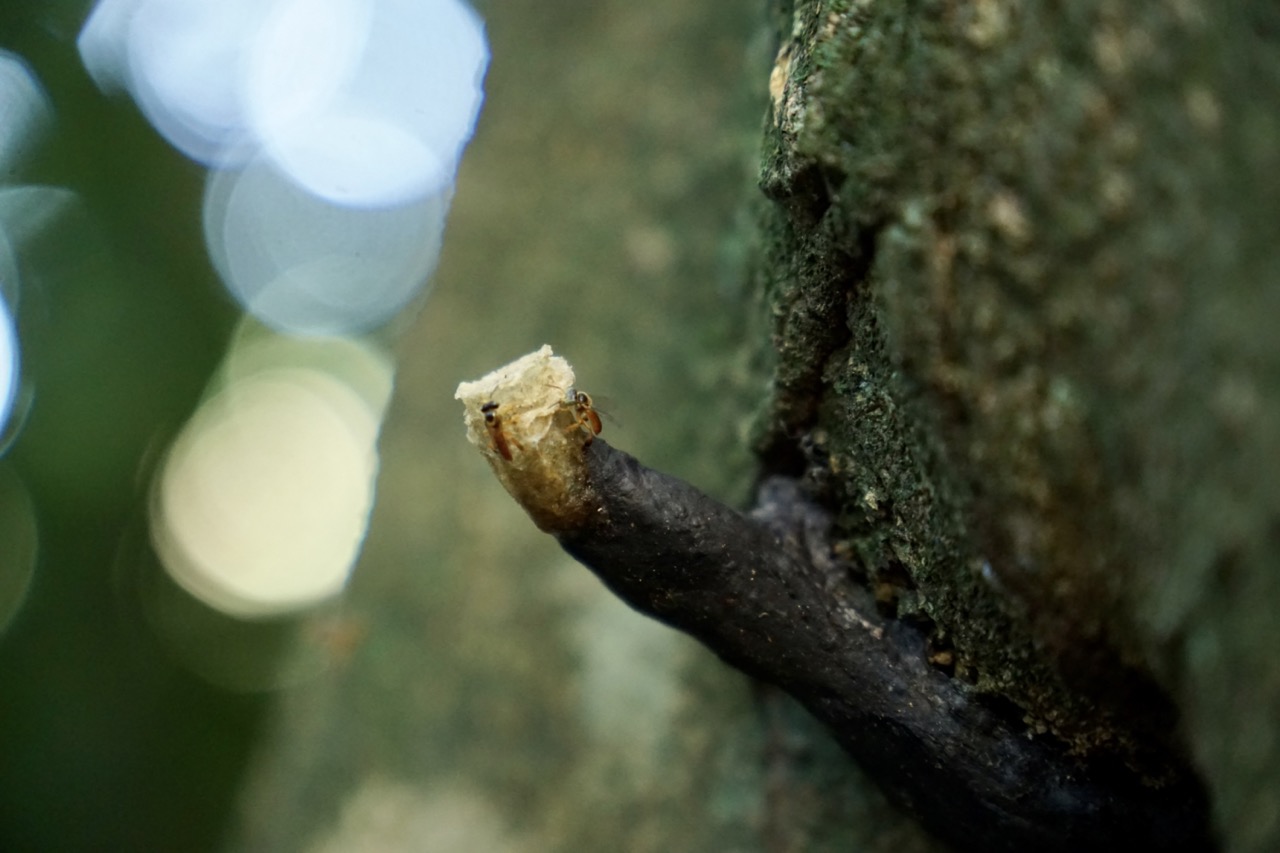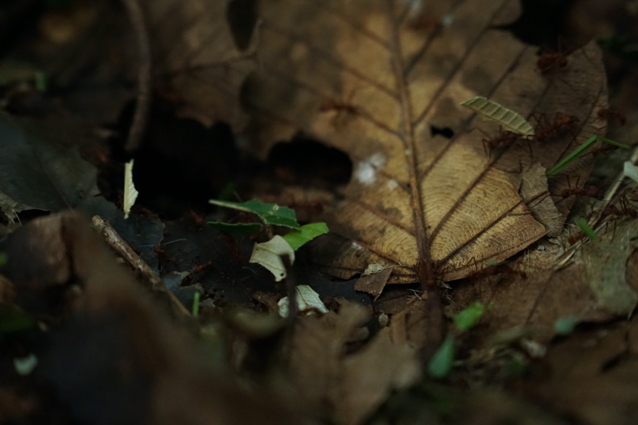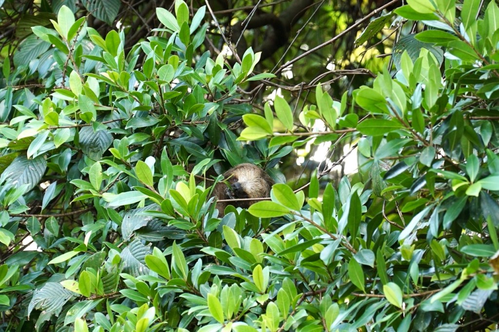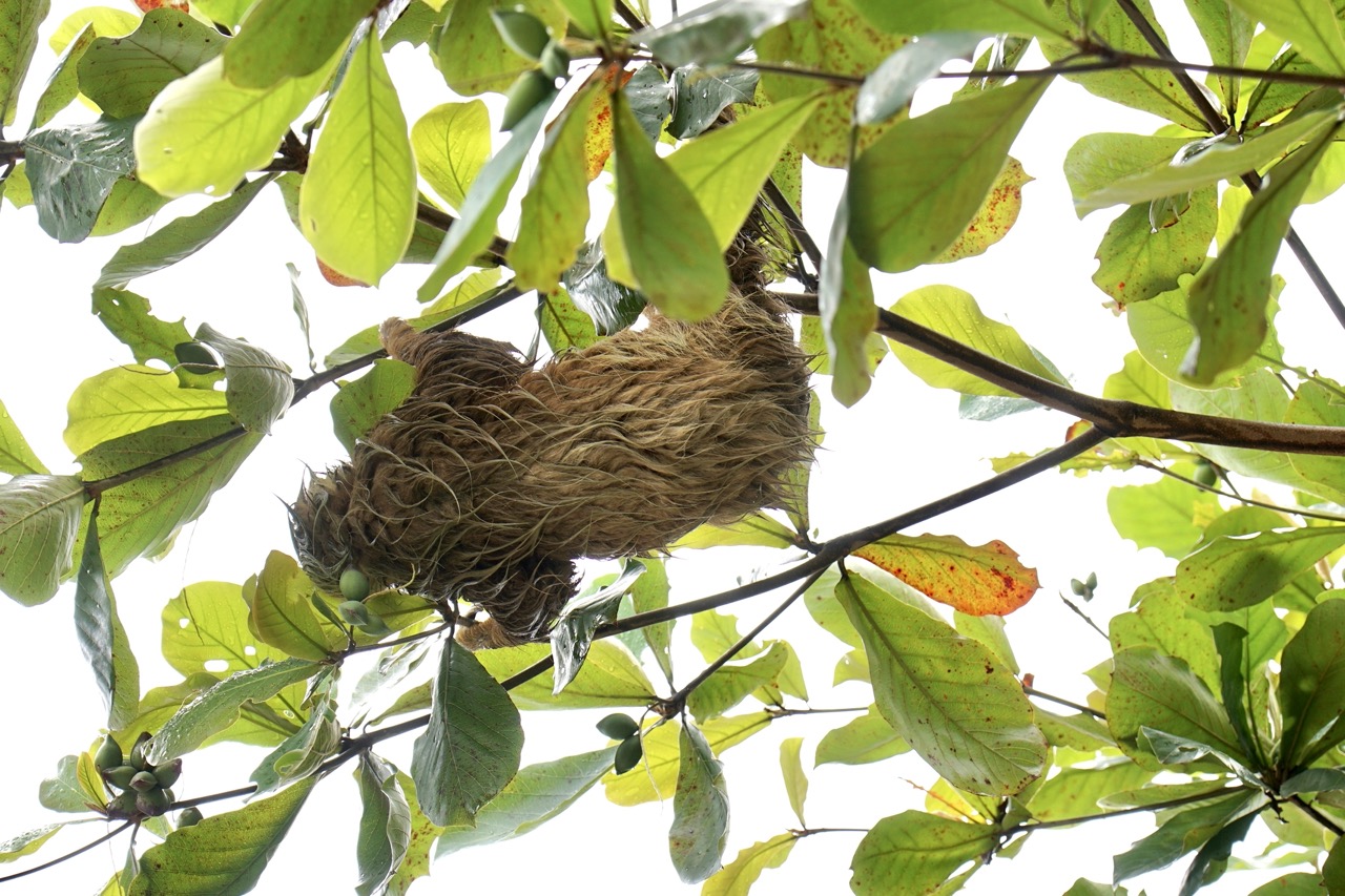 Auf unserem weiteren Weg begegneten wir fleißigen Ameisenvölkern, die ihren Bau mit allerlei Blättern versorgten, Mini Honigbienen, die in einem großen Baum lebten und dann endlich sahen wir auch unser erstes Faultier. Wie eine fette, dunkle Kugel hockte es im Baum und war für ein ungeschultes Auge nicht zu erkennen. Mit der Zeit wachte es dann langsam auf und begann ein paar Blätter zu pflücken und zu essen. Wir lernten, dass es hier im Park zwei verschiedene Faultiere gab. Sie unterscheiden sich anhand ihrer Füße. Das Zweifinger-Faultier ist ein wenig agiler als das Dreifinger-Faultier, besitzt eine andere Gesichtsform und unterscheidet sich z.B. in der Länge der Austragung und allgemeinen Lebensweise. Wir hatten das Glück, alle beiden Arten auf unserer Tour zu sehen.
