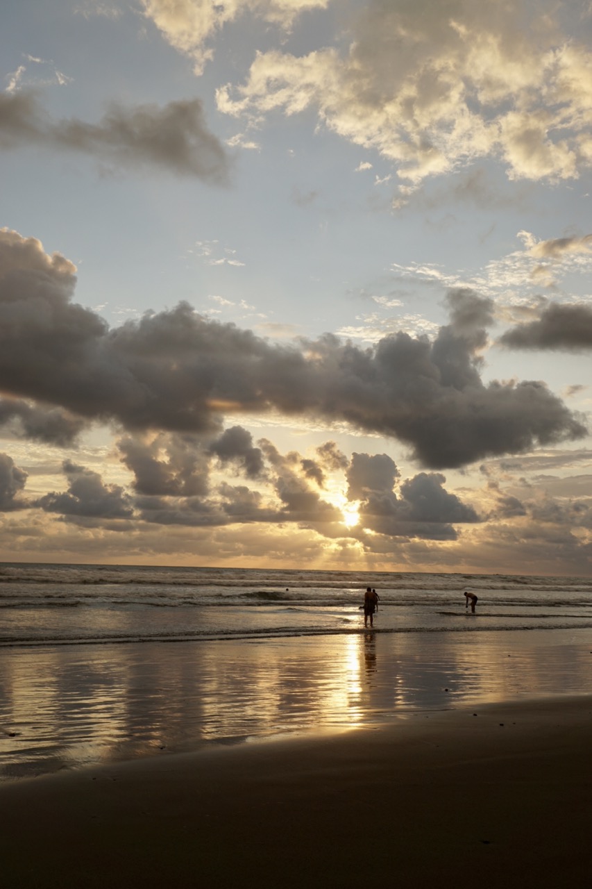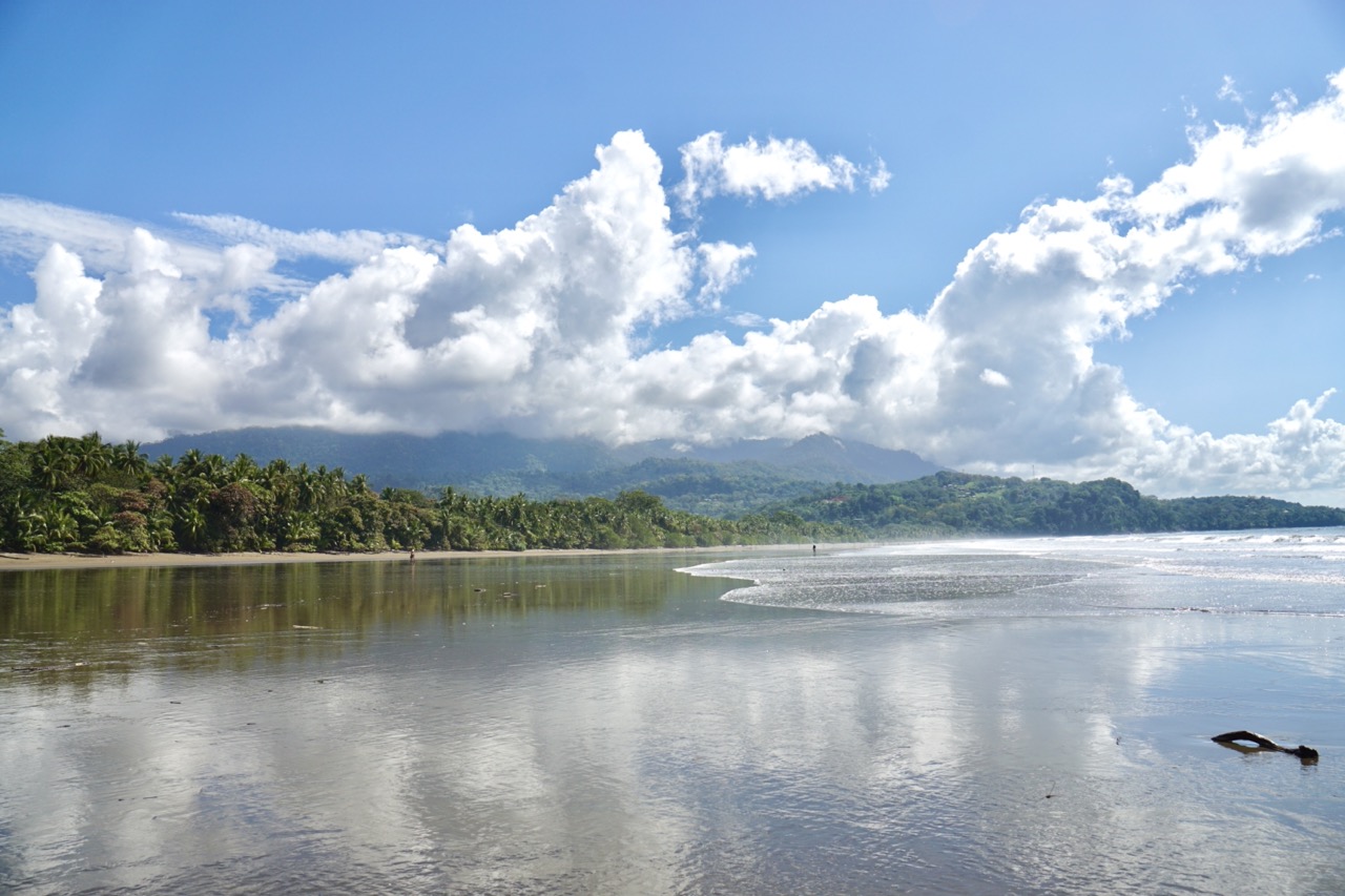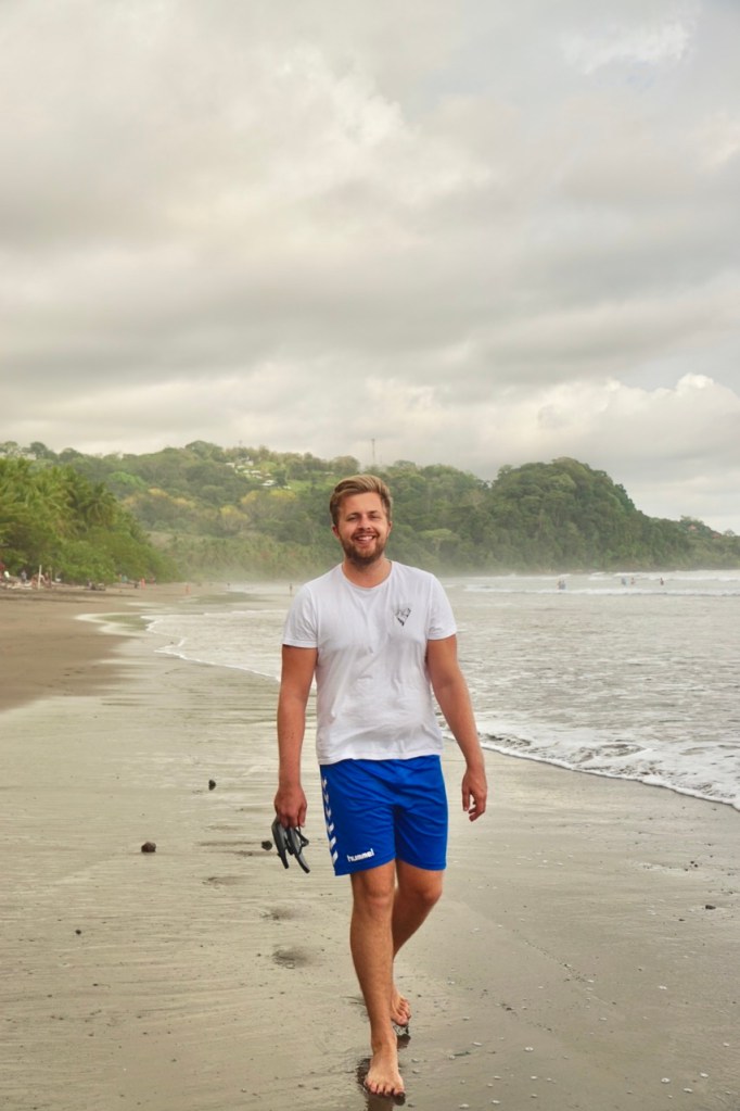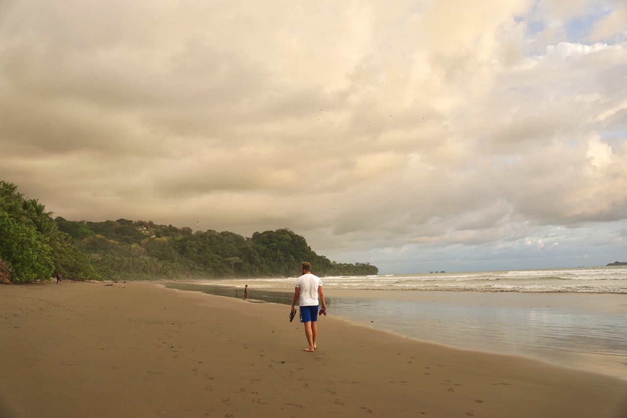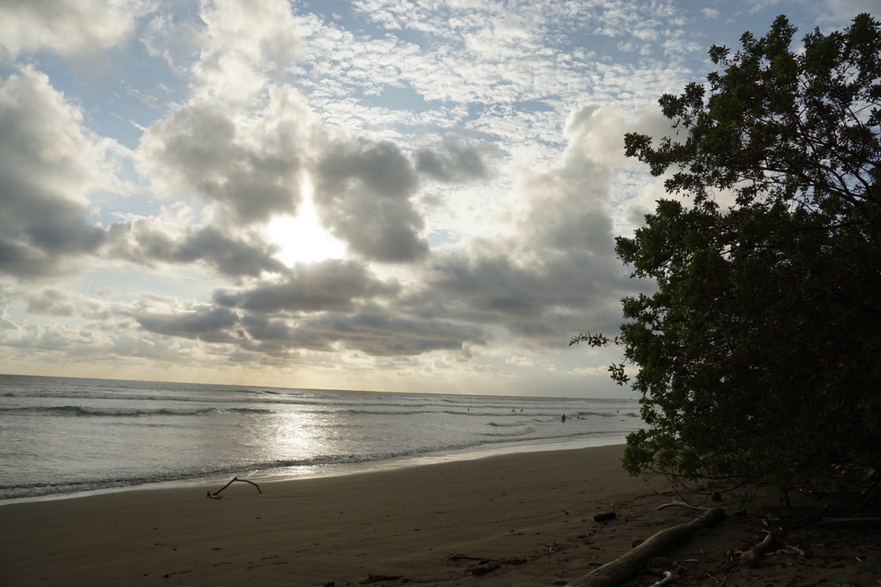 Hörbuch an, anschnallen und los geht die wilde Fahrt. Das Navi zeigte uns eine Fahrzeit von ungefähr fünf Stunden an und wir wussten aus der Erfahrung, dass man da meist noch etwas Zeit hinzuaddieren muss. Nach etwas mehr als vier Stunden Fahrt, über die kurvenreichen Bergstraßen Costa Ricas, freuten wir uns dann, als wir die ersten blauen Flecken am Himmel sahen und dann sogar kurz die Sonne. Dann kam das Meer wieder zum Vorschein und unsere Laune wurde schlagartig wieder so richtig gut. Wir erreichten schließlich unseren Schlafplatz. Ein kleiner gemütlicher Campingplatz, wo wir die kommenden zwei Nächte verbringen wollen. Nachdem wir uns ausgebreitet haben, ging es erstmal den nahegelegenen Strand erkunden.