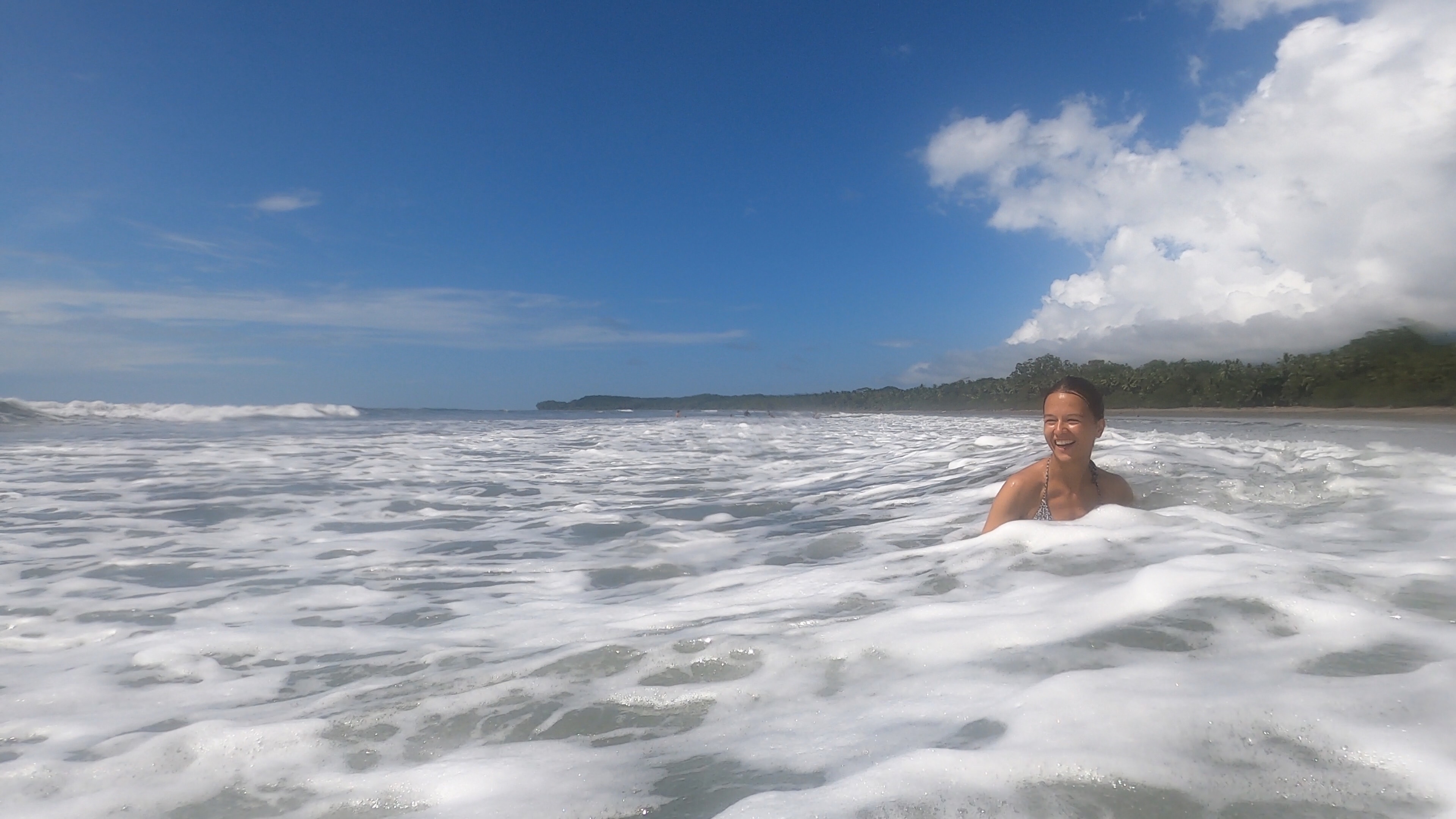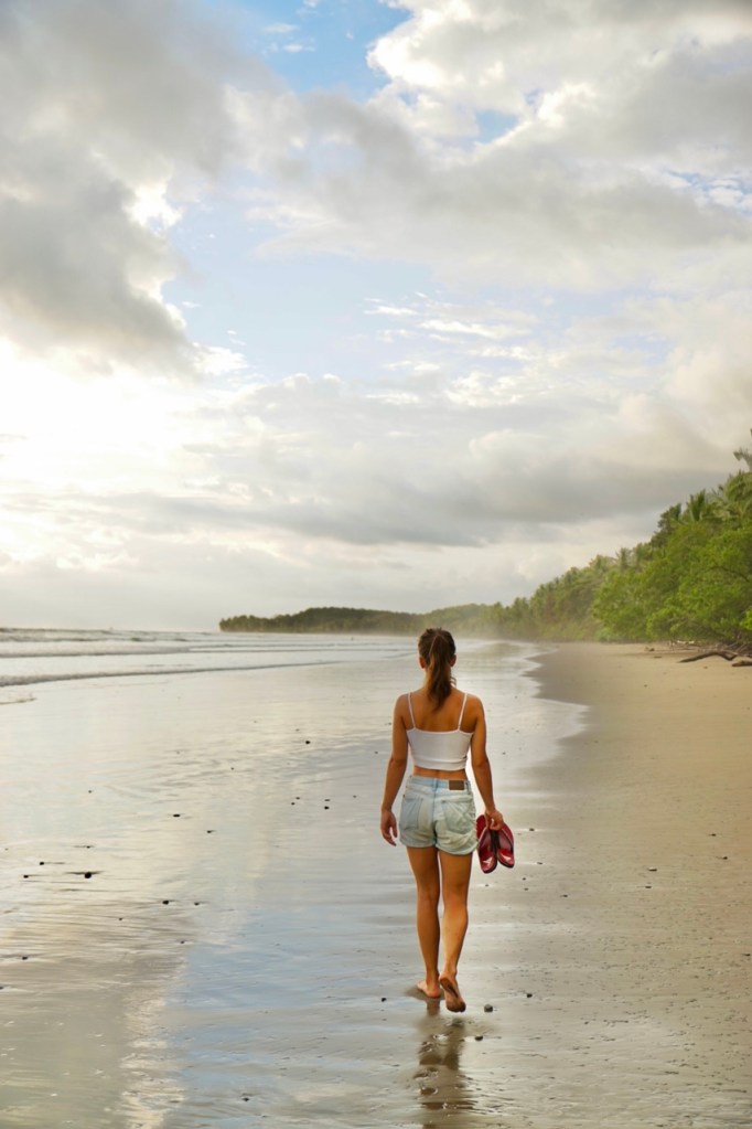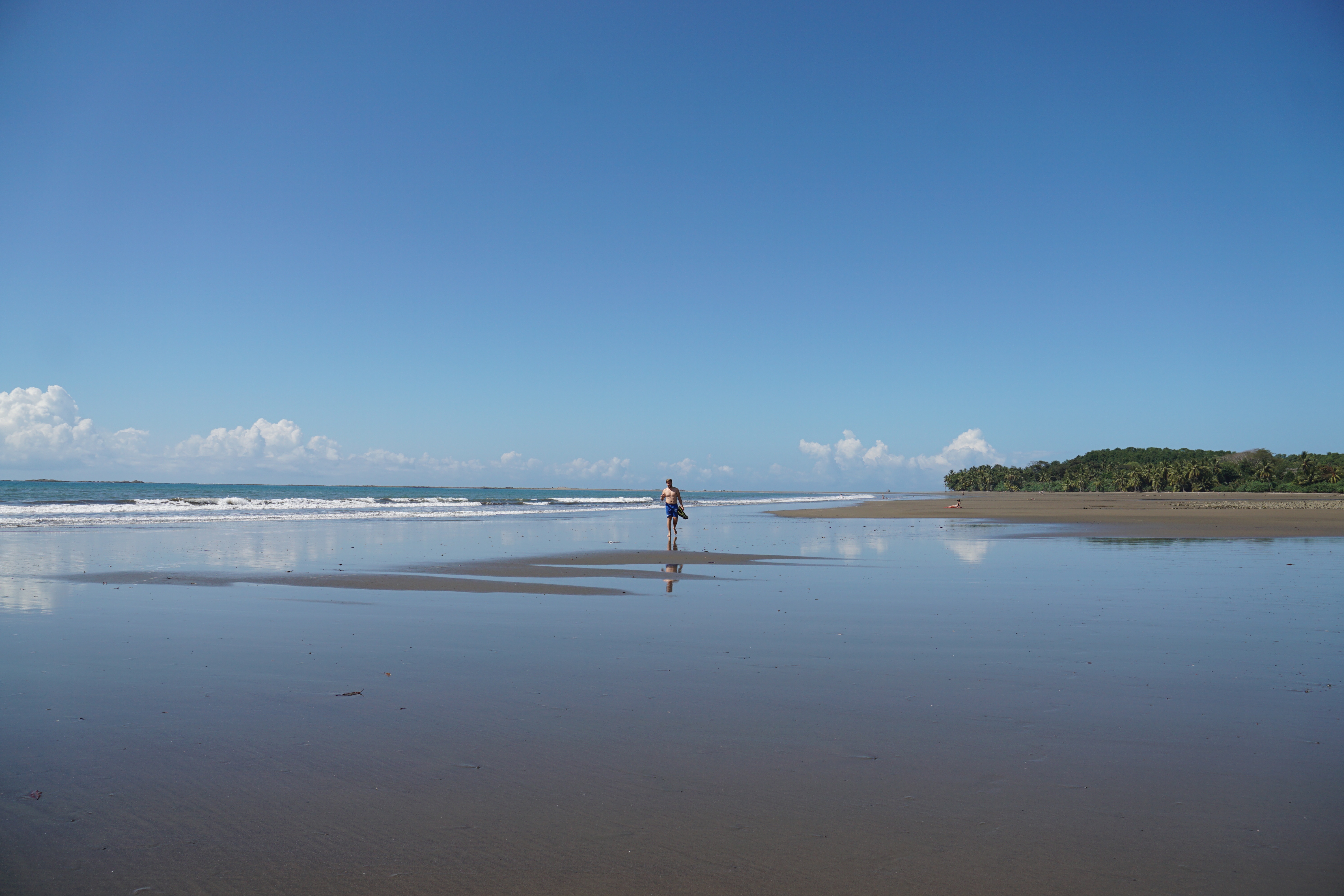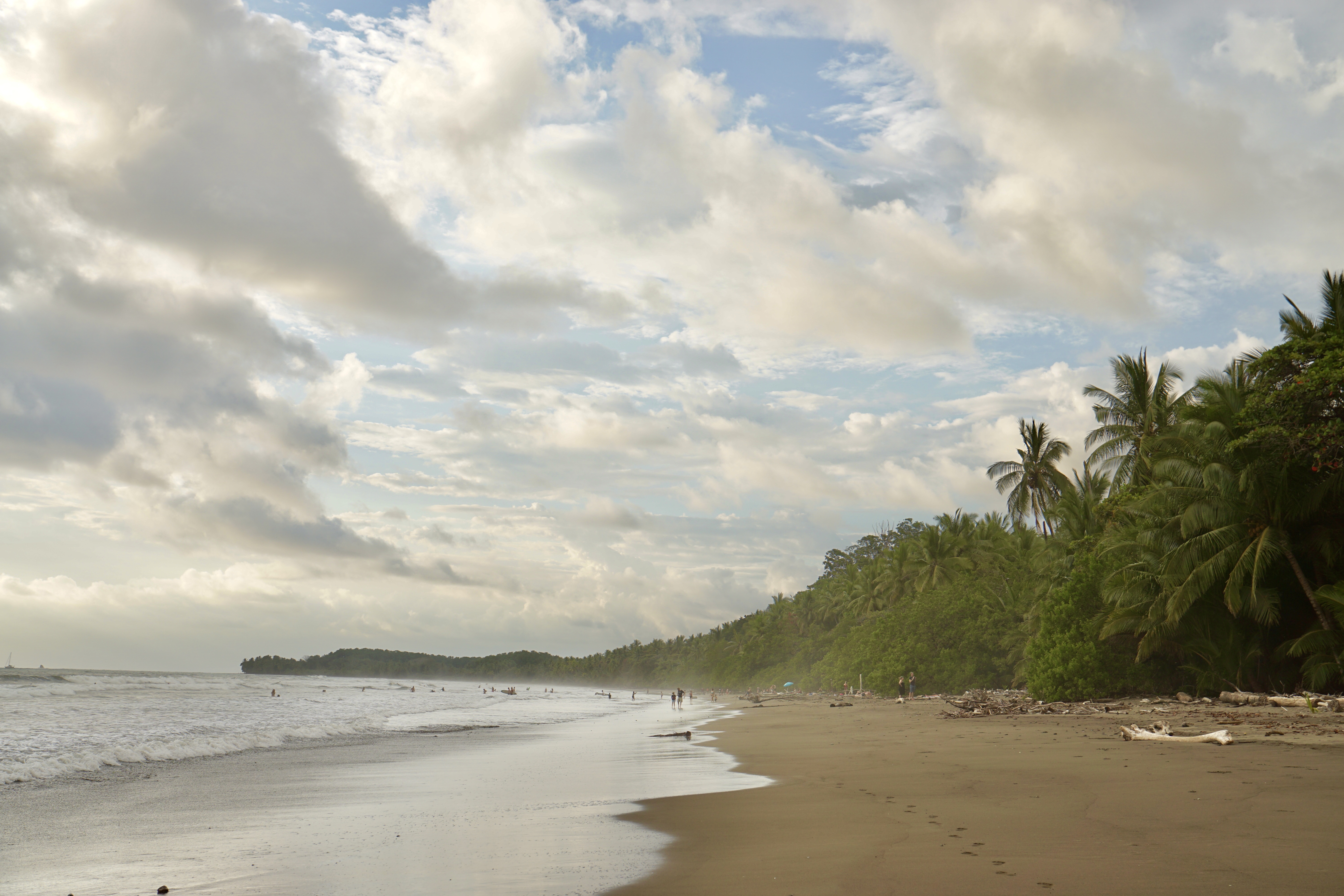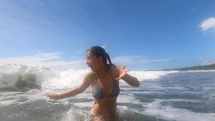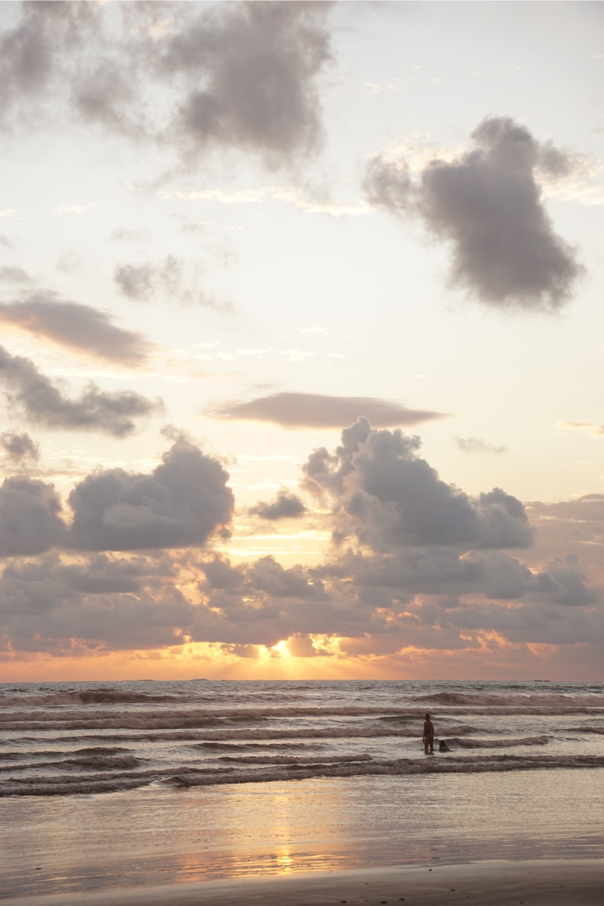 Hörbuch an, anschnallen und los geht die wilde Fahrt. Das Navi zeigte uns eine Fahrzeit von ungefähr fünf Stunden an und wir wussten aus der Erfahrung, dass man da meist noch etwas Zeit hinzuaddieren muss. Nach etwas mehr als vier Stunden Fahrt, über die kurvenreichen Bergstraßen Costa Ricas, freuten wir uns dann, als wir die ersten blauen Flecken am Himmel sahen und dann sogar kurz die Sonne. Dann kam das Meer wieder zum Vorschein und unsere Laune wurde schlagartig wieder so richtig gut. Wir erreichten schließlich unseren Schlafplatz. Ein kleiner gemütlicher Campingplatz, wo wir die kommenden zwei Nächte verbringen wollen. Nachdem wir uns ausgebreitet haben, ging es erstmal den nahegelegenen Strand erkunden.