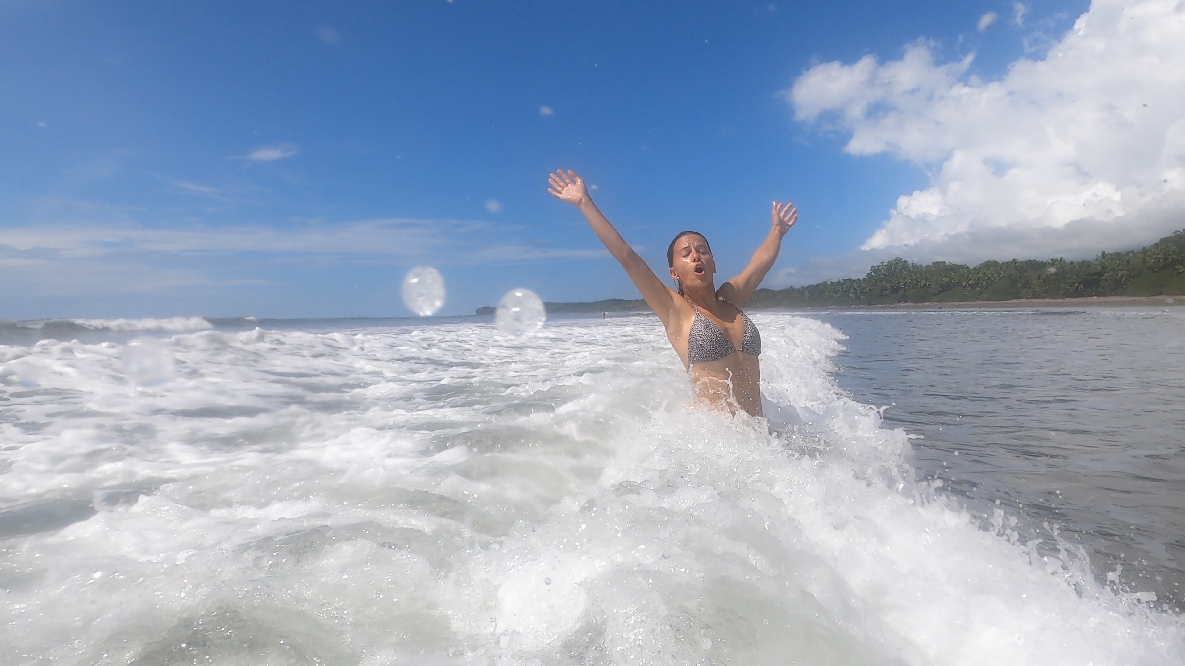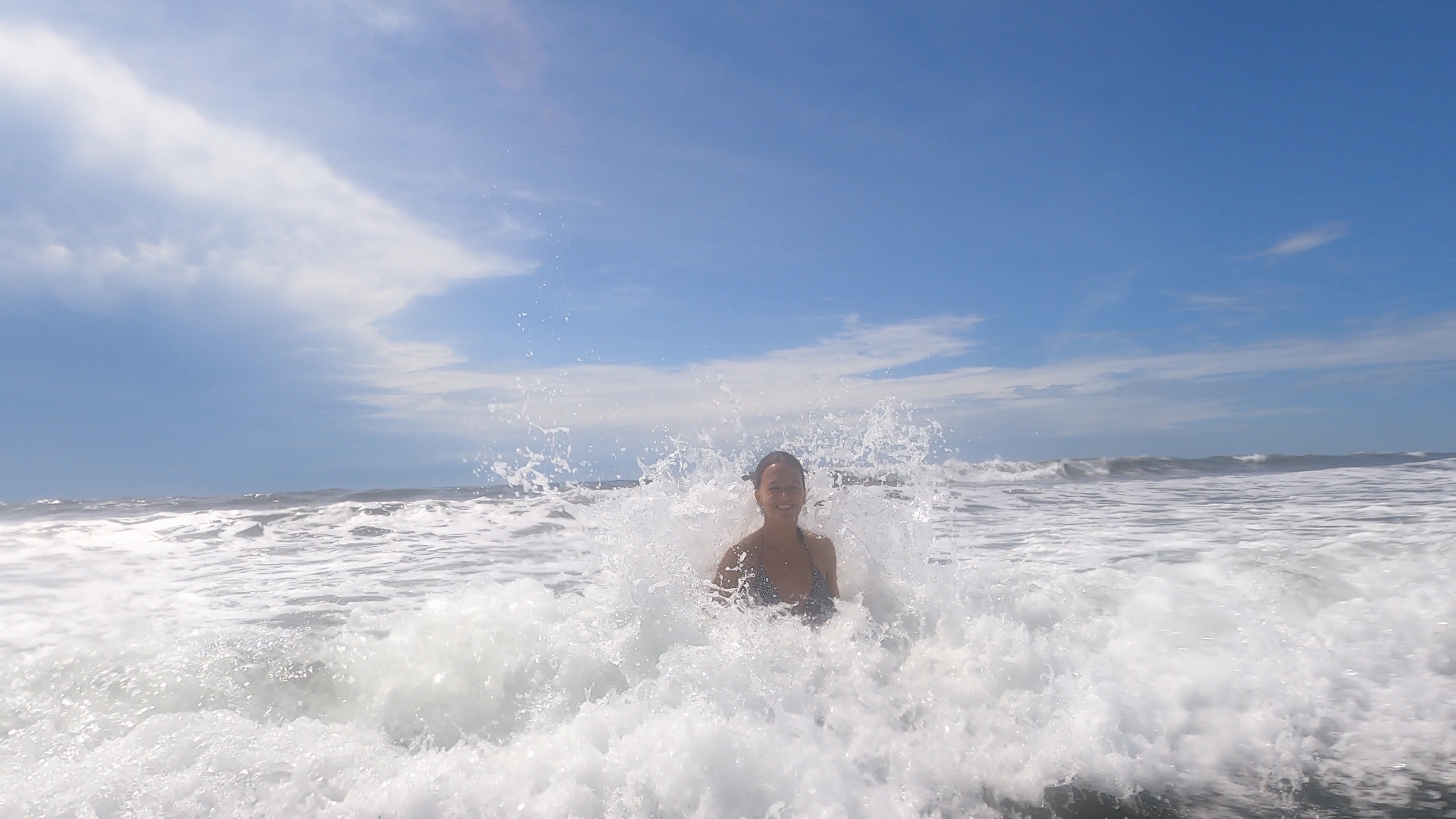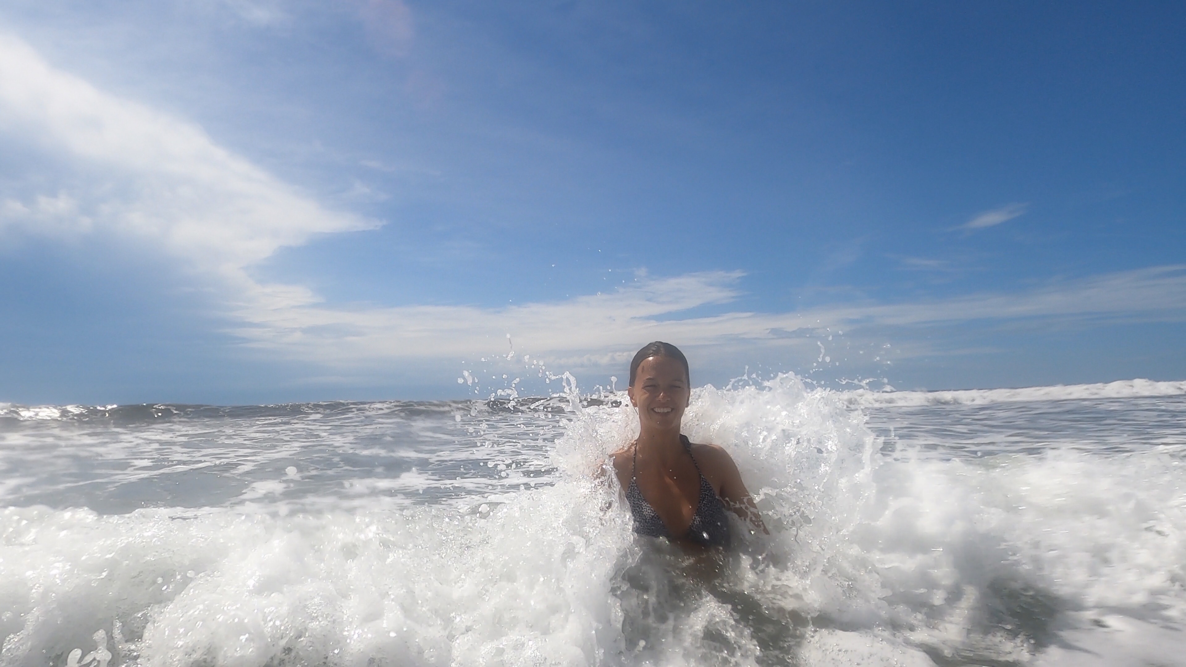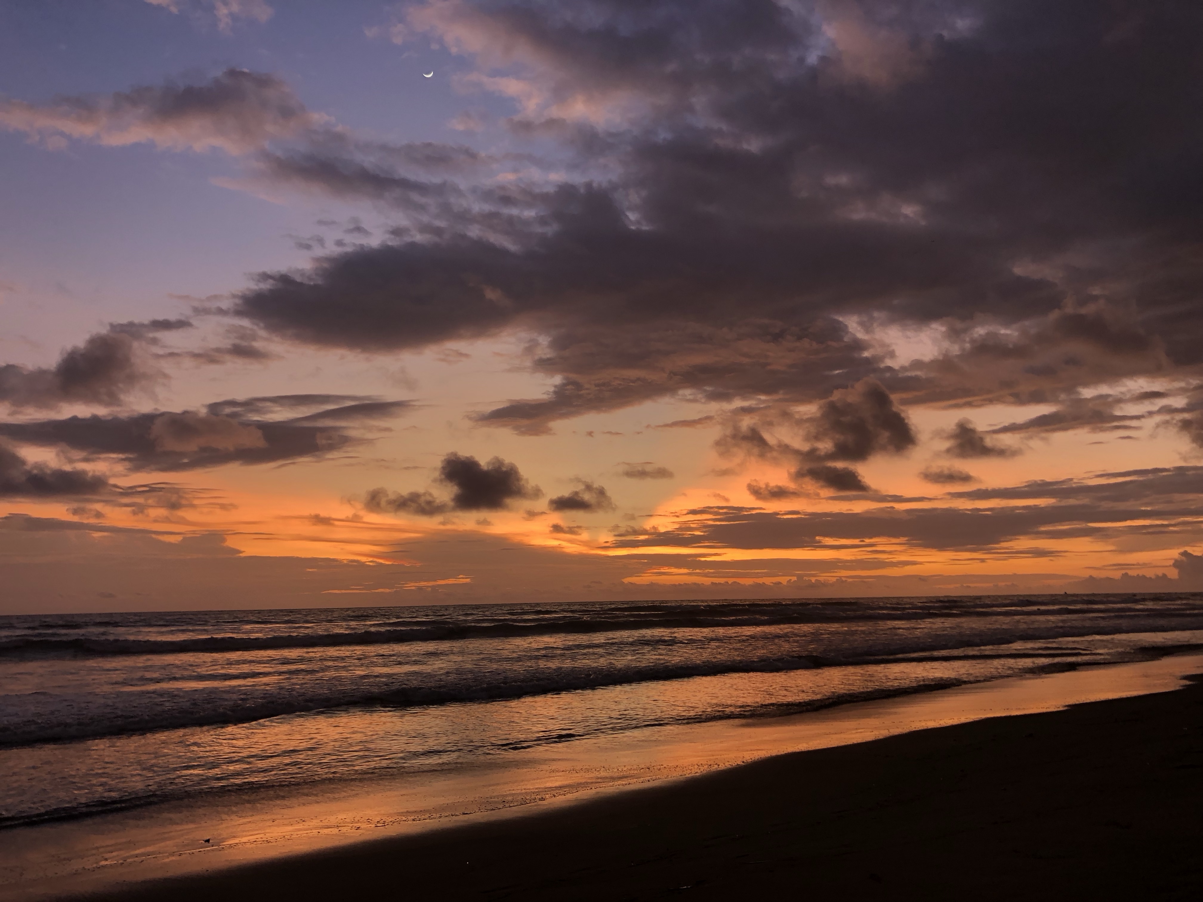 Hörbuch an, anschnallen und los geht die wilde Fahrt. Das Navi zeigte uns eine Fahrzeit von ungefähr fünf Stunden an und wir wussten aus der Erfahrung, dass man da meist noch etwas Zeit hinzuaddieren muss. Nach etwas mehr als vier Stunden Fahrt, über die kurvenreichen Bergstraßen Costa Ricas, freuten wir uns dann, als wir die ersten blauen Flecken am Himmel sahen und dann sogar kurz die Sonne. Dann kam das Meer wieder zum Vorschein und unsere Laune wurde schlagartig wieder so richtig gut. Wir erreichten schließlich unseren Schlafplatz. Ein kleiner gemütlicher Campingplatz, wo wir die kommenden zwei Nächte verbringen wollen. Nachdem wir uns ausgebreitet haben, ging es erstmal den nahegelegenen Strand erkunden.