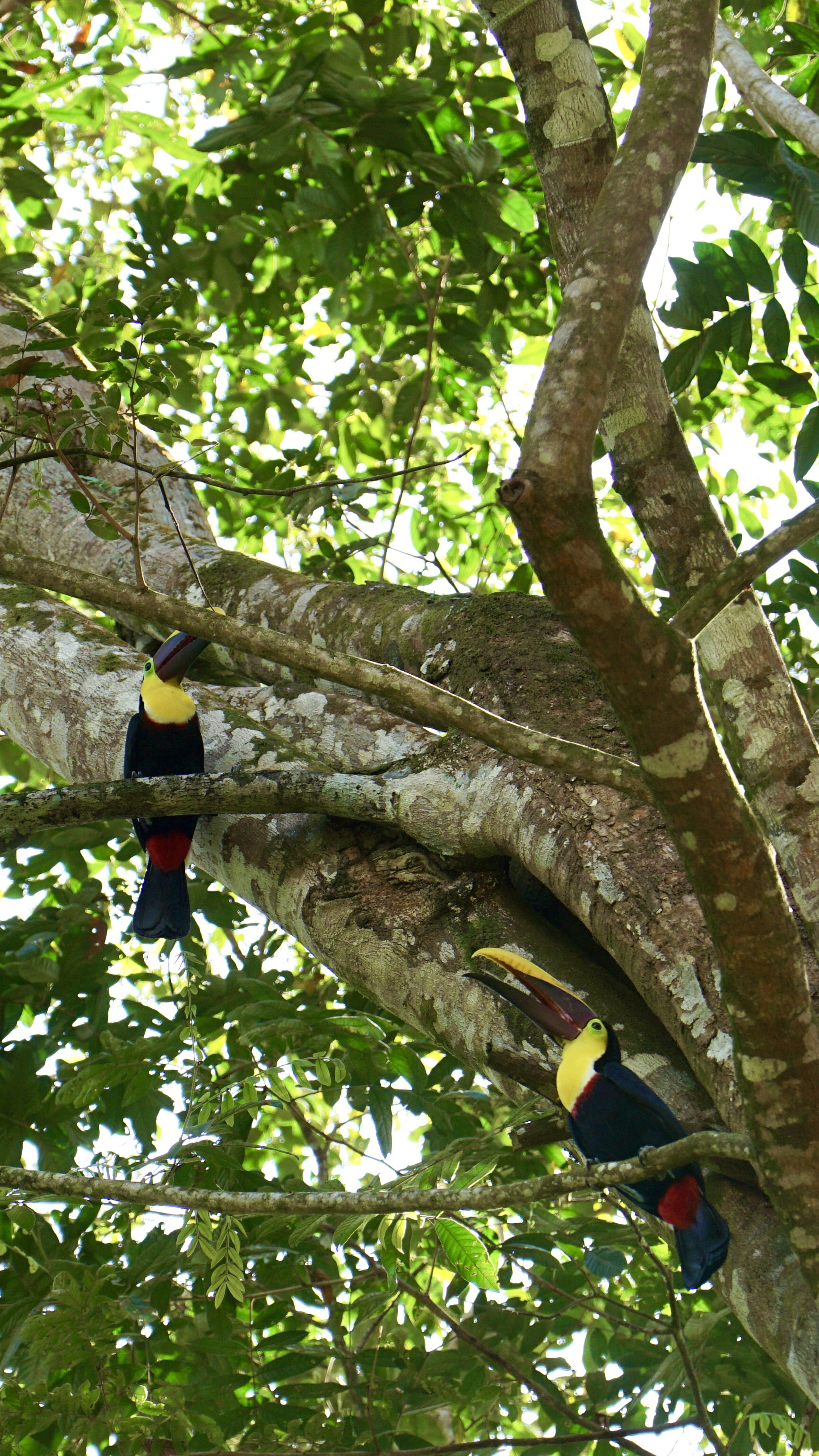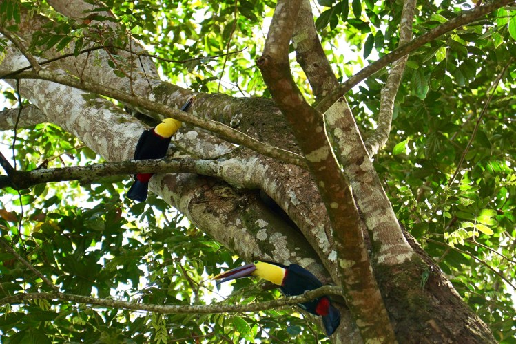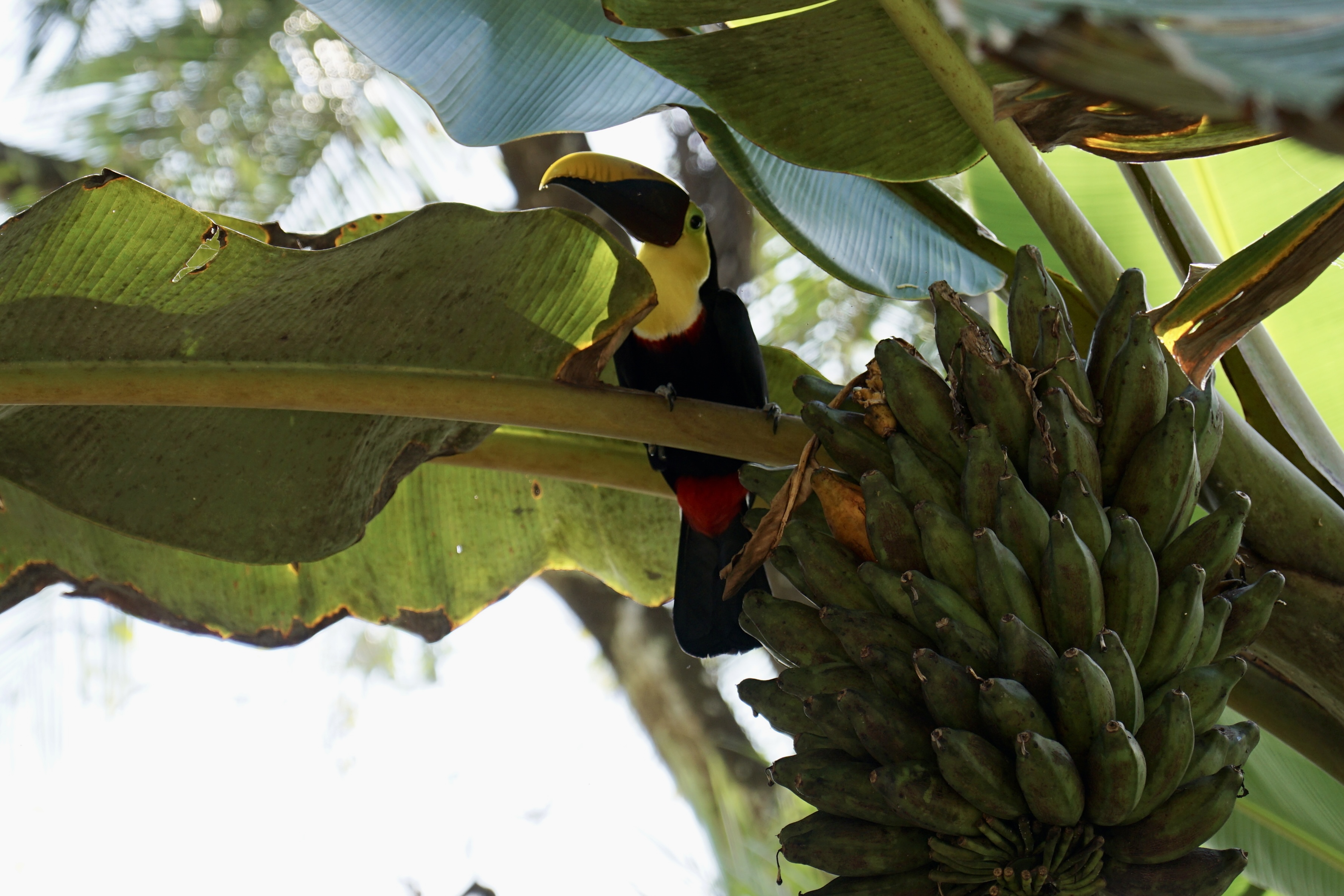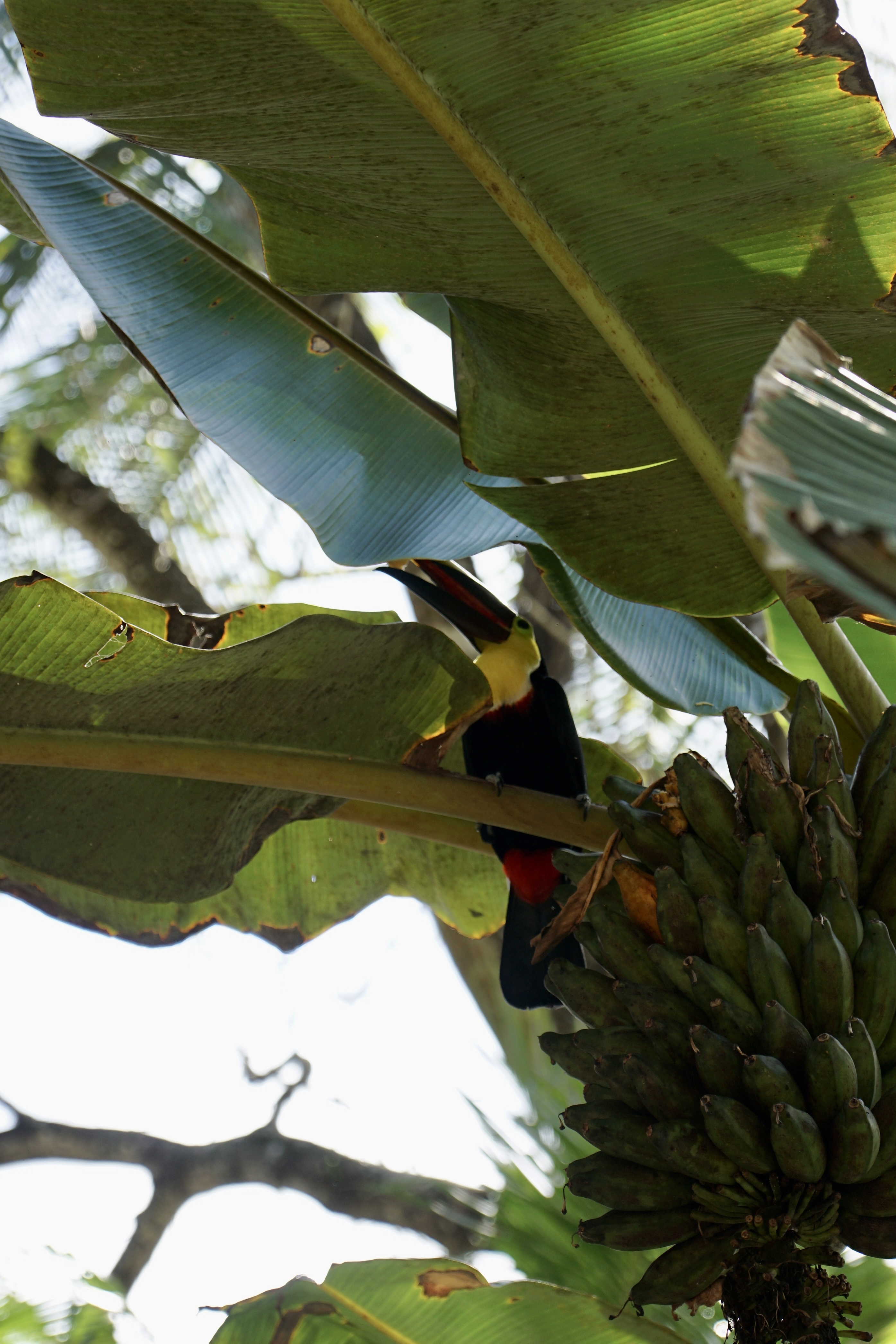 Während wir gemütlich unser Frühstück verzehrten, bemerkten wir, wie sich um einen Bananenbaum versammelt wurde und alle etwas weiter nach oben schauten. Hendrik ging hin und ihm wurde direkt der Tukan gezeigt, der sich gerade an den Bananen satt fraß. Schnell zückte Annelie die Kamera und wir konnten ein paar schöne Fotos von diesem tollen Tier machen. Wir hatten Tukane bisher nur bei Autofahrten im Flug gesehen, nun endlich vom Nahen und voller Pracht. Nach einiger Zeit wurde es dem Vogel dann zu viel Trubel und er flog weiter. Wir aßen auf und machten uns dann allmählich bereit für den Strand. Doch bevor wir zum Strand gingen, zeigten sich tatsächlich nochmal zwei Tukane, diesmal im Baum direkt über unserem Stellplatz. Fantastische Tiere!