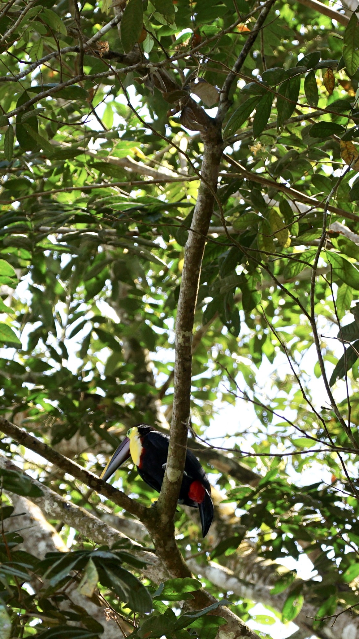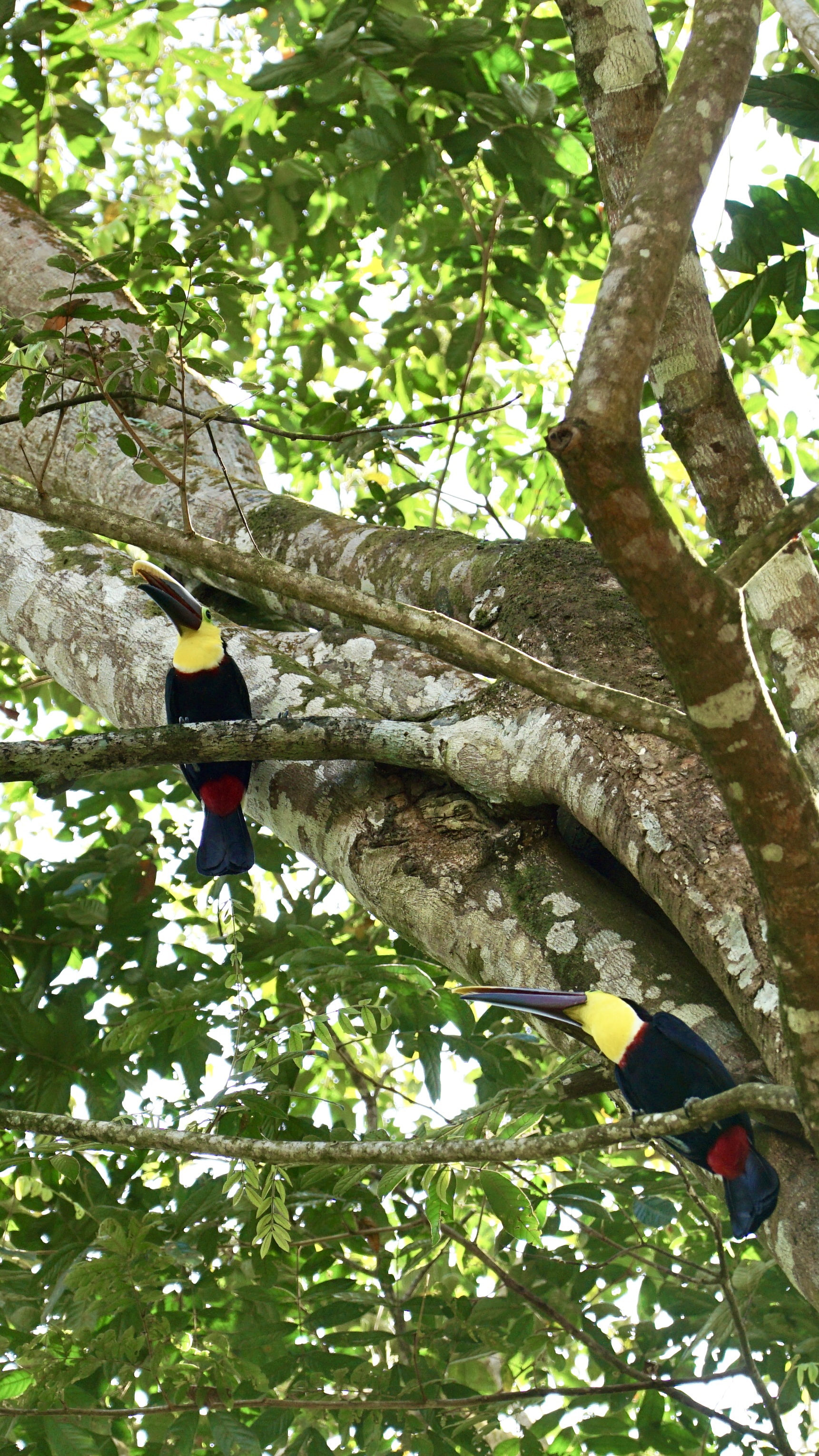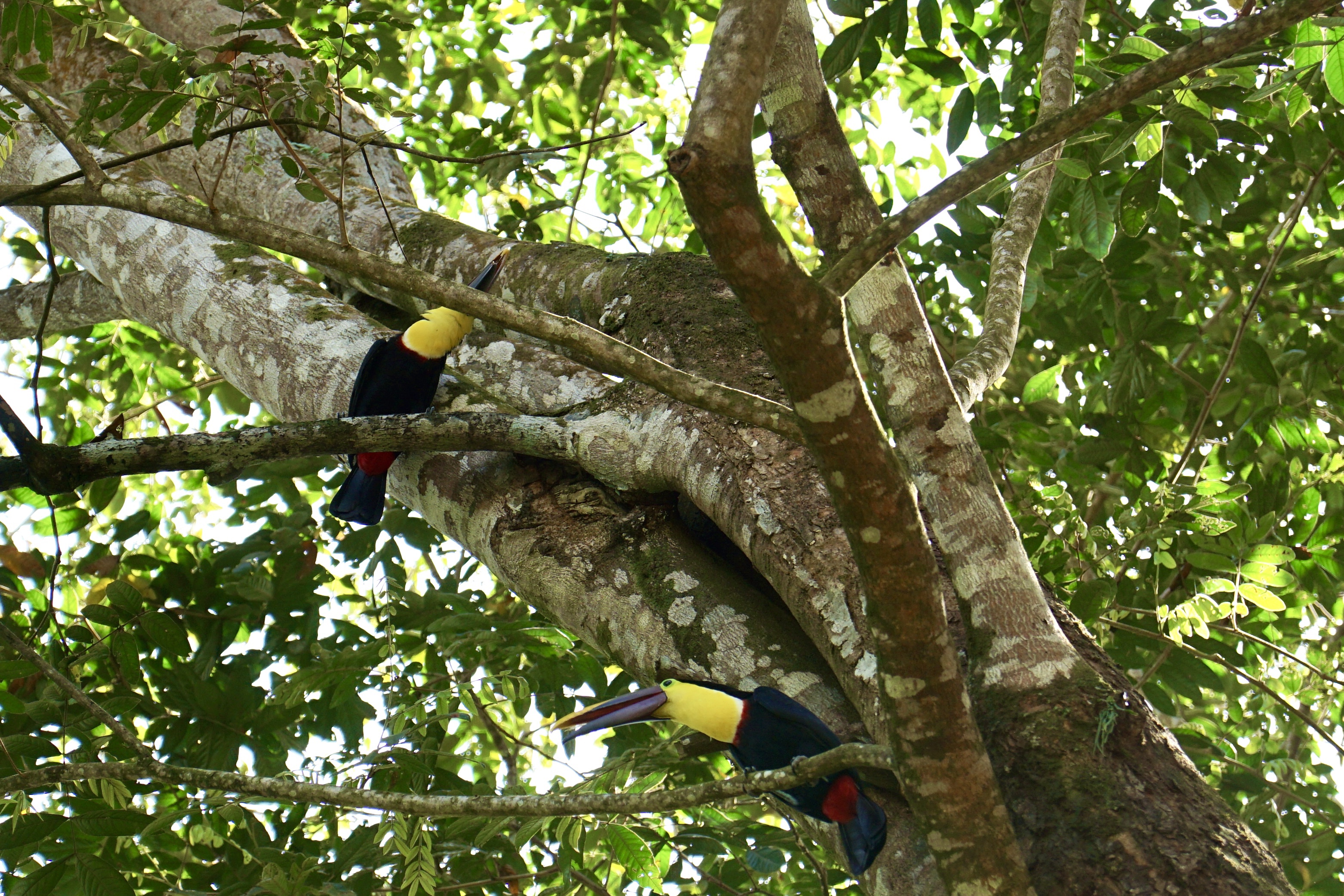 Während wir gemütlich unser Frühstück verzehrten, bemerkten wir, wie sich um einen Bananenbaum versammelt wurde und alle etwas weiter nach oben schauten. Hendrik ging hin und ihm wurde direkt der Tukan gezeigt, der sich gerade an den Bananen satt fraß. Schnell zückte Annelie die Kamera und wir konnten ein paar schöne Fotos von diesem tollen Tier machen. Wir hatten Tukane bisher nur bei Autofahrten im Flug gesehen, nun endlich vom Nahen und voller Pracht. Nach einiger Zeit wurde es dem Vogel dann zu viel Trubel und er flog weiter. Wir aßen auf und machten uns dann allmählich bereit für den Strand. Doch bevor wir zum Strand gingen, zeigten sich tatsächlich nochmal zwei Tukane, diesmal im Baum direkt über unserem Stellplatz. Fantastische Tiere!