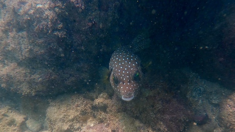 Die verschiedensten Kugelfische, Seeigel, Seesterne, Langusten und diverse kleinere und größere bunte Fische. Sogar eine Muräne konnte er erspähen. Die halbe Bucht erkundete er. Als er aus dem Wasser stieg, war die Landbrücke zum „Whale Tail“ schon vollständig unterwasser. Wir genossen noch die Sonne und den schönen Ausblick, ehe wir uns für den Heimweg entschieden. Buckelwale, die aktuell wieder beginnen in diesen Gefilden anzukommen, haben wir leider nicht gesehen. Interessanterweise wären es die Buckelwale, die aus Nordamerika kommen, also solche, die wir bei unserer Vancouver Island Überfahrt gesehen haben.