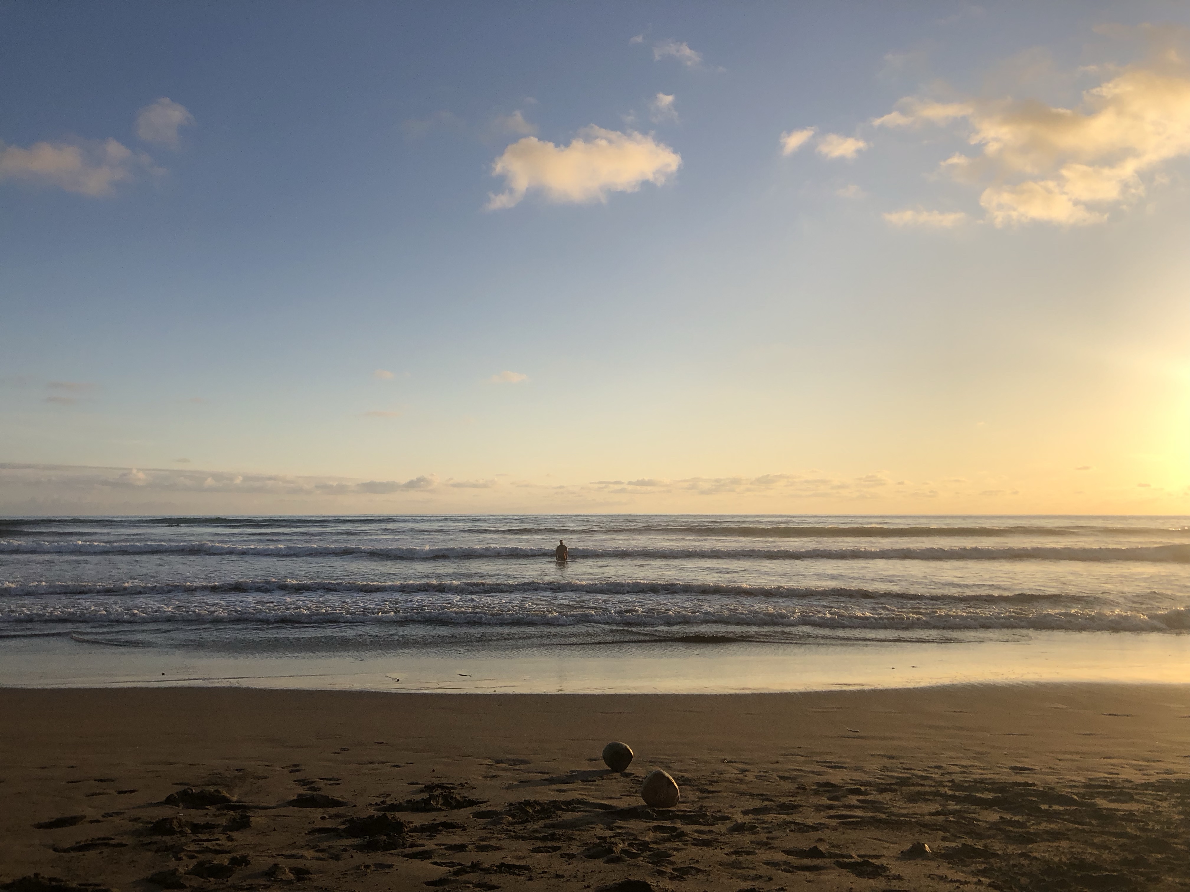 Wir gingen gemeinsam zum Strand und tobten in den Wellen. Das Wasser ist wirklich warm und selbst für Annelie kaum eine Abkühlung. Im Anschluss hat sich Hendrik unter die Palmen auf einen Campingstuhl gesetzt und im Schatten gelesen, während Annelie am Campingplatz am Laptop gearbeitet hat. Es war ein wirklich ruhiger und schöner Tag. Der Strand is herrlich und die Sonne tut gut. Am Abend kochten wir uns Nudeln und verbrachten den Sonnenuntergang wieder am Strand. Es ist hier wirklich sehr angenehm und schön.