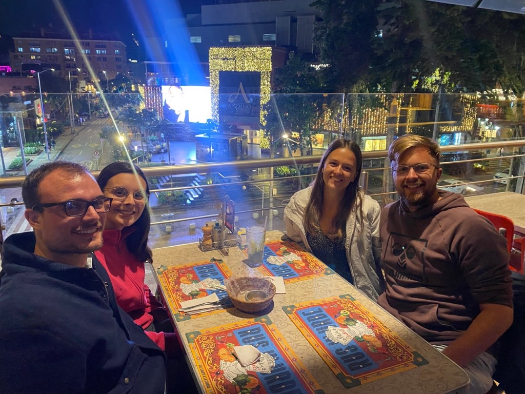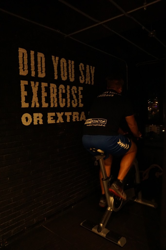 Leider fing es dann so richtig an zu regnen, wodurch uns die Lust auf Stadterkundung verging und wir weiterhin Zeit in die weitere Planung stecken konnten. Wir durften dann nochmal in die oberen Stockwerke, wo es etwas gemütlicher war und aßen dort dann auch noch ein frühes Abendbrot. Rodrigo meldete sich schließlich, dass es bei ihm nochmal deutlich später wird, da sie im Stau stecken. Wir entschieden uns also dafür noch eine Nacht im Hostel zu verbringen, damit es für alle entspannter ist. Nach dem Essen ging es runter in die Lobby, wo wir nochmal eine Nacht buchten. Wir bekamen das gleiche Zimmer. Für Hendrik ging es dann noch eine Runde ins kleine interne Fitnessstudio des Gebäudes. Annelie setzte diese Einheit wegen ihrer noch verheilenden Füße und der Medikamente aus.