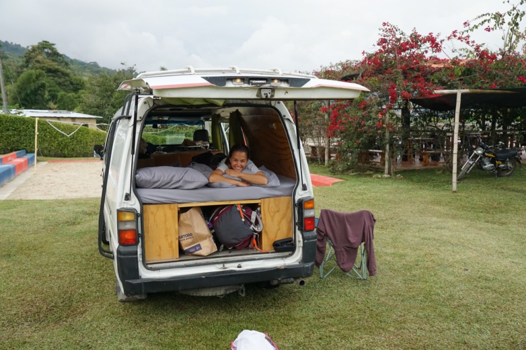 Zum Glück hatte Hendrik in Costa Rica schon einige Fahrpraxis sammeln können, so kam er doch recht schnell im wilden Verkehr zurecht. Über eine Art Stadtautobahn ging es für uns einmal quer durch die Außenbezirke der Stadt. Wir hätten gedacht, dass wir irgendwann mal auf ländliche, verlassene Straßen kommen. Doch da hatten wir uns geirrt. Der Verkehr war enorm, nicht zuletzt den vielen Baustellen geschuldet. Freie Straße hatten wir auf diesem Streckenabschnitt eigentlich nie und so schafften wir nur einen Bruchteil von dem, was wir uns eigentlich vorgenommen hatten. Der Fahrtag wurde mit einer besonderen Challenge abgeschlossen. Wir wollten auf einer Finca übernachten, welche ein wenig oberhalb der Hauptstraße lag. Im ersten Versuch scheiterten wir, da die Straße einfach in einer Baustelle endete. Der zweite Versuch sah vielversprechender aus. Mit Franky oder Jacky hätten wir über diese Fahrt wohl nicht mal mehr berichtet. Mit unserer Chivita war die buckelige, ausgewaschene Bergstraße aber eine wirkliche Herausforderung. Unsere Bodenweite ist quasi nicht vorhanden und auch ein Allradantrieb vermissen wir kläglich. Mit einigem Herzklopfen, Konzentration und Geschick manövrierte Hendrik uns sicher bis zur Finca hinauf. Hier erwartete uns eine nette Gastgeberin, auf dessen Wiese wir mit unserem Van parken durften. Ein erster Tag „on the road“ geht also zu Ende. Uns ist klar, das wird ein absolutes Abenteuer und genau das, was wir uns zum Abschluss dieser Reise gewünscht haben.