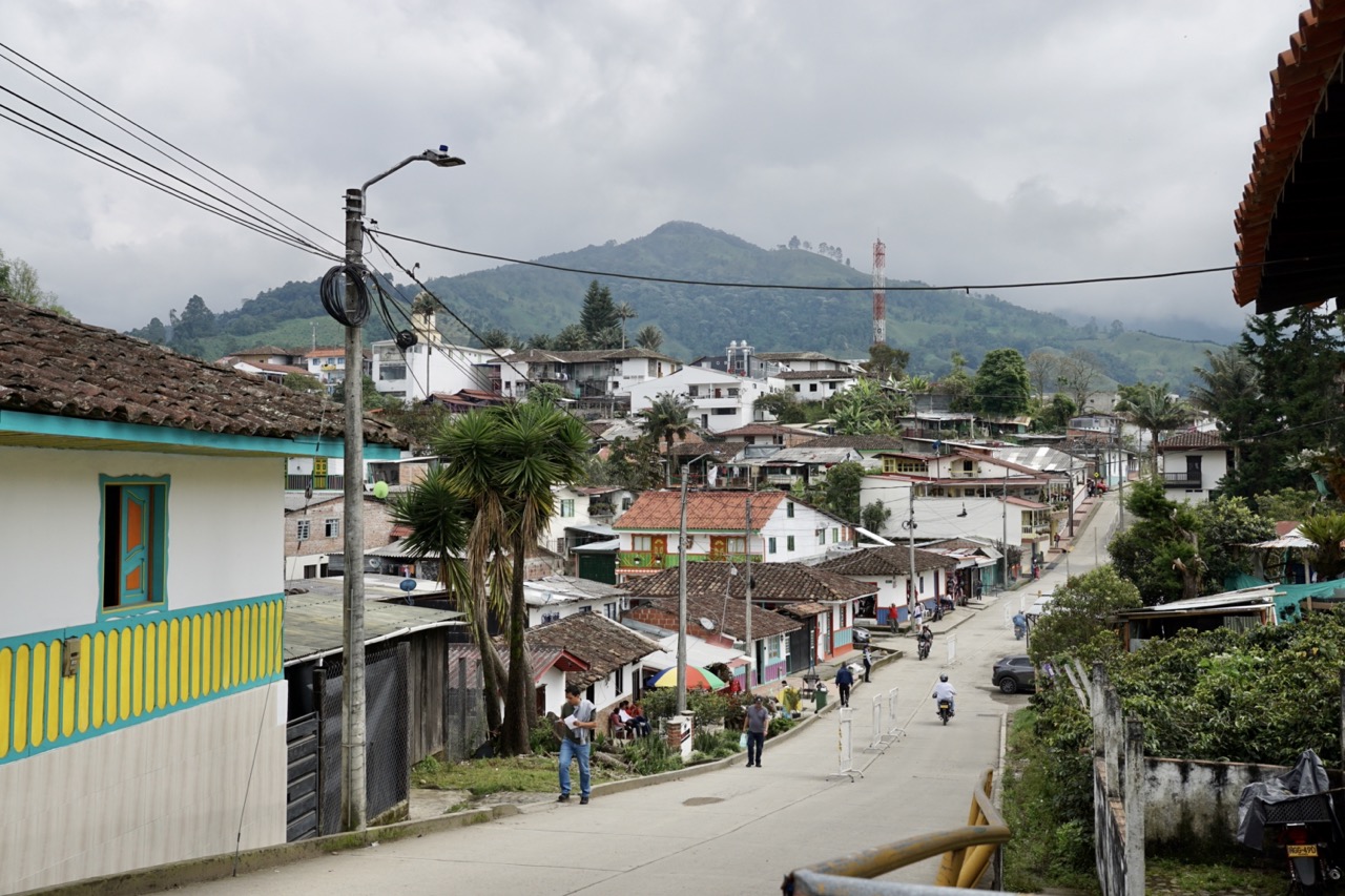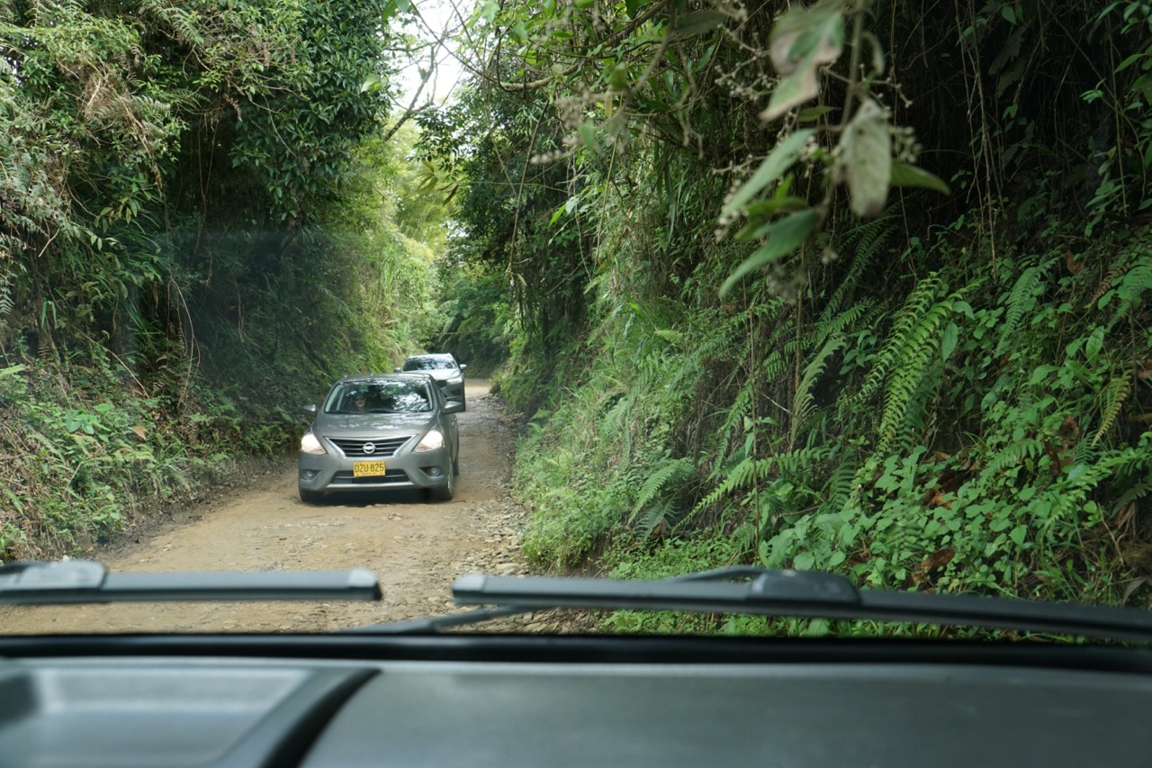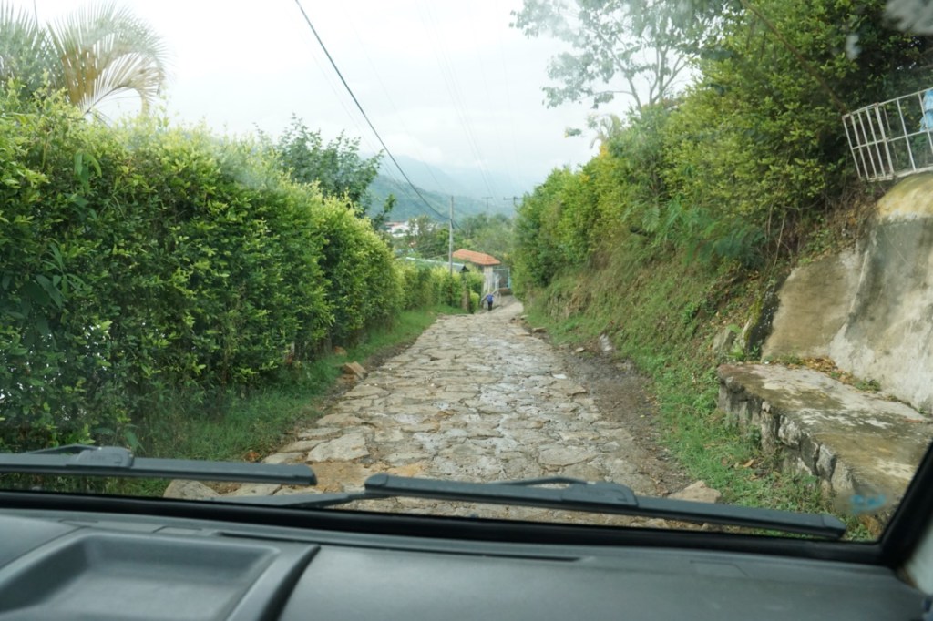 In dieser Nacht hatten wir uns aus Stühlen und Rucksäcken eine Bettverlängerung gebaut, wodurch wir schon ein wenig besser schlafen konnten, als in der letzten Nacht. Durch den vielen Regen war die Wiese, auf der wir standen, komplett aufgeweicht. Beim Ausparken fuhren wir uns erst mal fest. Zum Glück eilte uns der Fincabesitzer direkt zur Hilfe und gemeinsam schoben wir unseren Van aus dem Matsch. Merke für Annelie: bei so einer Aktion keine weißen Stoffschuhe anziehen.. Spätestens jetzt haben wir gelernt, dass Gelände- und Matschfahrten mit unserem Gefährt wirklich nicht möglich sind. Eigentlich war unser Plan, eine Fahrradtour durch das Cocora Tal zu machen. Da wir online bisher keine Antwort von dem Veranstalter bekommen hatten, fuhren wir mit dem Auto in den Ort Salento zum Büro des Tourenanbieters. Dieses war, wie zu erwarten, geschlossen. Durch super enge Straßen, voller Menschen und Autos schlängelten wir uns zu einem anderen Tourenanbieter. Dieser erklärte uns jedoch, dass wir uns einen Tag vorher hätten Anmelden müssen. Fahrradfahren wird also heute nichts. Nach ein wenig überlegen entschlossen wir uns dazu, dann wenigstens eine Kaffeetour zu machen. Schließlich sind wir ja extra in das sogenannte Kaffeedreieck gefahren.