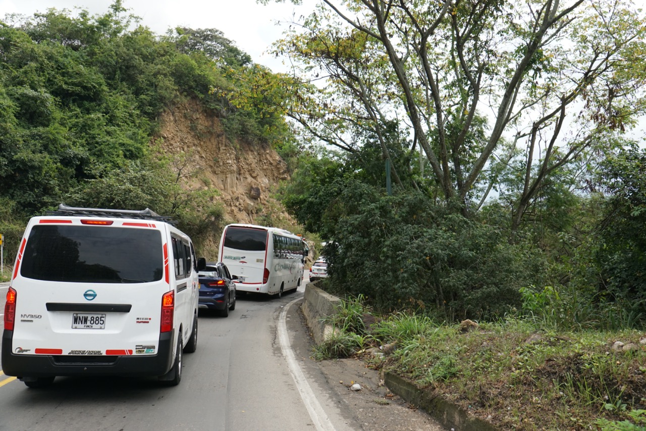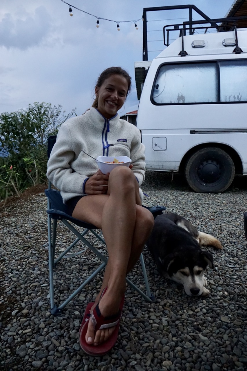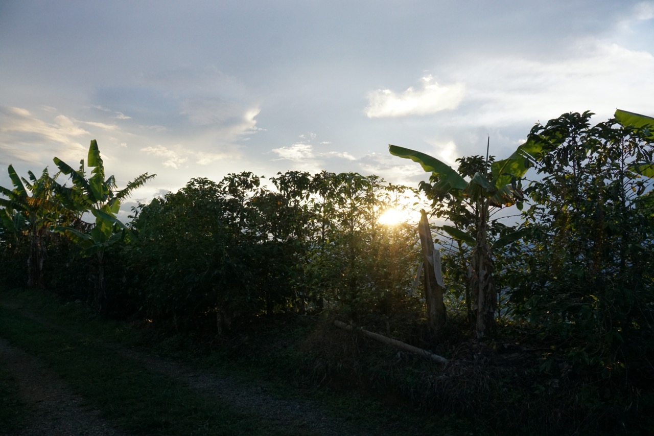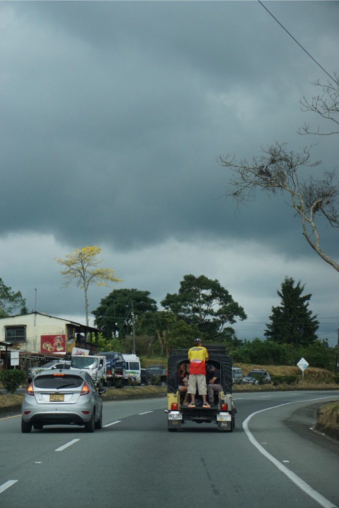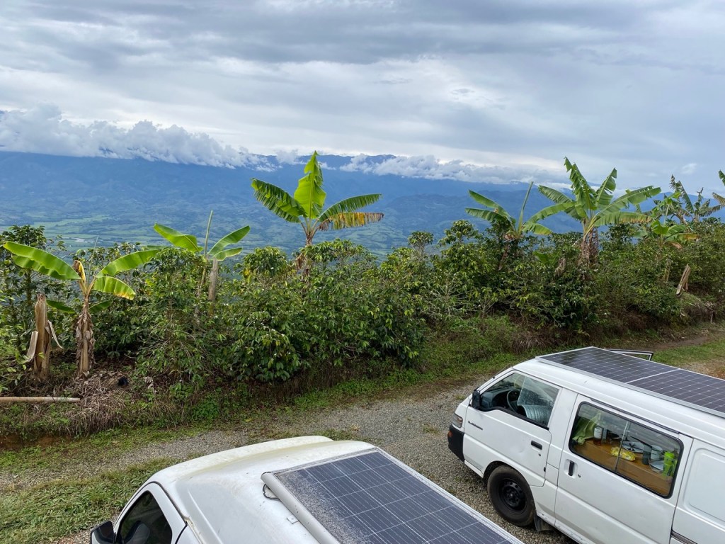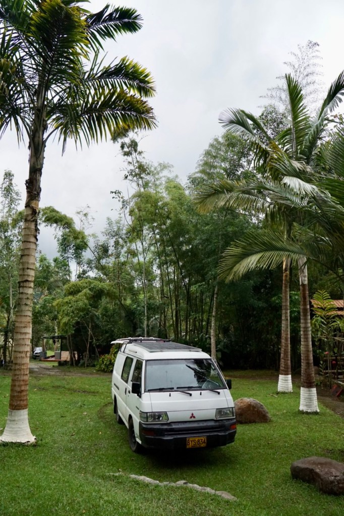 Wir waren vielleicht nicht die allerschnellsten, kamen jedoch ohne Probleme voran. Erst als wir die Zentralkordilleren auf 3200 m Höhe überquerten, kam auch unser Auto ein wenig an seine Grenzen. Zum ersten Mal seit langem fuhren wir mal wieder durch Nadelwälder. Ein schöner Kontrast zu all den Regenwäldern der letzten Wochen. Am Nachmittag erreichten wir unser Ziel. Ursprünglich hatten wir geplant, noch ein Stück weiter in einen kleinen Ort zu fahren, da hier jedoch absoluter Stillstand auf der Straße war, kehrten wir um und suchten uns einen Schlafplatz für die Nacht. Nachdem wir am ersten Campingplatz kein Glück hatten, fanden wir zum Glück gegenüber noch eine kleine Finca. Wir durften auf der Wiese zwischen Palmen und einem Flüsslein parken. Kurz nach unserer Ankunft setzte auch ein dicker Regen ein, sodass wir den restlichen Abend im Bett mit lesen und Serie gucken verbrachten. Auch wenn wir in der Trockenzeit unterwegs sind, regnete es fast die gesamte Nacht durch. Uns tat von der Fahrt alles weh. Ohne Dämpfer, Servo-Lenkung und so richtig gemütliche Sitze, spürt man einiges mehr als sonst, Die Serpentinen und vielen kleinen Unebenheiten spürt man bis in die Knochen.